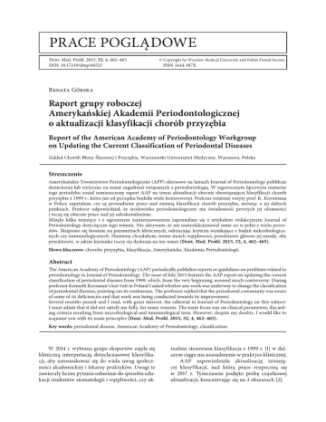 PRACE POGLĄDOWE Dent. Med. Probl. 2015, 52, 4, 462–465 DOI: 10.17219/dmp/60523 © Copyright by Wroclaw Medical University and Polish Dental Society ISSN 1644-387X Renata Górska Raport grupy roboczej Amerykańskiej Akademii Periodontologicznej o aktualizacji klasyfikacji chorób przyzębia Report of the American Academy of Periodontology Workgroup on Updating the Current Classification of Periodontal Diseases Zakład Chorób Błony Śluzowej i Przyzębia, Warszawski Uniwersytet Medyczny, Warszawa, Polska Streszczenie Amerykańskie Towarzystwo Periodontologiczne (APP) okresowo na łamach Journal of Periodontology publikuje doniesienia lub wytyczne na temat zagadnień związanych z periodontologią. W tegorocznym lipcowym numerze tego periodyku został zamieszczony raport AAP na temat aktualizacji obecnie obowiązującej klasyfikacji chorób przyzębia z 1999 r., która już od początku budziła wiele kontrowersji. Podczas ostatniej wizyty prof. K. Kornmana w Polsce zapytałam, czy są prowadzone prace nad zmianą klasyfikacji chorób przyzębia, mówiąc o jej słabych punktach. Profesor odpowiedział, że środowisko periodontologiczne ma świadomość pewnych jej ułomności i toczą się obecnie prace nad jej udoskonaleniem. Minęło kilka miesięcy i z ogromnym zainteresowaniem zapoznałam się z artykułem redakcyjnym Journal of Periodontology dotyczącym tego tematu. Nie ukrywam, że nie usatysfakcjonował mnie on w pełni z wielu powodów. Skupiono się bowiem na parametrach klinicznych, odrzucając kryteria wynikające z badań mikrobiologicznych czy immunologicznych. Niemniej chciałabym, mimo moich wątpliwości, przedstawić główne jej zasady, aby przedstawić, w jakim kierunku toczy się dyskusja na ten temat (Dent. Med. Probl. 2015, 52, 4, 462–465). Słowa kluczowe: choroby przyzębia, klasyfikacja, Amerykańska Akademia Periodontologii. Abstract The American Academy of Periodontology (AAP) periodically publishes reports or guidelines on problems related to periodontology in Journal of Periodontology. The issue of July 2015 features the AAP report on updating the current classification of periodontal diseases from 1999, which, from the very beginning, aroused much controversy. During professor Kenneth Kornman’s last visit in Poland I asked whether any work was underway to change the classification of periodontal diseases, pointing out its weaknesses. The professor replied that the periodontal community was aware of some of its deficiencies and that work was being conducted towards its improvement. Several months passed and I read, with great interest, the editorial in Journal of Periodontology on this subject. I must admit that it did not satisfy me fully, for many reasons. The main focus was on clinical parameters, discarding criteria resulting from microbiological and immunological tests. However, despite my doubts, I would like to acquaint you with its main principles (Dent. Med. Probl. 2015, 52, 4, 462–465). Key words: periodontal disease, American Academy of Periodontology, classification. W 2014 r. wybrana grupa ekspertów zajęła się kliniczną interpretacją dotychczasowej klasyfikacji, aby ustosunkować się do wielu uwag społeczności akademickiej i lekarzy praktyków. Uwagi te zawierały liczne pytania odnośnie do sposobu edukacji studentów stomatologii i wątpliwości, czy ak- tualnie stosowana klasyfikacja z 1999 r. [1] w dalszym ciągu ma uzasadnienie w praktyce klinicznej. AAP zapowiedziała aktualizację istniejącej klasyfikacji, nad którą prace rozpoczną się w 2017 r. Tymczasem podjęto próbę cząstkowej aktualizacji, koncentrując się na 3 obszarach [2]: 463 Klasyfikacja chorób przyzębia – zastosowanie CAL w diagnostyce zapalenia przyzębia, – przewlekłe versus agresywne zapalenie przyzębia, – zlokalizowane versus uogólnione zapalenie przyzębia. Zastosowanie CAL w diagnostyce zapalenia przyzębia Zapalenie przyzębia jest chorobą infekcyjną tkanek otaczających ząb, w wyniku której dochodzi do postępującej utraty położenia klinicznego przyczepu (clinical attachment loss, CAL) oraz utraty kości (bone loss, BL). Cechą jej jest obecność kieszonek przyzębnych i/lub recesji dziąseł. Stopień zaawansowania choroby jest oparty w dalszym ciągu na ocenie klinicznego położenia przyczepu (CAL) mimo licznych trudności i czasochłonności w jego określeniu. Zdarza się, że pomiar może być obarczony błędem, szczególnie wtedy, kiedy połączenie szkliwno-cementowe jest niewidoczne lub słabo wyczuwalne. Zapalenie przyzębia można scharakteryzować pod względem rozległości i ciężkości. Stopień zaawansowania zapalenia przyzębia określa się na podstawie klinicznej utraty przyczepu (CAL), głębokości kieszonek (pocket depth, PD), krwawienia przy zgłębnikowaniu (bleeding on probing, BOP) i utraty kości (BL). Zgodnie z tymi kryteriami pacjent ma zapalenie przyzębia, gdy stwierdzono obecność jednego lub więcej miejsc krwawiących (BOP), na zdjęciu rtg występują ubytki kostne (BL) oraz jest rejestrowana zwiększona głębokość kieszonek (PD) lub utrata położenia klinicznego przyczepu (CAL). Autorzy publikacji [2] przedstawili w postaci tabeli parametry określające stopień zaawansowania choroby od lekkiego, poprzez umiarkowane do ciężkiego zapalenia przyzębia (tabela 1). Szczególną grupę stanowią pacjenci z recesjami dziąseł lub po przebytym leczeniu periodontologicznym w fazie leczenia podtrzymującego. U tych pacjentów może występować utrata klinicznego położenia przyczepu, jeśli jednak kieszonki nie przekraczają 3 mm i nie ma oznak stanu zapalnego, są klasyfikowani jako zdrowi ze zredukowanym przyzębiem. Jeśli dodatkowo występuje stan zapalny, lecz PD nie przekracza 3 mm, to stan ten diagnozuje się jako zapalenie dziąseł (gingivitis) przy zredukowanym przyzębiu. Obecność kieszonek > 3 mm wraz z utratą klinicznego położenia przyczepu (CAL) oraz stanu zapalneg