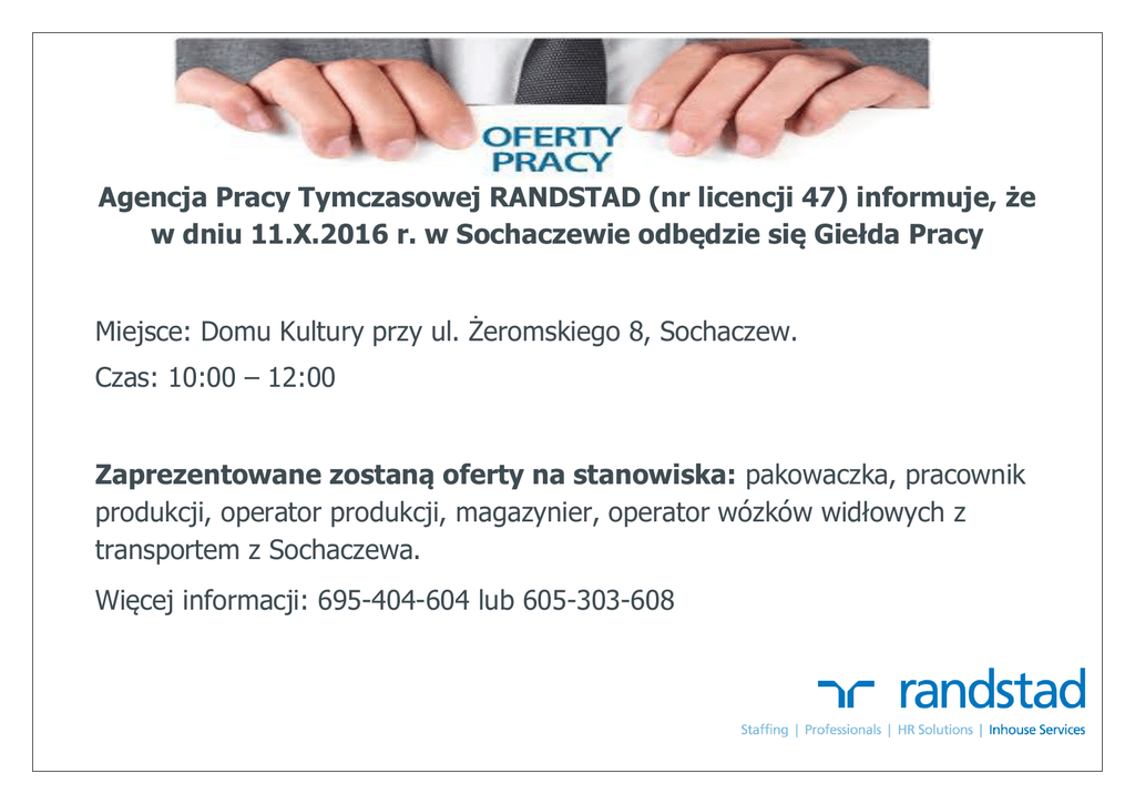 Agencja Pracy Tymczasowej RANDSTAD (nr licencji 47) informuje, że w dniu 11.X.2016 r. w Sochaczewie odbędzie się Giełda Pracy Miejsce: Domu Kultury przy ul. Żeromskiego 8, Sochaczew. Czas: 10:00 – 12:00 Zaprezentowane zostaną oferty na stanowiska: pakowaczka, pracownik produkcji, operator produkcji, magazynier, operator wózków widłowych z transportem z Sochaczewa. Więcej informacji: 695-404-604 lub 605-303-608