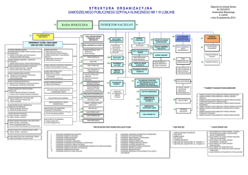 Załącznik do Uchwały Senatu Nr CXXV/2013 Uniwersytetu Medycznego w Lublinie z dnia 30 października 2013r. STRUKTURA ORGANIZACYJNA SAMODZIELNEGO PUBLICZNEGO SZPITALA KLINICZNEGO NR 1 W LUBLINIE RS DL Z-CA DYREKTORA DS. MEDYCZNYCH MS KIEROWNICY KLINIK I ZAKŁADÓW ORDYNATORZY ODDZIAŁÓW II KLINIKA CHIRURGII OGÓLNEJ, GASTROENTEROLOGICZNEJ I NOWOTWORÓW UKŁADU POKARMOWEGO 1. Oddział Chirurgii Ogólnej, Gastroenterologicznej i Nowotworów Układu Pokarmowego KLINIKA CHIRURGII URAZOWEJ I MEDYCYNY RATUNKOWEJ 1. Oddział Chirurgii Urazowej i ObraŜeń Wielonarządowych KLINIKA CHIRURGII NACZYNIOWEJ I ANGIOLOGII 1. Oddział Chirurgii Naczyniowej i Angiologii - Pracownia USG Chirurgii Naczyniowej KLINIKA PSYCHIATRII 1. Oddział Ogólnopsychiatryczny 2. Oddział Psychiatrii dla Dzieci i MłodzieŜy 3. Oddział Leczenia Nerwic i Terapii Zaburzeń OdŜywiania 4. Oddział Sądowo-Psychiatryczny 5. Oddział Dzienny Nerwicowy KLINIKA CHIRURGII ONKOLOGICZNEJ 1. Oddział Chirurgii Onkologicznej i Chemioterapii 2. Oddział Dzienny Chemioterapii - Pracownia Brachyterapii KLINIKA CHORÓB WEWNĘTRZNYCH 1. Oddział Chorób Wewnętrznych, Intensywnego Nadzoru Kardiologicznego, Diabetologii, Endokrynologii KLINIKA CHORÓB ZAKAŹNYCH 1. Oddział Chorób Zakaźnych KLINIKA POŁOśNICTWA I PATOLOGII CIĄśY 1. Oddział PołoŜnictwa i Patologii CiąŜy 2. Odział Noworodków KLINIKA DERMATOLOGII, WENEROLOGII I DERMATOLOGII DZIECIĘCEJ 1. Oddział Dermatologii i Wenerologii 2. Oddział Dermatologii Dziecięcej KLINIKA OKULISTYKI OGÓLNEJ 1.Oddział Okulistyki - Pododdział A 2. Oddział Okulistyki Dziecięcej KLINIKA CHIRURGII SIATKÓWKI I CIAŁA SZKLISTEGO 1. Oddział Okulistyki - Pododdział B - Pracownia Angiografii Narządu Wzroku - Pracownia Badań Elektrofizjologicznych Narządu Wzroku LD DZIAŁ KONTRAKTOWANIA I SPRZEDAśY USŁUG MEDYCZNYCH DZIAŁ DOKUMENTACJI CHORYCH BANK KRWI LO BANK TKANEK OKA LL DZIAŁ DIAGNOSTYKI LABORATORYJNEJ ZAKŁAD DIAGNOSTYKI MIKROBIOLOGICZNEJ LH PRACOWNIA PATOMORFOLOGII - PRAWNY BHP ZAKŁAD MEDYCYNY RODZINNEJ 1. Poradnia Lekarza POZ 2. Poradnia Pielęgniarki POZ DZIAŁ DS. ZAMÓWIEŃ PUBLICZNYCH II KLINKA ANESTEZJOLOGII I INTENSYWNEJ TERAPII 1. Oddział Anestezjologii i Intensywnej Terapii DZIAŁ PLANOWANIA I ANALIZ EKONOMICZNYCH NP NACZELNA PIELĘGNIARKA PP Z-CA NACZELNEJ PIELĘGNIARKI Pielęgniarki Oddziałowe w Klinikach STANOWISKO DS. P.POś. OC LP PRZYKLINICZNA PRZYCHODNIA PEŁNOMOCNIK OCHRONY INSPEKTOR DS. OBRONNYCH I OBRONY CYWILNEJ IZBA PRZYJĘĆ ** BO BLOKI OPERACYJNE*** LE DZIAŁ EPIDEMIOLOGII LS DZIAŁ STERYLIZACJI PZ PEŁNOMOCNIK DYREKTORA Ds. ZINTEGROWANEGO SYSTEMU ZARZĄDZANIA JAKOŚCIĄ I ZARZĄDZANIA ŚRODOWISKOWEGO AW AUDYTOR WEWNĘTRZNY ABI ADMINISTRATOR BEZPIECZEŃSTWA INFORMACJI FK TK INSPEKTOR DS. GOSPODARKI LEKIEM 12. 13. 14. 15. 16. 17. 18. 19. 20. 21. 22. PORADNIA CHIRURGII SZCZĘKOWO-TWARZOWEJ PORADNIA PSYCHIATRYCZNA PORADNIA NADCIŚNIENIA TĘTNICZEGO PORADNIA ONKOLOGICZNA PORADNIA HEMATOONKOLOGII PORADNIA TRANSPLANTACJI SZPIKU PORADNIA CHORÓB ZAKAŹNYCH PORADNIA DIAGNOSTYCZNO-LECZNICZA PORADNIA NEUROLOGICZNA PORADNIA NEONATOLOGII PORADNIA ZDROWIA PSYCHICZNEGO DLA DZIECI I MŁODZIEśY Pielęgniarka Społeczna PS EZ DZIAŁ ZAOPATRZENIA 1. Sekcja ds. Zabezpieczenia Potrzeb Materiałowych 2. Sekcja Magazynowa Eś AZ DZIAŁ śYWIENIA ARCHIWUM ZAKŁADOWE DZIAŁ INFORMATYKI *PRZYKLINICZNA PRZYCHODNIA SPECJALISTYCZNA PORADNIA ENDOKRYNOLOGICZNA PORADNIA DIABETOLOGICZNA PORADNIA KARDIOLOGICZNA. PORADNIA CHIRURGICZNA PORADNIA CHIRURGII URAZOWEJ PORADNIA CHIRURGII NACZYNIOWEJ I ANGIOLOGII PORADNIA CHIRURGII ONKOLOGICZNEJ PORADNIA GINEKOLOGICZNA Z OŚRODKIEM DIAGNOSTYKI ONKOLOGICZNEJ PORADNIA GINEKOLOGICZNO-POŁOśNICZA PORADNIA DERMATOLOGICZNA PORADNIA OKULISTYCZNA OGÓLNA DZIAŁ ADMINISTRACYJNO EKSPLOATACYJNY 1. Sekcja Obsługi Gosp. 2. Sekcja Transportowa 3. Sekcja Techniczna 4. Sekcja Eksploatacyjna PRAWNYCH GABINETY DIAGNOSTYCZNOZABIEGOWE**** LI 1. Sekcja Księgowości i Rozliczeń Materiałowych 2. Sekcja Inwentaryzacji RP STANOWISKA RADCÓW KAPELAN SZPITALNY PO ZESPÓŁ DS. BADAŃ KLINICZNYCH BK EA KLINIKA DIAGNOSTYKI I MIKROCHIRURGII JASKRY 1. Oddział Okulistyki - Pododdział C 1. 2. 3. 4. 5. 6. 7. 8. 9. 10. 11. EE Z-CA DYREKTORA DS.EKONOMICZNO EKSPLOATACYJNYCH GK 1. Sekcja Organizacyjna 2. Sekcja Kancelaryjna SEKCJA BHP SPECJALISTYCZNA* ZAKŁAD RADIOLOGII ZABIEGOWEJ I DIAGNOSTYKI OBRAZOWEJ 1.Samodzielna Pracownia Diagnostyki Obrazowej 2. Pracownia Radiologii Zabiegowej EO INSPEKTOR OCHRONY RADIOLOGICZNEJ OP DZIAŁ ORGANIZACYJNO Pracownia Diagnostyki Mikologicznej i Chorób Przenoszonych Drogą Płciową ZAKŁAD DIAGNOSTYKI I TERAPII ENDOSKOPOWEJ OR Biuro Dyrekcji 1. Laboratorium Diagnostyki Analitycznej 2. Laboratorium Diagnostyki Molekularnej LM ASYSTENT DYREKTORA GŁÓWNY KSIĘGOWY APTEKA SZPITALNA LB SZPITALNY ODDZIAŁ ANESTEZJOLOGII I INTENSYWNEJ TERAPII ZAKŁAD RADIOLOGII LEKARSKIEJ AD DZIAŁ SPRAW PRACOWNICZYCH 1. Sekcja Spraw Pracowniczych 2. Stanowisko ds. socjalno-bytowych 3. Sekcja Płac 1. Sekcja Dokumentacji i Analiz Statystycznych 2. Sekcja Archiwizacji LA DN DE SP PPś KLINIKA CHIRURGII SZCZĘKOWO-TWARZOWEJ 1. Oddział Chirurgii Szczękowo-Twarzowej KLINIKA HEMATOONKOLOGII I TRANSPLANTACJI SZPIKU 1. Oddział Hematoonkologii, Transplantacji Szpiku i Chemioterapii 2. Bank Komórek Krwiotwórczych I KLINIKA GINEKOLOGII ONKOLOGICZNEJ I GINEKOLOGII 1. Oddział Ginekologii Onkologicznej i Ginekologii - Pracownia USG w Oddziale Ginekologii Onkologicznej DYREKTOR NACZELNY RADA SPOŁECZNA ****GABINETY DIAGNOSTYCZNO-ZABIEGOWE Ene 1. GABINET DIAGNOSTYCZNO-ZABIEGOWY PORADNI CHIRURGICZNEJ 2. GABINET DIAGNOSTYCZNO-ZABIEGOWY PORADNI CHIRURGII URAZOWEJ 3. GABINET DIAGNOSTYCZNO-ZABIEGOWY PORADNI GINEKOLOGICZNEJ Z OŚRODKIEM DIAGNOSTYKI ONKOLOGICZNEJ 4. GABINET DIAGNOSTYCZNO-ZABIEGOWY PORADNI GINEKOLOGICZNOPOŁOśNICZEJ 5. GABINET DIAGNOSTYCZNO-ZABIEGOWY PORADNI DERMATOLOGICZNEJ 6. GABINET DIAGNOSTYCZNO-ZABIEGOWY PORADNI OKULISTYCZNEJ OGÓLNEJ 7. GABINET 