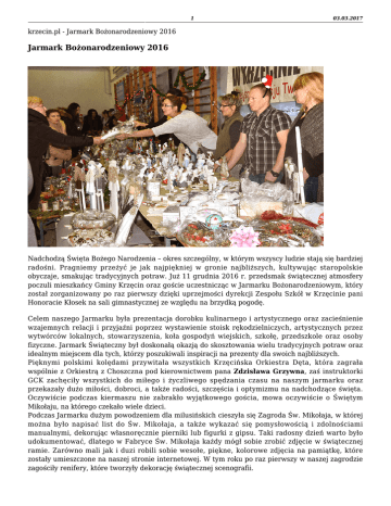 1 03.03.2017 krzecin.pl - Jarmark Bożonarodzeniowy 2016 Jarmark Bożonarodzeniowy 2016 Nadchodzą Święta Bożego Narodzenia – okres szczególny, w którym wszyscy ludzie stają się bardziej radośni. Pragniemy przeżyć je jak najpiękniej w gronie najbliższych, kultywując staropolskie obyczaje, smakując tradycyjnych potraw. Już 11 grudnia 2016 r. przedsmak świątecznej atmosfery poczuli mieszkańcy Gminy Krzęcin oraz goście uczestnicząc w Jarmarku Bożonarodzeniowym, który został zorganizowany po raz pierwszy dzięki uprzejmości dyrekcji Zespołu Szkół w Krzęcinie pani Honoracie Kłosek na sali gimnastycznej ze względu na brzydką pogodę. Celem naszego Jarmarku była prezentacja dorobku kulinarnego i artystycznego oraz zacieśnienie wzajemnych relacji i przyjaźni poprzez wystawienie stoisk rękodzielniczych, artystycznych przez wytwórców lokalnych, stowarzyszenia, koła gospodyń wiejskich, szkołę, przedszkole oraz osoby fizyczne. Jarmark Świąteczny był doskonałą okazją do skosztowania wielu tradycyjnych potraw oraz idealnym miejscem dla tych, którzy poszukiwali inspiracji na prezenty dla swoich najbliższych. Pięknymi polskimi kolędami przywitała wszystkich Krzęcińska Orkiestra Dęta, która zagrała wspólnie z Orkiestrą z Choszczna pod kierownictwem pana Zdzisława Grzywna, zaś instruktorki GCK zachęciły wszystkich do miłego i życzliwego spędzania czasu na naszym jarmarku oraz przekazały dużo miłości, dobroci, a także radości, szczęścia i optymizmu na nadchodzące święta. Oczywiście podczas kiermaszu nie zabrakło wyjątkowego gościa, mowa oczywiście o Świętym Mikołaju, na którego czekało wiele dzieci. Podczas Jarmarku dużym powodzeniem dla milusińskich cieszyła się Zagroda Św. Mikołaja, w której można było napisać list do Św. Mikołaja, a także wykazać się pomysłowością i zdolnościami manualnymi, dekorując własnoręcznie pierniki lub figurki z gipsu. Taki radosny dzień warto było udokumentować, dlatego w Fabryce Św. Mikołaja każdy mógł sobie zrobić zdjęcie w świątecznej ramie. Zarówno mali jak i duzi robili sobie wesołe, piękne, kolorowe zdjęcia na pamiątkę, które zostały umieszczone na naszej stronie internetowej. W tym roku po raz pierwszy w naszej zagrodzie zagościły renifery, które tworzyły dekorację świątecznej scenografii. 2 03.03.2017 Tradycją stało się, że gospodarz naszej gminy pan Bogdan Wojciech Brzustowicz wraz z małżonką przygotowali przepyszną zupę, a pani Dorota Głowacka domowy smalec, zaś pieniądze ze sprzedaży tych smakołyków zostaną przeznaczone na cel charytatywny. Podczas tegorocznego kiermaszu bożonarodzeniowego nastąpiło rozstrzygnięcie dwóch konkursów, które Gminne Centrum Kultury ogłosiło w listopadzie: „Najsmaczniejsze pierogi” oraz „Anioł Bożonarodzeniowy”, nad którymi czuwała komisja w składzie: pan Ireneusz Kręgowski, pani Urszula Wiąz oraz pani Grażyna Kaczmarek. Zapach pysznych pierogów unosił się na sali, a wszystko to za sprawą konkursu na „Najsmaczniejsze pierogi”, do którego zgłosiło się aż pięć podmiotów: 1. Stowarzyszenie Klubu Seniora Granowiacy 2. Ewa Rutkowska z Granowa 3. Mamuśki z Żeńska 4. Koło Gospodyń Wiejskich w Krzęcinie 5. Stowarzyszenie Aktywny Senior z Chłopowa Wszyscy przybyli mogli skosztować i zakupić ulubione pierogi, a ponadto oddać głos na najsmaczniejsze pierogi. Oprócz głosów publiczności, jury nadało własny tytuł Pierogowego Mistrza, wyłaniając trzech zwycięzców: I miejsce otrzymała pani Ewa Rutkowska z Granowa, II miejsce otrzymało Stowarzyszenie Aktywny Senior z Chłopowa, III miejsce otrzymało Stowarzyszenie Klub Seniora Granowiacy. Tytuł Pierogowego Mistrza Publiczności trafił do drużyny „Mamuśki” z Żeńska. Zwycięzcy otrzymali bony pieniężne, które wręczył przewodniczący Rady Gminy Krzęcin pan Artur Konopelski oraz przewodnicząca Gminnej Komisji Rozwiązywania Problemów Alkoholowych pani Kazimiera Prokopiak. Mieszkańcy gminy mogli podziwiać piękną anielską wystawę, składającą się z trzydziestu pięciu wyjątkowych prac konkursowych - Aniołów Bożonarodzeniowych. Pomysłowość prac przerosła nasze oczekiwania - wiemy, że wymagały od autorów dużo pracy. W kategorii przedszkole zwyciężył Oskar Donder, wyróżnienia otrzymali Maciej Nowak i Antoś Cepak. W kategorii Szkoła Podstawowa kl. I-III zwyciężył Alex Bartlewski wyróżnienia otrzymali Kinga Grudzińska i Maja Banasiak. W kategorii Szkoła Podstawowa kl. IV-VI zwyciężyła Katarzyna Komorek W kategorii gimnazjum zwyciężyła Aleksandra Rutkowska W kategorii dorośli zwyciężyła pani Barbara Tuka z Żeńska, wyróżnienia otrzymały pani Olga Wysocka i pani Wiesława Gruszczyńska. Pamiętając o tym, że jarmark to radosny czas, przyczyniliśmy się do podtrzymania tej pięknej tradycji z kolędami i pastorałkami przygotowując część artystyczną, w której wystąpili nasi zdolni lokalni artyści. Na scenie nie zabrakło najmłodszych artystów z Gminy Krzęcin z Oddziału Przedszkolnego, tancerzy z Zespołu Tańca Współczesnego SWING oraz dzieci z placówek kultury. Ponadto w świąteczny klimat wprowadził wszystkich Chór Gminny Con Passione, który powstał w tym roku pod przewodnictwem pani Sandry Żuk i pana Pawła Lemiesiewicza. Po części artystycznej wspólne zabawy, wspólne kolędowanie, tańce i śpiew zapewnił nam przy muzyce na żywo wodzirej Krzysztof z Wągrowca. Ponadto podczas jarmarku nastąpiło uroczyste wręczenie nagród dla dzieci, których prace reprezentowały Gminne Centrum Kultury w Krzęcinie w konkursie plastycznym „Pomorze Zachodnie z (e)misją” ogłoszonym przez Ośrodek Kultury w Mirosławcu. Miło nam było poinformować, iż II 3 03.03.2017 miejsce zajęła Maja Wysocka z Krzęcina, a III miejsce zajął Igor Kucharczyk z Rakowa. Gminne Centrum Kultury jak organizator Jarmarku Świąt