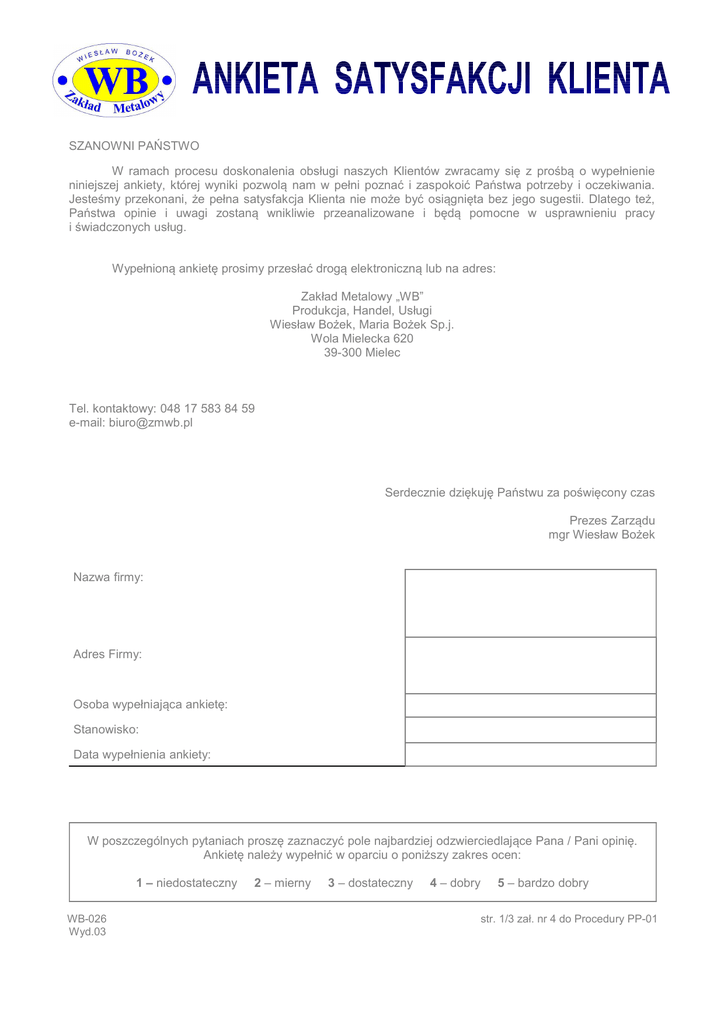 SZANOWNI PAŃSTWO W ramach procesu doskonalenia obsługi naszych Klientów zwracamy się z prośbą o wypełnienie niniejszej ankiety, której wyniki pozwolą nam w pełni poznać i zaspokoić Państwa potrzeby i oczekiwania. Jesteśmy przekonani, że pełna satysfakcja Klienta nie może być osiągnięta bez jego sugestii. Dlatego też, Państwa opinie i uwagi zostaną wnikliwie przeanalizowane i będą pomocne w usprawnieniu pracy i świadczonych usług. Wypełnioną ankietę prosimy przesłać drogą elektroniczną lub na adres: Zakład Metalowy „WB” Produkcja, Handel, Usługi Wiesław Bożek, Maria Bożek Sp.j. Wola Mielecka 620 39-300 Mielec Tel. kontaktowy: 048 17 583 84 59 e-mail: [email protected] Serdecznie dziękuję Państwu za poświęcony czas Prezes Zarządu mgr Wiesław Bożek Nazwa firmy: Adres Firmy: Osoba wypełniająca ankietę: Stanowisko: Data wypełnienia ankiety: W poszczególnych pytaniach proszę zaznaczyć pole najbardziej odzwierciedlające Pana / Pani opinię. Ankietę należy wypełnić w oparciu o poniższy zakres ocen: 1 – niedostateczny WB-026 Wyd.03 2 – mierny 3 – dostateczny 4 – dobry 5 – bardzo dobry str. 1/3 zał. nr 4 do Procedury PP-01 K OM U NI K AC J A Jak ocenia Pan / Pani poziom kompetencji personelu „WB”? 1 2 3 4 5 Jak ocenia Pan / Pani kulturę pracy i dyspozycyjność pracowników biurowych „WB”? 1 2 3 4 5 Jak ocenia Pan / Pani kulturę pracy i dyspozycyjność kierowców, spedytorów „WB”? 1 2 3 4 5 Jak ocenia Pan / Pani szybkość uzyskiwania odpowiedzi na złożone zapytania ofertowe? 1 2 3 4 5 Jak ocenia Pan / Pani dotychczasowy przepływ informacji w zakresie uzgodnień technicznych i organizacyjnych? 1 2 RE AL I Z AC J A 3 4 UM O W Y 5 / Z AM Ó W I EN I A Jak ocenia Pan / Pani jakość wyrobów wykonywanych przez “WB”? 1 2 3 4 5 Jak ocenia Pan / Pani terminowość realizacji zamówień? 1 2 3 4 5 Jak ocenia Pan / Pani elastyczność firmy „WB” na zmianę warunków zamówienia? 1 2 3 4 5 W jakim stopniu sposób rozwiązywania problemów realizacyjnych spełania Pana / Pani oczekiwania? 1 2 3 4 5 L O G I ST Y K A Jak ocenia Pan / Pani dokumentację załączoną do dostawy? 1 2 3 4 5 Jak ocenia Pan / Pani identyfikację wysyłanych wyrobów? 1 2 3 4 5 Jak ocenia Pan / Pani sposób zabezpieczania dostarczanych wyrobów? 1 2 3 4 5 Jak ocenia Pan / Pani estetykę pakowania wysyłanych wyrobów? 1 WB-026 Wyd.03 2 3 4 5 str. 2/3 zał. nr 4 do Procedury PP-01 REK L AM AC J E Jak ocenia Pan / Pani reakcję personelu “WB” na zgłoszone reklamacje? 1 2 3 4 5 Jak ocenia Pan / Pani poprawność działań podejmowanych przez “WB” mających na celu usunięcie niezgodności i jej przyczyny? 1 2 3 4 5 W jakim stopniu sposób załatwienia reklamacji spełnia Pana / Pani oczekiwania? 1 2 3 P ER S PE KT Y W Y 4 5 W SP Ó Ł PR AC Y W odniesieniu do warunków na rynku jak Pan / Pani ocenia poziom cen usług oferowanych przez „WB”? 1 2 3 4 5 Jak ocenia Pan / Pani warunki płatności oferowane przez „WB”? 1 2 3 4 5 Czy dotychczasowa współpraca skłania Pana / Panią do ponownego złożenia zamówienia? 1 ZDECYDOWANIE NIE 2 RACZEJ NIE 3 I TAK I NIE 4 RACZEJ TAK 5 ZDECYDOWANIE TAK Czy współpracę z „WB” poleciłby Pan / poleciłaby Pani innym firmom? 1 ZDECYDOWANIE NIE UW AG I /O PI NI E 2 RACZEJ NIE 3 I TAK I NIE 4 RACZEJ TAK 5 ZDECYDOWANIE TAK KL IEN T A: ......................................... data i podpis lidera procesu firmy Zakład Metalowy „WB” WB-026 Wyd.03 str. 3/3 zał. nr 4 do Procedury PP-01