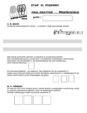ETAP II PISEMNY PAUL DRAYTON - Masterpiece godło : J. S. BACH Uzupełnij sześciotaktowy temat – w postaci z jego pierwszego pokazu ======================== ======================== Gdy temat ponownie zabrzmi w sopranie w oryginalnej postaci bas charakterystycznym „śmiechem” na drobnych wartościach rytmicznych sprowadzi nas od dźwięku c do powtarzającej się nuty pedałowej , czyli (nazwa literowa): W końcowej kadencji , po oddechu, bas zaśpiewa ba na wysokości A ; podaj nawy literowe kolejnych trzech dźwięków ustawianych w następujących po sobie ćwierćnutach przez dołączające się głosy. G. F. HÄNDEL W metrum 4/4, przy tempie grave, określ akordy występujące na pierwszą miarę w czterech pierwszych taktach, wraz ze składnikami oparcia. Dźwięk naśladujący trąbki wyznacza wysokość d2 Po zamianie metrum nasłuchuj ponownego pojawienia się głosu basowego na słowach George Frederic Händel; Zapisz na linii odpowiadający im rytm wraz z poprawnym metrum, w którym utrzymany jest ten fragment: W. A. MOZART Zapisz w kluczu basowym pierwsze trzy takty głosu basowego (słowa: Mozart, andante grazioso) zaczynając od dźwięku h ======================== Wyszukaj w śpiewanym dalej tekście tytuły oper W. A. Mozarta; Podaj tylko te, których nazwy rzeczywiście zostały uŜyte (za podanie innych tytułów moŜesz stracić część punktów z tego zadania) MoŜesz podawać wersje polsko- lub obcojęzyczne. L. van BEETHOVEN Początek humorystycznego sporu śpiewaków o pisownię nazwiska (van czy von ?) to cztery opadające pochody siedmiu dźwięków od wskazanych wysokości (za kaŜdym razem na słowach Ludwig, Ludwig, Ludwig va(o)n. Zapisz je uŜywając przynajmniej główek nut z odpowiednimi znakami przygodnymi 1) od f 2 3) od es ======== 2) od b ======== ======= 4) od a ======== 2 Głosem imitującym barwę waltorni śpiewacy intonują parokrotnie dźwięk a. Określ tonację akordu następującego po nim, a następnie dwa niespodziewane motywy wykonywane przez „niesfornego” wykonawcę partii basu. I motyw ======== II motyw ========= tonacja akordu F. MENDELSSOHN - BARTHOLDY Wsłuchaj się w głos sopranowy i określ największy wysłyszany w nim interwał. J. STRAUSS Tempo di valse... Czyli (w prezentowanym wykonaniu) ile/jakich jednostek na minutę według metronomu ? (nie uwzględniaj przyspieszenia wieńczącego ten fragment) C. DEBUSSY Wiedząc, Ŝe pierwszy dźwięk sopranu na słowach Claude Debussy to dis2 podaj wszystkie dźwięki skali uŜyte do prezentacji nazwiska kompozytora (tylko na odcinku z tekstem Claude Debussy) ========= R. WAGNER Nagły „wybryk” jednego z wykonawców okazuje się być próbą zaprezentowania motywów z twórczości R. Wagnera. Przy udawanej konsternacji pozostałych śpiewaków ma to miejsce aŜ dwukrotnie. Określ ambitus tych solowych „interwencji”: 1) 2) W. BYRD Uzupełnij przebieg harmoniczny towarzyszący słowom William Byrd: RÓśNI KOMOZYTORZY Zanim zabrzmi Bach again „wyśpiewane” zostaną w ciągu kilkunastu sekund nazwiska trzech XX-wiecznych kompozytorów; Wysłysz je i podaj je w kolejności chronologicznej : BACH again : Podaj nazwy literowe wszystkich dźwięków tworzących najdłuŜszy (z fermatą) akord dominantowy (na słowie Bach) w kadencji do finałowego G-dur: