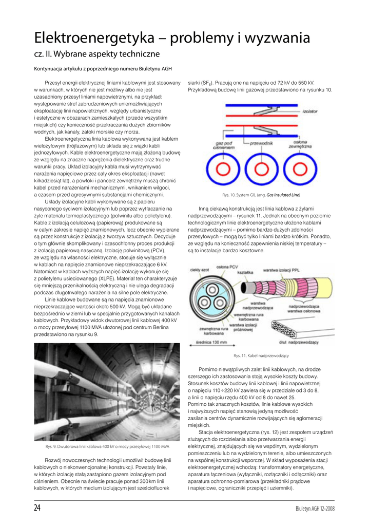 Elektroenergetyka – problemy i wyzwania cz. II. Wybrane aspekty techniczne Kontynuacja artykułu z poprzedniego numeru Biuletynu AGH Przesył energii elektrycznej liniami kablowymi jest stosowany w warunkach, w których nie jest możliwy albo nie jest uzasadniony przesył liniami napowietrznymi, na przykład: występowanie stref zabrudzeniowych uniemożliwiających eksploatację linii napowietrznych, względy urbanistyczne i estetyczne w obszarach zamieszkałych (przede wszystkim miejskich) czy konieczność przekraczania dużych zbiorników wodnych, jak kanały, zatoki morskie czy morza. Elektroenergetyczna linia kablowa wykonywana jest kablem wielożyłowym (trójfazowym) lub składa się z wiązki kabli jednożyłowych. Kable elektroenergetyczne mają złożoną budowę ze względu na znaczne naprężenia dielektryczne oraz trudne warunki pracy. Układ izolacyjny kabla musi wytrzymywać narażenia napięciowe przez cały okres eksploatacji (nawet kilkadziesiąt lat), a powłoki i pancerz zewnętrzny muszą chronić kabel przed narażeniami mechanicznymi, wnikaniem wilgoci, a czasem przed agresywnymi substancjami chemicznymi. Układy izolacyjne kabli wykonywane są z papieru nasyconego syciwem izolacyjnym lub poprzez wytłaczanie na żyle materiału termoplastycznego (polwinitu albo polietylenu). Kable z izolacją celulozową (papierową) produkowane są w całym zakresie napięć znamionowych, lecz obecnie wypierane są przez konstrukcje z izolacją z tworzyw sztucznych. Decyduje o tym głównie skomplikowany i czasochłonny proces produkcji z izolacją papierową nasycaną. Izolację polwinitową (PCV), ze względu na własności elektryczne, stosuje się wyłącznie w kablach na napięcie znamionowe nieprzekraczające 6 kV. Natomiast w kablach wyższych napięć izolację wykonuje się z polietylenu usieciowanego (XLPE). Materiał ten charakteryzuje się mniejszą przenikalnością elektryczną i nie ulega degradacji podczas długotrwałego narażenia na silne pole elektryczne. Linie kablowe budowane są na napięcia znamionowe nieprzekraczające wartości około 500 kV. Mogą być układane bezpośrednio w ziemi lub w specjalnie przygotowanych kanałach kablowych. Przykładowy widok dwutorowej linii kablowej 400 kV o mocy przesyłowej 1100 MVA ułożonej pod centrum Berlina przedstawiono na rysunku 9. siarki (SF6). Pracują one na napięciu od 72 kV do 550 kV. Przykładową budowę linii gazowej przedstawiono na rysunku 10. Rys. 10. System GIL (ang. Gas Insulated Line) Inną ciekawą konstrukcją jest linia kablowa z żyłami nadprzewodzącymi – rysunek 11. Jednak na obecnym poziomie technologicznym linie elektroenergetyczne ułożone kablami nadprzewodzącymi – pomimo bardzo dużych zdolności przesyłowych – mogą być tylko liniami bardzo krótkim. Ponadto, ze względu na konieczność zapewnienia niskiej temperatury – są to instalacje bardzo kosztowne. Rys. 11. Kabel nadprzewodzący Rys. 9. Dwutorowa linii kablowa 400 kV o mocy przesyłowej 1100 MVA Rozwój nowoczesnych technologii umożliwił budowę linii kablowych o niekonwencjonalnej konstrukcji. Powstały linie, w których izolację stałą zastąpiono gazem izolacyjnym pod ciśnieniem. Obecnie na świecie pracuje ponad 300 km linii kablowych, w których medium izolującym jest sześciofluorek 24 Pomimo niewątpliwych zalet linii kablowych, na drodze szerszego ich zastosowania stoją wysokie koszty budowy. Stosunek kosztów budowy linii kablowej i linii napowietrznej o napięciu 110÷220 kV zawiera się w przedziale od 3 do 8, a linii o napięciu rzędu 400 kV od 8 do nawet 25. Pomimo tak znacznych kosztów, linie kablowe wysokich i najwyższych napięć stanowią jedyną możliwość zasilania centrów dynamicznie rozwijających się aglomeracji miejskich. Stacja elektroenergetyczna (rys. 12) jest zespołem urządzeń służących do rozdzielania albo przetwarzania energii elektrycznej, znajdujących się we wspólnym, wydzielonym pomieszczeniu lub na wydzielonym terenie, albo umieszczonych na wspólnej konstrukcji wsporczej. W skład wyposażenia stacji elektroenergetycznej wchodzą: transformatory energetyczne, aparatura łączeniowa (wyłączniki, rozłączniki i odłączniki) oraz aparatura ochronno-pomiarowa (przekładniki prądowe i napięciowe, ograniczniki przepięć i uziemniki). Biuletyn AGH 12-2008 Rys. 13. Widok rozdzielni gazowej obiekcie, rozwiązania kompaktowe wymagające mniejszej ilości fundamentów i konstrukcji wsporczych, utrzymanie ciągłości dostawy energii elektrycznej, decyzje o zabiegach konserwacyjnych w oparciu o ciągły monitoring urządzeń oraz analizę aktualnego stanu i poziomu ryzyka. Dążenie do zmniejszenia wymiarów stacji zainspirowało konstruktorów do opracowania rozdzielnic modułowych, które zajmują obszar o 30–50% mniejszy niż rozdzielnice napowietrzne konwencjonalne. Kompresję tych rozwiązań uzyskuje się poprzez zintegrowaniu funkcji spełnianych przez kilka aparatów a jednym rozwiązaniu konstrukcyjnym. Stacje elektroenergetyczne z rozdzielniami modułowymi w porównaniu z rozwiązaniami tradycyjnymi wymagają mniejszej liczby odłączników, fundamentów, konstrukcji wsporczych i połączeń elektrycznych, mają krótszy czas montażu, mają niższe koszty eksploatacji oraz zapewniają większe bezpieczeństwo obsługi dzięki redukcji ilości przeglądów i konserwacji. Jednym z wyzwań dla energetyki, w aspekcie technicznym, jest bezpieczeństwo energetyczne zdefiniowane w „Prawie energetycznym”, jako stan gospodarki umożliwiający pokrycie bieżącego i perspektywicznego zapotrzebowania odbiorców na paliwa i energię w sposób technicznie i ekonomicznie uzasadniony, przy zachowaniu wymagań ochrony środowiska. Definicja ta została powtórzona w „Założeniach polityki energetycznej Polski do 2020 roku”. Przyjmując za podstawę tę ustawową definicję, można określić zachowanie bezpieczeństwa energetycznego kraju jako zespół dzi