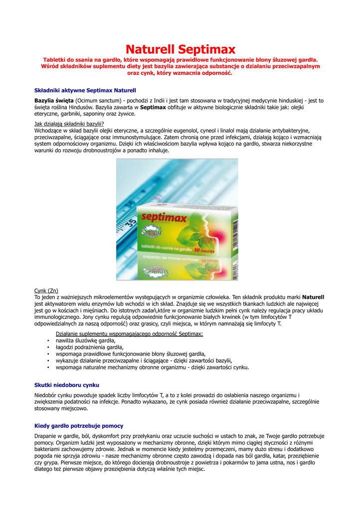 Naturell Septimax Tabletki do ssania na gardło, które wspomagają prawidłowe funkcjonowanie błony śluzowej gardła. Wśród składników suplementu diety jest bazylia zawierająca substancje o działaniu przeciwzapalnym oraz cynk, który wzmacnia odporność. Składniki aktywne Septimax Naturell Bazylia święta (Ocimum sanctum) - pochodzi z Indii i jest tam stosowana w tradycyjnej medycynie hinduskiej - jest to święta roślina Hindusów. Bazylia zawarta w Septimax obfituje w aktywne biologicznie składniki takie jak: olejki eteryczne, garbniki, saponiny oraz żywice. Jak działają składniki bazylii? Wchodzące w skład bazylii olejki eteryczne, a szczególnie eugenolol, cyneol i linalol mają działanie antybakteryjne, przeciwzapalne, ściągające oraz immunostymulujące. Zatem chronią one przed infekcjami, działają kojąco i wzmacniają system odpornościowy organizmu. Dzięki ich właściwościom bazylia wpływa kojąco na gardło, stwarza niekorzystne warunki do rozwoju drobnoustrojów a ponadto inhaluje. Cynk (Zn) To jeden z ważniejszych mikroelementów występujących w organizmie człowieka. Ten składnik produktu marki Naturell jest aktywatorem wielu enzymów lub wchodzi w ich skład. Znajduje się we wszystkich tkankach ludzkich ale najwięcej jest go w kościach i mięśniach. Do istotnych zadań,które w organizmie ludzkim pełni cynk należy regulacja pracy układu immunologicznego. Jony cynku regulują odpowiednie funkcjonowanie białych krwinek (w tym limfocytów T odpowiedzialnych za naszą odporność) oraz grasicy, czyli miejsca, w którym namnażają się limfocyty T. • • • • • Działanie suplementu wspomagającego odporność Septimax: nawilża śluzówkę gardła, łagodzi podrażnienia gardła, wspomaga prawidłowe funkcjonowanie błony śluzowej gardła, wykazuje działanie przeciwzapalne i ściągające - dzięki zawartości bazylii, wspomaga naturalne mechanizmy obronne organizmu - dzięki zawartości cynku. Skutki niedoboru cynku Niedobór cynku powoduje spadek liczby limfocytów T, a to z kolei prowadzi do osłabienia naszego organizmu i zwiększenia podatności na infekcje. Ponadto wykazano, że cynk posiada również działanie przeciwzapalne, szczególnie stosowany miejscowo. Kiedy gardło potrzebuje pomocy Drapanie w gardle, ból, dyskomfort przy przełykaniu oraz uczucie suchości w ustach to znak, ze Twoje gardło potrzebuje pomocy. Organizm ludzki jest wyposażony w mechanizmy obronne, dzięki którym mimo ciągłej styczności z różnymi bakteriami zachowujemy zdrowie. Jednak w momencie kiedy jesteśmy przemęczeni, mamy dużo stresu i dodatkowo pogoda nie sprzyja zdrowiu - nasze mechanizmy obronne często zawodzą i dopada nas ból gardła, katar, przeziębienie czy grypa. Pierwsze miejsce, do którego docierają drobnoustroje z powietrza i pokarmów to jama ustna, nos i gardło dlatego też pierwsze objawy przeziębienia dotyczą właśnie tych miejsc. Pierwsze objawy infekcji Kiedy gardło jest wysuszone - jego naturalne mechanizmy obronne są osłabione i utrudniona jest obrona przed drobnoustrojami. Wówczas bakterie i wirusy atakują najpierw nasze gardło a stamtąd atakują rozprzestrzeniają się na cały organizm. Jakie są pierwsze objawy infekcji? O tym, że drobnoustroje zaatakowały gardło i rozwija się w nim infekcja świadczą objawy taki jak: ból i zaczerwienienie gardła, dyskomfort oraz utrudnione przełykanie. • • • Wskazania do stosowania tabletek do ssania wzmacniających odporność Septimax: podrażnienia gardła i jamy ustnej - uczucie drapania i suchości w ustach, dyskomfort przy przełykaniu, okres zwiększonej podatności na infekcje, stany obniżonej odporności, zwłaszcza w okresie jesienno-zimowym. Jak chronić gardło? Barierą dla drobnoustrojów jest śluzówka gardła i jamy ustnej, jest ona jednak bardzo wrażliwa na niekorzystne czynniki. W okresie osłabienia organizmu oraz zwiększonej ekspozycji na niekorzystne czynniki (zmiany temperatury, wysuszone powietrze, klimatyzowane pomieszczenia itp.) wymaga szczególnej uwagi i pomocy z zewnątrz. Niezbędne jest nawilżanie gardła za pomocą odpowiednich suplementów oraz suplementy zwiększające odporność, które wzmocnią jeszcze naszą ochronę przed infekcjami. Ratunek dla gardła: Septimax - łagodzi podrażnienia, nawilża śluzówkę i wzmacnia odporność Septimax to tabletki na gardło, które dzięki zawartości bazylii bogatej w olejki eteryczne oraz cynku wzmacniającego odporność sprawia, że śluzówka gardła staje się bardziej nawilżona, a jej odporność zwiększona. Dawkowanie : dorośli i dzieci powyżej 12 roku życia: 1-5 tabletek dziennie. Skład preparatu zwiększającego odporność na stres : Substancje czynne SEPTIMAX NATURELL: w 1 tabl. w 5 tabl. bazylia (Ocimum sanctum) 20 mg 100mg w tym olejki eteryczne i żywice 0,4 mg 2mg cynk 1 mg (6,6% d.z.s.*) 5mg (33,3% d.z.s*) • • • • • • • • • Inne składniki odżywki : orbitol (substancja słodząca), mikrokrystaliczna celuloza (substancja wypełniająca), aromat lukrecjowy, skrobia ( substancja wypełniająca), olej rycynowy, hydroksypropylometyloceluloza (substancja do stosowania na powierzchnię), stearynian magnezu (nośnik), aromat miętowy, zawiera substancję słodzącą. www.kulturystyka.sklep.pl