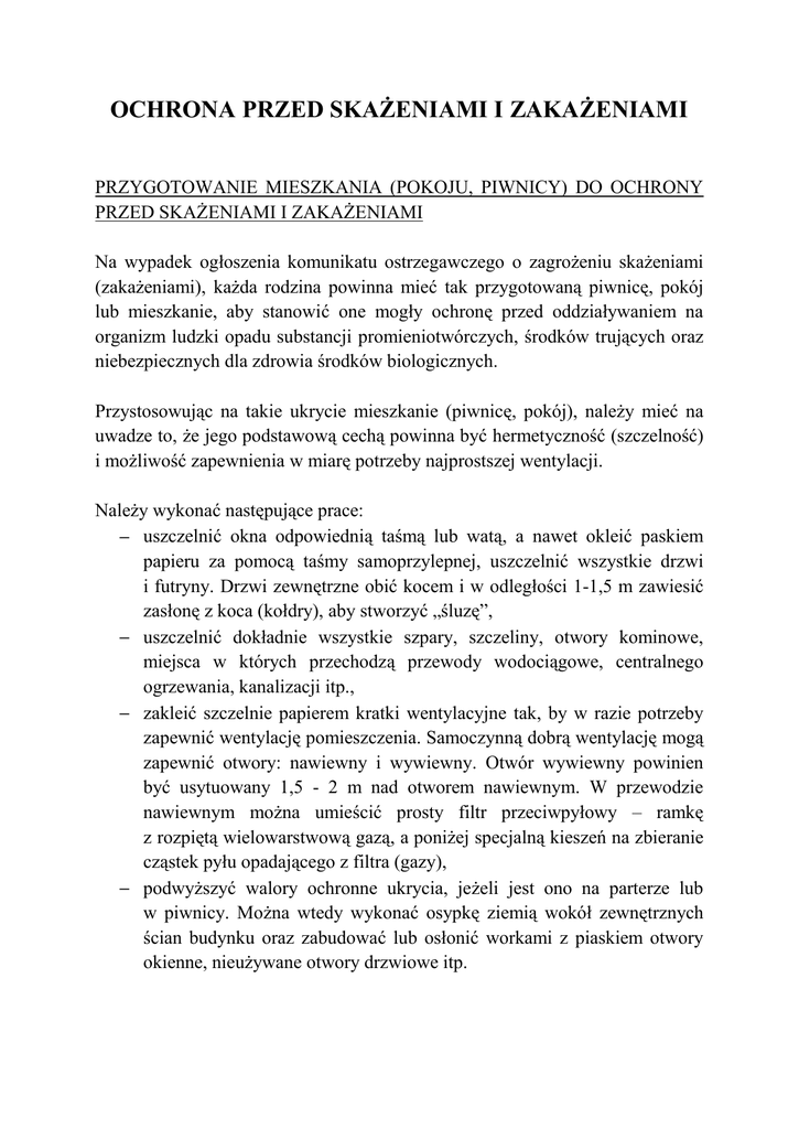 OCHRONA PRZED SKAŻENIAMI I ZAKAŻENIAMI PRZYGOTOWANIE MIESZKANIA (POKOJU, PIWNICY) DO OCHRONY PRZED SKAŻENIAMI I ZAKAŻENIAMI Na wypadek ogłoszenia komunikatu ostrzegawczego o zagrożeniu skażeniami (zakażeniami), każda rodzina powinna mieć tak przygotowaną piwnicę, pokój lub mieszkanie, aby stanowić one mogły ochronę przed oddziaływaniem na organizm ludzki opadu substancji promieniotwórczych, środków trujących oraz niebezpiecznych dla zdrowia środków biologicznych. Przystosowując na takie ukrycie mieszkanie (piwnicę, pokój), należy mieć na uwadze to, że jego podstawową cechą powinna być hermetyczność (szczelność) i możliwość zapewnienia w miarę potrzeby najprostszej wentylacji. Należy wykonać następujące prace: uszczelnić okna odpowiednią taśmą lub watą, a nawet okleić paskiem papieru za pomocą taśmy samoprzylepnej, uszczelnić wszystkie drzwi i futryny. Drzwi zewnętrzne obić kocem i w odległości 1-1,5 m zawiesić zasłonę z koca (kołdry), aby stworzyć „śluzę”, uszczelnić dokładnie wszystkie szpary, szczeliny, otwory kominowe, miejsca w których przechodzą przewody wodociągowe, centralnego ogrzewania, kanalizacji itp., zakleić szczelnie papierem kratki wentylacyjne tak, by w razie potrzeby zapewnić wentylację pomieszczenia. Samoczynną dobrą wentylację mogą zapewnić otwory: nawiewny i wywiewny. Otwór wywiewny powinien być usytuowany 1,5 - 2 m nad otworem nawiewnym. W przewodzie nawiewnym można umieścić prosty filtr przeciwpyłowy – ramkę z rozpiętą wielowarstwową gazą, a poniżej specjalną kieszeń na zbieranie cząstek pyłu opadającego z filtra (gazy), podwyższyć walory ochronne ukrycia, jeżeli jest ono na parterze lub w piwnicy. Można wtedy wykonać osypkę ziemią wokół zewnętrznych ścian budynku oraz zabudować lub osłonić workami z piaskiem otwory okienne, nieużywane otwory drzwiowe itp. W mieszkaniu przygotowanym na ukrycie powinny być także: odpowiedni zapas wody pitnej, żywności, przedmioty pierwszej potrzeby, worki plastikowe na odpadki, lekarstwa dla chorych, apteczka domowa, środki dezynfekcyjne, zapasowe oświetlenie, bateryjny odbiornik radiowy, sprzęt gaśniczy (gaśnica, koc, wiadro, piasek, łopata itp.), niezbędne przedmioty osobistego użytku. Pamiętać należy o przygotowaniu oświetlenia zastępczego. Zalecane jest oświetlenie elektryczne (bateryjne, akumulatorowe). Lampy naftowe i świece paląc się, zużywają dużo tlenu oraz zanieczyszczają powietrze dwutlenkiem węgla, dlatego ich używanie jest niewskazane. Również nie wszystkie rodzaje gaśnic nadają się do użycia w ukryciach, np. gaśnica halonowa wprowadza do atmosfery halon, który przy wdychaniu wykazuje szkodliwe działanie dla zdrowia, gaśnica śniegowa natomiast wprowadza do atmosfery bardzo dużo dwutlenku węgla. Z tego względu do gaszenia należy używać wody, koców gaśniczych, piasku, a jeżeli gaśnic - to pianowych lub wodnych. PRZYGOTOWANIE BUDYNKÓW GOSPODARCZYCH DO OCHRONY PRZED SKAŻENIAMI I ZAKAŻENIAMI Przedsięwzięcie to polega na zwiększeniu walorów wytrzymałościowych oraz właściwości ochronnych stodół, spichlerzy, komórek zawierających plony, obór i chlewni z bydłem i trzodą, przede wszystkim przez ich uszczelnienie i uniemożliwienie przedostawania się środków skażenia i zakażenia do wnętrza. W okresie zagrożenia w budynkach gospodarczych należy: uszczelnić sufit warstwą z gliny, cementu lub wapna (2 wiadra wapna gaszonego, 1 wiadro wody, 2 kg soli kuchennej), część okien zamurować cegłami lub obić deskami z obu stron i wypełnić ziemią (torfem, trocinami), a pozostałe zaopatrzyć w izolacyjne okiennice lub zasłonić mocnym przezroczystym plastikiem, pozatykać gliną, pakułami szpary w konstrukcjach drewnianych, uszczelnić futryny i drzwi, od strony wewnętrznej zawiesić zasłonę z tkaniny, aby szczelnie przylegała do ram drzwi, zasłonić przewody (otwory) wentylacyjne workami z trocinami, sianem itp. obsypać z zewnątrz ziemią ściany drewniane do wysokości okien albo w odległości 50 – 60 cm od ściany postawić ściankę z desek lub plecionkę z wikliny i przestrzeń między nimi zasypać ziemią. Nawet w pomieszczeniach niehermetycznych można zapewnić kilkugodzinną ochronę przed przenikaniem do wnętrza niektórych środków trujących, jeżeli zamknięte okna i drzwi zasłonimy od wewnątrz brezentem, tkaniną workową lub inną tkaniną zamoczoną w wodnym roztworze sody. Aby zapewnić zwierzętom bezpieczeństwo, należy także: przygotować wystarczający na 14 dni zapas wody i paszy zabezpieczonej przed skażeniem, wietrzyć uszczelnione obory (chlewnie): dokładne informacje poda służba weterynaryjna. zapewnić budynkom gospodarczym ochronę przed pożarem (pas przeciwpożarowy, sprzęt ppoż. itp. SPOSOBY ZABEZPIECZENIA ŻYWNOŚCI Gwarancją izolacji żywności od środowiska zewnętrznego jest zastosowanie właściwych opakowań. Opakowania ochronne mogą być następujące: pyłoszczelne z materiałów twardych: puszki metalowe hermetyczne, które można dokładnie i szybko zmyć lub odkazić, opakowania szklane, słoje i butelki nieprzepuszczające pary wodnej i gazu, umożliwiające przeprowadzenie ich sterylizacji. opakowania drewniane (sklejka, płyta pilśniowa) - skrzynki wyłożone pergaminem lub kilkoma warstwami papieru pakowego, a także beczki drewniane, zabezpieczające w należyty sposób żywność przed działaniem środków promieniotwórczych, chemicznych i biologicznych, pyłoszczelne z tworzyw miękkich - hermetyczne opakowania (worki, woreczki, torby itp.) z folii powlekanych, metalowych, tworzyw sztucznych i innych, pyłoszczelne papierowe, wielowarstwowe z wkładką parafinową lub z tworzyw sztucznych. W warunkach domowych bardzo dobrym opakowaniem zbiorczym jest lodówka. Hermetyczność lodówki można zwiększyć za pomocą dodatkowych zasłon z folii lub ceraty na każdej pół