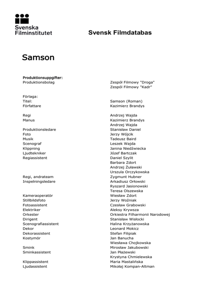 Svensk Filmdatabas Samson Produktionsuppgifter: Produktionsbolag Förlaga: Titel: Författare Regi Manus Produktionsledare Foto Musik Scenograf Klippning Ljudtekniker Regiassistent Regi, andrateam Inspelningsledare Kameraoperatör Stillbildsfoto Fotoassistent Elektriker Orkester Dirigent Scenografiassistent Dekor Dekorassistent Kostymör Smink Sminkassistent Klippassistent Ljudassistent Zespół Filmowy "Droga" Zespól Filmowy "Kadr" Samson (Roman) Kazimierz Brandys Andrzej Wajda Kazimierz Brandys Andrzej Wajda Stanisław Daniel Jerzy Wójcik Tadeusz Baird Leszek Wajda Janina Niedźwiecka Józef Bartczak Daniel Szylit Barbara Zdort Andrzej Żuławski Urszula Orczykowska Zygmunt Hubner Arkadiusz Orłowski Ryszard Jasionowski Teresa Olszewska Wiesław Zdort Jerzy Woźniak Czesław Grabowski Aleksy Krywsza Orkiestra Filharmonii Narodowej Stanisław Wisłocki Halina Krzyżanowska Leonard Mokicz Stefan Filipiak Jan Banucha Wiesława Chojkowska Mirosław Jakubowski Jan Płażewski Krystyna Chmielewska Maria Mastalińska Mikołaj Kompan-Altman Svensk Filmdatabas Bildformat: Färgsystem: Ljudsystem: Originallängd i minuter: Normalbild (1,37:1) Svartvit Optisk mono 117 Urpremiär 1961-09-11 Polen 117 minuter Rollista: Serge Merlin Alina Janowska Elżbieta Kępińska Jan Ciecierski Tadeusz Bartosik Władysław Kowalski Irena Netto Beata Tyszkiewicz Jan Ibel Bogumił Antczak Edmund Fetting Roland Głowacki Andrzej Herder Zygmunt Hubner Zofia Jamry Władysław Kowalski Stanisław Jaśkiewicz Zbigniew Józefowicz Edward Kowalczyk Roman Polański Ryszard Ronczewski Magda Teresa Wójcik Krystyna Zachwatowicz Tomasz Zaliwski Andrzej Żuławski Zygmunt Listkiewicz Jerzy Łapiński Zdzisław Maklakiewicz Zygmunt Malawski Ryszard Pracz Jakub Gold Lucyna Kazia Józef Malina "professor" Pankrat Fiałka Jakubs mor Stasia Genio fånge Zygmunt, gäst på Lucynas fest gäst på Lucynas fest Gestapoofficer Gestapoofficer Malinas utpresserska Jakub Golds röst (dubbning) professor på föreläsningen gäst på Lucynas fest polis utpresserskans partner fängelsevakt kvinna på Lucynas fest Wiśka fånge dödad student