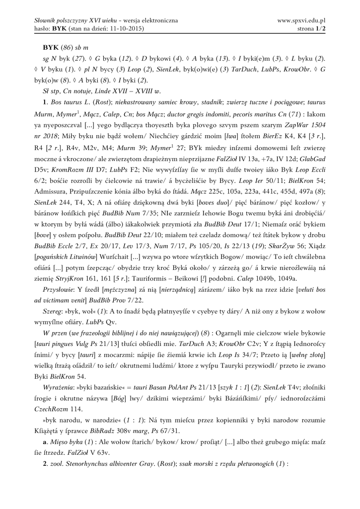 Słownik polszczyzny XVI wieku - wersja elektroniczna hasło: BYK (stan na dzień: 11-10-2015) www.spxvi.edu.pl strona 1/2 BYK (86) sb m sg N byk (27). ◊ G byka (12). ◊ D bykowi (4). ◊ A byka (13). ◊ I byki(e)m (3). ◊ L byku (2). ◊ V byku (1). ◊ pl N bycy (3) Leop (2), SienLek, byk(o)wi(e) (3) TarDuch, LubPs, KrowObr. ◊ G byk(o)w (8). ◊ A byki (8). ◊ I byki (2). Sł stp, Cn notuje, Linde XVII – XVIII w. 1. Bos taurus L. (Rost); niekastrowany samiec krowy, stadnik; zwierzę tuczne i pociągowe; taurus Murm, Mymer1, Mącz, Calep, Cn; bos Mącz; ductor gregis indomiti, pecoris maritus Cn (71) : Iakom ya nyeposzczval [...] yego bydlączya thoyeszth byka plovego szvym pszem szarym ZapWar 1504 nr 2018; Miły byku nie bądź wołem/ Niechćiey gárdzić moim [lwa] ſtołem BierEz K4, K4 [3 r.], R4 [2 r.], R4v, M2v, M4; Murm 39; Mymer1 27; BYk miedzy inſzemi domowemi Ieſt zwierzę moczne á vkroczone/ ale zwierzętom drapieżnym nieprzijazne FalZioł IV 13a, +7a, IV 12d; GlabGad D5v; KromRozm III D7; LubPs F2; Nie wywyſzſſay ſie w myſli duſfe twoiey iáko Byk Leop Eccli 6/2; bośćie rozroſli by ćielcowie ná trawie/ á bycżeliśćie by Bycy. Leop Ier 50/11; BielKron 54; Admissura, Przipuſzczenie kónia álbo byká do ſtádá. Mącz 225c, 105a, 223a, 441c, 455d, 497a (8); SienLek 244, T4, X; A ná ofiárę dziękowną dwá byki [boves duo]/ pięć báránow/ pięć kozłow/ y báránow łońſkich pięć BudBib Num 7/35; NIe zarznieſz Iehowie Bogu twemu byká áni drobięćiá/ w ktorym by byłá wádá (álbo) iákakolwiek przymiotá zła BudBib Deut 17/1; Niemaſz oráć bykiem [bove] y osłem poſpołu. BudBib Deut 22/10; miałem też czeladz domową/ też ſtátek bykow y drobu BudBib Eccle 2/7, Ex 20/17, Lev 17/3, Num 7/17, Ps 105/20, Is 22/13 (19); SkarŻyw 56; Xiądz [pogańskich Litwinów] Wurſchait [...] wzywa po wtore wſzytkich Bogow/ mowiąc/ To ieſt chwálebna ofiárá [...] potym ſzepcząc/ obydzie trzy kroć Byká około/ y zárzeżą go/ á krwie nieroźlewáią ná ziemię StryjKron 161, 161 [5 r.]; Tauriformis ‒ Beikowi [!] podobni. Calep 1049b, 1049a. Przysłowie: Y ſzedł [mężczyzna] zá nią [nierządnicą] zárázem/ iáko byk na rzez idzie [veluti bos ad victimam venit] BudBib Prov 7/22. Szereg: »byk, woł« (1): A to ſnadź będą płatnyeyſſe v cyebye ty dáry/ A niż ony z bykow z wołow wymyſlne ofiáry. LubPs Qv. W przen (we frazeologii biblijnej i do niej nawiązującej) (8) : Ogarnęli mie cielczow wiele bykowie [tauri pingues Vulg Ps 21/13] tłuſci obſiedli mie. TarDuch A3; KrowObr C2v; Y z ſtąpią Iednoroſcy ſnimi/ y bycy [tauri] z mocarzmi: nápije ſie źiemiá krwie ich Leop Is 34/7; Przeto ią [wełnę złotą] wielką ſtrażą oſádził/ to ieſt/ okrutnemi ludźmi/ ktore z wyſpu Tauryki przywiodł/ przeto ie zwano Byki BielKron 54. Wyrażenia: »byki bazańskie« = tauri Basan PolAnt Ps 21/13 [szyk 1 : 1] (2): SienLek T4v; złoſniki ſrogie i okrutne názywa [Bóg] lwy/ dzikimi wieprzámi/ byki Bázáńſkimi/ pſy/ iednoroſzcżámi CzechRozm 114. »byk narodu, w narodzie« (1 : 1): Ná tym mieſcu przez kopienniki y byki narodow rozumie Kſiążętá y ſprawce BibRadz 308v marg, Ps 67/31. a. Mięso byka (1) : Ale wołow ſtarich/ bykow/ krow/ proſiąt/ [...] albo theż grubego mięſa: maſz ſie ſtrzedz. FalZioł V 63v. 2. zool. Stenorhynchus albiventer Gray. (Rost); ssak morski z rzędu płetwonogich (1) : Słownik polszczyzny XVI wieku - wersja elektroniczna hasło: BYK (stan na dzień: 11-10-2015) www.spxvi.edu.pl strona 2/2 Zestawienie: »byk morski« (1): Felchus ieſt woł albo byk morzki. FalZioł IV 35c. 3. astron. Konstelacja byka; taurus Murm, Mymer1, BartBydg, Mącz; bos BartBydg (13) : Murm 4; Mymer1 3v; BartBydg 155b; troie znamion niebieſkich w tobie [wiosna] zawiera, Skopu, Byka y B1iznięta. FalZioł [*8]v, V 49v, 53v; W Byku Dobrze ieſt ſiać y ſzcżepić y wino rozſadzać Goski *2v; BielKron 263; P1ánetow położenie/ będźie zá dźiewięć lat od látośiego Roku w Byku á w niedźwiádku LeovPrzep E2v, E2v, E3v; Taurus item coeleste signum Yedno známię ze dwunaśćie známion niebieskich/ Byk. Mącz 441c; PaxLiz C2. 4. n-pers (1) : Zestawienie: svmą pyadzdzeszyath kop grosschy [...] czasthką dzedzyczną slachathnyey nyegdy katharzyny czorky nyegdy slachathnyego Mykolaya byką [!] [lege: byka] ZapWar 1513 nr 2063. Synonimy: 1. bydlnik, cielec, stadnik, woł; 2. ciołek, ciołka, »woł morski«. Cf BYKOROD, BYKORODNY, CHŁOPOBYK LZ