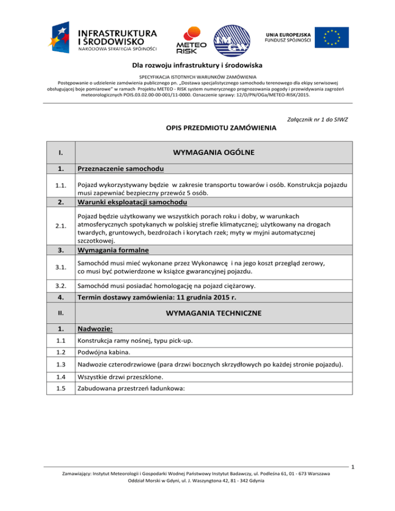 Dla rozwoju infrastruktury i środowiska SPECYFIKACJA ISTOTNYCH WARUNKÓW ZAMÓWIENIA Postępowanie o udzielenie zamówienia publicznego pn. „Dostawa specjalistycznego samochodu terenowego dla ekipy serwisowej obsługującej boje pomiarowe” w ramach Projektu METEO - RISK system numerycznego prognozowania pogody i przewidywania zagrożeń meteorologicznych POIS.03.02.00-00-001/11-0000. Oznaczenie sprawy: 12/D/PN/OGa/METEO-RISK/2015. Załącznik nr 1 do SIWZ OPIS PRZEDMIOTU ZAMÓWIENIA WYMAGANIA OGÓLNE I. 1. 1.1. 2. 2.1. 3. Przeznaczenie samochodu Pojazd wykorzystywany będzie w zakresie transportu towarów i osób. Konstrukcja pojazdu musi zapewniać bezpieczny przewóz 5 osób. Warunki eksploatacji samochodu Pojazd będzie użytkowany we wszystkich porach roku i doby, w warunkach atmosferycznych spotykanych w polskiej strefie klimatycznej; użytkowany na drogach twardych, gruntowych, bezdrożach i korytach rzek; myty w myjni automatycznej szczotkowej. Wymagania formalne 3.1. Samochód musi mieć wykonane przez Wykonawcę i na jego koszt przegląd zerowy, co musi być potwierdzone w książce gwarancyjnej pojazdu. 3.2. Samochód musi posiadać homologację na pojazd ciężarowy. 4. Termin dostawy zamówienia: 11 grudnia 2015 r. WYMAGANIA TECHNICZNE II. 1. Nadwozie: 1.1 Konstrukcja ramy nośnej, typu pick-up. 1.2 Podwójna kabina. 1.3 Nadwozie czterodrzwiowe (para drzwi bocznych skrzydłowych po każdej stronie pojazdu). 1.4 Wszystkie drzwi przeszklone. 1.5 Zabudowana przestrzeń ładunkowa: 1 Zamawiający: Instytut Meteorologii i Gospodarki Wodnej Państwowy Instytut Badawczy, ul. Podleśna 61, 01 - 673 Warszawa Oddział Morski w Gdyni, ul. J. Waszyngtona 42, 81 - 342 Gdynia Dla rozwoju infrastruktury i środowiska SPECYFIKACJA ISTOTNYCH WARUNKÓW ZAMÓWIENIA Postępowanie o udzielenie zamówienia publicznego pn. „Dostawa specjalistycznego samochodu terenowego dla ekipy serwisowej obsługującej boje pomiarowe” w ramach Projektu METEO - RISK system numerycznego prognozowania pogody i przewidywania zagrożeń meteorologicznych POIS.03.02.00-00-001/11-0000. Oznaczenie sprawy: 12/D/PN/OGa/METEO-RISK/2015. 1.5.1 Zabudowa sztywna (hardtop) wykonana z aluminium do wysokości dachu kabiny. Boczne ściany zabudowy dopasowane do kształtu obrysu bocznego kabiny kierowcy. Zabudowa zamykana za pomocą klap otwieranych do góry. Klapa tylna o szerokości w dolnej części zbliżonej do szerokości burty tylnej skrzyni ładunkowej, klapy boczne z prawej i lewej strony o maksymalnej możliwej szerokości. Wszystkie klapy stabilizowane sprężynami gazowymi, wyposażone w zamki z możliwością zamknięcia na klucz. Elementy zawiasów i zamków wykonane z materiałów nierdzewnych. Zabudowa polakierowana zewnętrznie w kolorze kabiny samochodu. Zabudowa mocowana na skrzyni ładunkowej w sposób trwały, z zapewnioną możliwością demontażu. 1.5.2 Wysuwny podest skrzyni ładunkowej (tzw. wysuwna podłoga). Szerokość maksymalna możliwa pomiędzy wnękami nadkoli, wysuw min. 50% długości. Maksymalna obciążenie przy pełnym wysuwie min. 200 kg (obciążenie rozmieszczone równomiernie na podeście). Górna część podestu wykonana z aluminiowej blachy ryflowanej (antypoślizgowa), na krawędziach podestu zamontowane uchwyty do pasów mocujących ładunki (po 3 z każdej strony). Kraniec podestu od strony kabiny pasażerskiej wyposażony w ogranicznik zapobiegający zsunięciu sie ładunku. Prowadnice mechanizmu wysuwu wykonane z aluminium, rolki z tworzywa sztucznego zapewniające ciche i lekkie wysuwanie bez konieczności smarowania. Zamek blokujący w pozycji wsuniętej i całkowicie wysuniętej. Zwalnianie zamka za pomocą jednej klamki lub przycisku. Uchwyty umożliwiające wysunięcie podłogi. 1.5.3 Wnętrze zabudowy przestrzeni ładunkowej wykończone poliuretanową warstwą ochronną. 2. Silnik: 2.1 2.2 2.3 2.4 2.5 2.6 2.7 Rodzaj paliwa: olej napędowy. Wysokoprężny, turbodoładowany. Moc min: 140KM. Max moment obrotowy: min 300 Nm. Norma emisji spalin: Euro V. Średnie spalanie: max 8,0 litrów. Pojemność zbiornika paliwa: min 70 litrów. 3. Układ hamulcowy: 3.1 System zapobiegający blokowaniu kół podczas nagłego hamowania (ABS). 3.2 System - rozdział siły hamowania (EBD). 4. Układ kierowniczy: 4.1 4.2 Wspomaganie układu kierowniczego. Regulacja kolumny kierowniczej: co najmniej góra – dół. 5. Układ napędowy: 5.1 Napęd na 4 koła (4x4). 2 Zamawiający: Instytut Meteorologii i Gospodarki Wodnej Państwowy Instytut Badawczy, ul. Podleśna 61, 01 - 673 Warszawa Oddział Morski w Gdyni, ul. J. Waszyngtona 42, 81 - 342 Gdynia Dla rozwoju infrastruktury i środowiska SPECYFIKACJA ISTOTNYCH WARUNKÓW ZAMÓWIENIA Postępowanie o udzielenie zamówienia publicznego pn. „Dostawa specjalistycznego samochodu terenowego dla ekipy serwisowej obsługującej boje pomiarowe” w ramach Projektu METEO - RISK system numerycznego prognozowania pogody i przewidywania zagrożeń meteorologicznych POIS.03.02.00-00-001/11-0000. Oznaczenie sprawy: 12/D/PN/OGa/METEO-RISK/2015. 5.2 5.3 Skrzynia biegów manualna. Liczba biegów min 5 biegów do przodu i 1 do tyłu. 6. Masy i obciążenia [kg] 6.1 Ładowność min 700 kg. Hak holowniczy z homologacją i instalacją elektryczną, maksymalna masa holowanej przyczepy z hamulcem co najmniej 2500 kg. 6.2 7. Wymiary zewnętrzne 7.1 7.2 7.3 Długość całkowita: max 5500mm. Szerokość całkowita: max 1900mm. Rozstaw osi: min 3000mm. 8. Właściwości terenowe 8.1 Kąt natarcia: min 20o 8.2 Kąt zejścia: min 20o 8.3 Kąt rampowy: min 20o 8.4 8.5 Głębokość brodzenia: min 550mm Prześwit zawieszenia: min 210mm 9. Bezpieczeństwo: 9.1 Pasy bezpieczeństwa przednich foteli z regulacją wysokości mocowania. 9.2 9.3 9.4 9.5 9.6 9.7 Pasy bezpieczeństwa na tylnych siedzeniach. Zagłówki przednich i tylnych foteli. Poduszki powietrzne czołowe dla kierowcy i pasażera. Blokada przeciwuruchomieniowa (immobiliser). Zdalnie sterowany centralny z