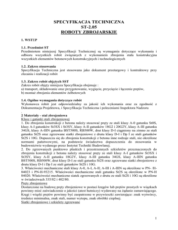 SPECYFIKACJA TECHNICZNA ST-2.05 ROBOTY ZBROJARSKIE 1. WSTEP 1.1. Przedmiot ST Przedmiotem niniejszej Specyfikacji Technicznej są wymagania dotyczące wykonania i odbioru wszystkich robót związanych z wykonaniem zbrojenia stała konstrukcyjna wszystkich elementów betonowych konstrukcyjnych i technologicznych 1.2. Zakres stosowania Specyfikacja Techniczna jest stosowana jako dokument przetargowy i kontraktowy przy zlecaniu i realizacji robót 1.3. Zakres robót objętych SST Zakres robót objęty niniejsza Specyfikacja obejmuje : a) transport, składowanie oraz przygotowanie, wygięcie, przycięcie i łączenie prętów, b) montaŜ zbrojenia elementów Ŝelbetowych 1.4. Ogólne wymagania dotyczące robót Wykonawca robót jest odpowiedzialny za jakość ich wykonania oraz za zgodność z Dokumentacja Projektowa, i Specyfikacja Techniczna i poleceniami Inspektora Nadzoru . 2 Materiały - stal zbrojeniowa Klasy i gatunki stali zbrojeniowej 1. Do zbrojenia konstrukcji z betonu naleŜy stosować pręty ze stali klasy A-0 gatunku St0S, klasy A-I gatunków St3SX i St3SY, klasy A-II gatunków 18G2 i 20G2Y, klasy A-III gatunku 34GS, klasy A-IIIN gatunku BST500S, RB500W, drut klasy D-I ciągniony na zimno ze stali gatunku St2S oraz zgrzewane siatki zbrojeniowe z drutu klasy D-I i Dp I ze stali gatunków St2S i 10G. Dopuszcza się do zbrojenia konstrukcji z betonu inne rodzaje stali, nie określone normami państwowymi, na podstawie świadectwa dopuszczenia do stosowania w budownictwie wydanego przez Instytut Techniki Budowlanej. 2. Do zgrzewanych punktowo płaskich i przestrzennych szkieletów przeznaczonych do zbrojenia konstrukcji z betonu naleŜy stosować pręty ze stali klasy A-I gatunków St3SX i St3SY, klasy A-II gatunku 18G2Y, klasy A-III gatunku 34GS, klasy A-IIIN gatunku BST500S, RB500W, drut klasy D-I ze stali gatunku St2S oraz zgrzewane siatki zbrojeniowe z drutu klasy D-I i Dp I ze stali gatunków St2S i 10G. 3. Właściwości mechaniczne stali klasy A-0, A-I, A-II; A-III i A-IIIN są określone w PN- /H84023 i PN-H-93215. Właściwości mechaniczne stali gatunku St2S są określone w PN-H 84020. Właściwości mechaniczne siatek zgrzewanych z drutu ze stali St2S i 10G są określone w świadectwach 335/82 i 402/80. Pręty zbrojeniowe Dostarczone na budowę pręty zbrojeniowe w postaci kręgów lub prętów prostych w wiązkach powinny mieć zaświadczenie o jakości (atest hutniczy) wydawany na Ŝądanie zamawiającego. Kręgi i wiązki prętów powinny być zaopatrzone w przywieszki zawierające: znak wytwórcy, średnice minimalna, znak stali, numer wytopu, znak obróbki cieplnej. Siatki zbrojeniowe i szkielety zgrzewane 1 Do zbrojenia konstrukcji z betonu mogą być stosowane zgrzewane siatki zbrojeniowe standardowe lub typowe. Siatki powinny być wykonane z prętów z drutu gładkiego lub profilowanego na zimno, krzyŜujących się pod katem 90°, o rozstawie co 50 i 75 mm lub krotności tych wymiarów i połaczonych za pomoca elektrycznego zgrzewania punktowego (garbowego). Do zbrojenia konstrukcji z betonu mogą być stosowane zgrzewane płaskie i przestrzenne szkielety zbrojeniowe. Płaskie szkielety zbrojeniowe w postaci prefabrykowanych elementów zbrojeń konstrukcji z betonu powinny być wykonywane ze stalowych prętów prostych krzyŜujących się pod katem 90°, połączonych za pomocą elektrycznego zgrzewania punktowego (garbowego) w miejscach styków. Przestrzenne szkielety zbrojeniowe naleŜy wykonywać z płaskich szkieletów zbrojeniowych i pojedynczych prętów stalowych połączonych za pomocą elektrycznego zgrzewania punktowego (garbowego) lub spawania elektrycznego łukowego. 3.Sprzet Prace zbrojarskie naleŜy wykonywać specjalistycznymi urządzeniami – giętarkami, prostowarkami, noŜycami i innymi stanowiącymi wyposaŜenie zbrojarni. Sprzęt ma spełniać wymogi BHP , osoby go obsługujące powinny być odpowiednio przeszkolone. 4.Transport Materiały mogą być przewoŜone środkami transportu przystosowanymi do tego typu materiałów. Podczas transportu naleŜy przestrzegać wymagań PN- H-01105 5 Wykonanie robót Oczyszczanie prętów zbrojeniowych Pręty stalowe, przed ich uŜyciem do wkładek zbrojeniowych zgodnie z projektem, naleŜy oczyścić z kurzu, ziemi, zgorzeliny, luźnej rdzy, tłustych plam lub innych zanieczyszczeń. Prostowanie i ciecie prętów zbrojeniowych W przypadku prostowania stali metoda wyciągania - stanowiska pracy, miejsca zamocowania prętów oraz trasę z obu stron toru wyciągowego naleŜy zabezpieczyć ogrodzeniem chroniącym pracowników. Na terenie ogrodzonym zabronione jest: - przebywanie ,pracownikom wzdłuŜ wyciąganego pręta zbrojeniowego w czasie prostowania stali, - przebywanie osób nie zatrudnionych przy prostowaniu, - organizowanie innych stanowisk roboczych i składowisk. Przy cieciu prętów zbrojeniowych naleŜy przestrzegać następujących zasad: - w przypadku ciecia prętów noŜycami ręcznymi naleŜy cięty pręt oprzeć obustronnie na kozłach lub stole zbrojarskim - ciecie prętów o średnicy większej niŜ 20 mm noŜycami jest zabronione, - przy mechanicznym przecinaniu prętów chwytanie ręka prętów w odległości mniejszej niŜ 50 cm od noŜyc tnących jest zabronione. Gięcie prętów zbrojeniowych Przy gięciu prętów zbrojeniowych naleŜy przestrzegać następujących zasad: - gięcie prętów o średnicy do 20 mm moŜe być wykonywane ręcznie lub mechanicznie, - pręty o średnicy większej ni_ 20 mm mogą być odginane wyłącznie za pomocą urządzeń mechanicznych, 2 - gięcie prętów o średnicy powyŜej 30 mm w stanie ogrzanym naleŜy ograniczyć tylko do stali walcowanych na gorąco i przy zachowaniu szczegółowych wytycznych dla tego rodzaju gięcia, stanowiących załącznik do dokumentacji technicznej robót zbrojarskich, - zakładanie prętów, przestawianie odbojnic lub trzpieni przy gięciu prętów zbrojeniowych na mechanicznej giętarce dopuszczalne jest tylko przy u
