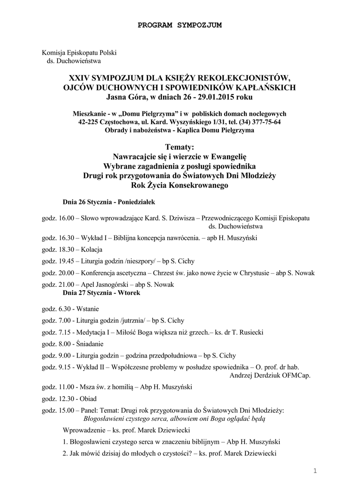 PROGRAM SYMPOZJUM Komisja Episkopatu Polski ds. Duchowieństwa XXIV SYMPOZJUM DLA KSIĘŻY REKOLEKCJONISTÓW, OJCÓW DUCHOWNYCH I SPOWIEDNIKÓW KAPŁAŃSKICH Jasna Góra, w dniach 26 - 29.01.2015 roku Mieszkanie - w „Domu Pielgrzyma” i w pobliskich domach noclegowych 42-225 Częstochowa, ul. Kard. Wyszyńskiego 1/31, tel. (34) 377-75-64 Obrady i nabożeństwa - Kaplica Domu Pielgrzyma Tematy: Nawracajcie się i wierzcie w Ewangelię Wybrane zagadnienia z posługi spowiednika Drugi rok przygotowania do Światowych Dni Młodzieży Rok Życia Konsekrowanego Dnia 26 Stycznia - Poniedziałek godz. 16.00 – Słowo wprowadzające Kard. S. Dziwisza – Przewodniczącego Komisji Episkopatu ds. Duchowieństwa godz. 16.30 – Wykład I – Biblijna koncepcja nawrócenia. – apb H. Muszyński godz. 18.30 – Kolacja godz. 19.45 – Liturgia godzin /nieszpory/ – bp S. Cichy godz. 20.00 – Konferencja ascetyczna – Chrzest św. jako nowe życie w Chrystusie – abp S. Nowak godz. 21.00 – Apel Jasnogórski – abp S. Nowak Dnia 27 Stycznia - Wtorek godz. 6.30 - Wstanie godz. 7.00 - Liturgia godzin /jutrznia/ – bp S. Cichy godz. 7.15 - Medytacja I – Miłość Boga większa niż grzech.– ks. dr T. Rusiecki godz. 8.00 - Śniadanie godz. 9.00 - Liturgia godzin – godzina przedpołudniowa – bp S. Cichy godz. 9.15 - Wykład II – Współczesne problemy w posłudze spowiednika – O. prof. dr hab. Andrzej Derdziuk OFMCap. godz. 11.00 - Msza św. z homilią – Abp H. Muszyński godz. 12.30 - Obiad godz. 15.00 – Panel: Temat: Drugi rok przygotowania do Światowych Dni Młodzieży: Błogosławieni czystego serca, albowiem oni Boga oglądać będą Wprowadzenie – ks. prof. Marek Dziewiecki 1. Błogosławieni czystego serca w znaczeniu biblijnym – Abp H. Muszyński 2. Jak mówić dzisiaj do młodych o czystości? – ks. prof. Marek Dziewiecki 1 3. „Ruch czystych serc” i inne formy wychowania w czystości – ks. prof. Marek Dziewiecki godz. 16.00 - Przerwa godz. 16.30 - Wymiana myśli na tematy poruszone w panelu godz. 18.30 - Kolacja godz. 19.45 - Liturgia godzin (nieszpory) –bp S. Cichy godz. 20.00 - Konferencja ascetyczna: Tajemnica krzyża – bp P. Socha godz. 21.00 - Apel Jasnogórski – Bp P. Socha Dnia 28 Stycznia - Środa godz. 6.30 - Wstanie godz. 7.00 - Liturgia godzin –bp S. Cichy godz. 7.15 - Medytacja II – Kapłan sługa miłosierdzia i jedności. – ks. T. Rusiecki godz. 8.00 - Śniadanie godz. 9.00 - Liturgia godzin –bp S. Cichy godz. 9.15 - Wykład III – Rok życia konsekrowanego – bp K. Gurda 1. Założenia duszpasterskie i duchowe obchodów Roku życia konsekrowanego. bp K. Gurda 2. Relacje wzajemne osób konsekrowanych i duszpasterzy diecezjalnych. – ks. prowincjał Janusz Sok CSSR godz. 11.00 - Msza św. z homilią – bp K. Gurda godz. 12.30 - Obiad godz. 15.00 - Nabożeństwo pokutne – bp S. Cichy godz. 15.45 - Adoracja Najść. Sakramentu i okazja do Spowiedzi św. godz. 17.45 - Modlitwa różańcowa przed Najśw. Sakramentem i błogosławieństwo godz. 18.30 - Kolacja godz. 19.45 - Liturgia godzin /nieszpory/ – bp S. Cichy godz. 20.00 - Konferencja ascetyczna: Znaczenie krzyża w przestrzeni publicznej – bp P. Socha godz. 21.00 - Apel Jasnogórski – bp S. Cichy Dnia 29 Stycznia – Czwartek godz. 6.30 - Wstanie godz. 7.00 - Liturgia godzin /jutrznia/ godz. 7.15 - Medytacja III – Co dzień trzeba się nawracać – ks. dr T. Rusiecki godz. 8.00 - Śniadanie godz. 9.00 - Liturgia godzin - godzina ranna – bp S. Cichy godz. 9.15 - Wykład IV: – Święci spowiednicy: 1. Bł. ks. Michał Sopoćko – bp H. Ciereszko 2. Bł. o. Honorat Koźmiński – o. Piotr Stasiński OFMCap. 2 godz. 11.00 - Msza św. z homilią – bp Damian Bryl godz. 12.30 - Obiad i rozjazd U w a g a: 1. Odpowiedzialny za liturgię godzin – bp S. Cichy 2. Do udziału w Sympozjum zapraszamy: - PT Ojców Duchownych Diecezjalnych i Dekanalnych, - Rekolekcjonistów, głoszących konferencje dla kapłanów - Spowiedników kapłanów i osób konsekrowanych oraz - Kapłanów zainteresowanych problematyką podaną w programie. 3. Obrady i ćwiczenia duchowne odbywają się w kaplicy Domu Pielgrzyma. 4. Noclegi należy zamawiać w Domu Pielgrzyma, w Hospicjum lub innym domu dostępnym w pobliżu Jasnej Góry. 5. Ze względu na charakter ściśle modlitewny i formacyjny Sympozjum, Kapłani uczestniczący w nim mogą uzyskać zaświadczenie o odprawionych rekolekcjach kapłańskich. 3