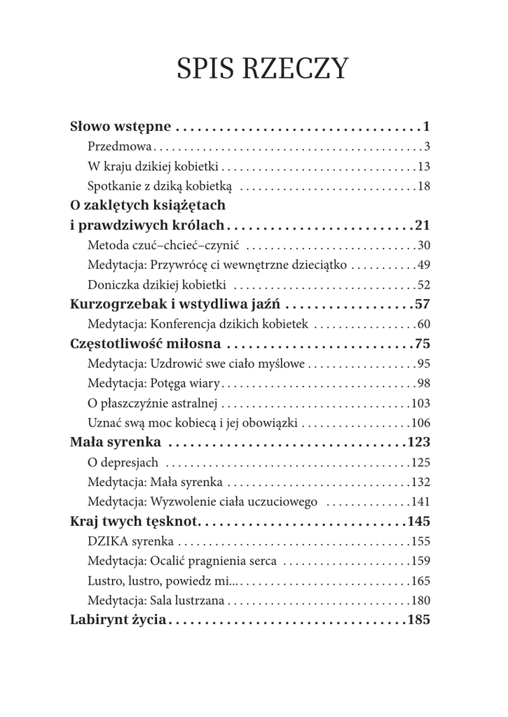 SPIS RZECZY Słowo wstępne . . . . . . . . . . . . . . . . . . . . . . . . . . . . . . . . . . 1 Przedmowa . . . . . . . . . . . . . . . . . . . . . . . . . . . . . . . . . . . . . . . . . . . 3 W kraju dzikiej kobietki . . . . . . . . . . . . . . . . . . . . . . . . . . . . . . . 13 Spotkanie z dziką kobietką . . . . . . . . . . . . . . . . . . . . . . . . . . . . . 18 O zaklętych książętach i prawdziwych królach . . . . . . . . . . . . . . . . . . . . . . . . . 21 Metoda czuć–chcieć–czynić . . . . . . . . . . . . . . . . . . . . . . . . . . . . 30 Medytacja: Przywrócę ci wewnętrzne dzieciątko . . . . . . . . . . 49 Doniczka dzikiej kobietki . . . . . . . . . . . . . . . . . . . . . . . . . . . . . . 52 Kurzogrzebak i wstydliwa jaźń . . . . . . . . . . . . . . . . . . 57 Medytacja: Konferencja dzikich kobietek . . . . . . . . . . . . . . . . 60 Częstotliwość miłosna . . . . . . . . . . . . . . . . . . . . . . . . . . 75 Medytacja: Uzdrowić swe ciało myślowe . . . . . . . . . . . . . . . . . 95 Medytacja: Potęga wiary . . . . . . . . . . . . . . . . . . . . . . . . . . . . . . . 98 O płaszczyźnie astralnej . . . . . . . . . . . . . . . . . . . . . . . . . . . . . . 103 Uznać swą moc kobiecą i jej obowiązki . . . . . . . . . . . . . . . . . . 106 Mała syrenka . . . . . . . . . . . . . . . . . . . . . . . . . . . . . . . . . 123 O depresjach . . . . . . . . . . . . . . . . . . . . . . . . . . . . . . . . . . . . . . . . 125 Medytacja: Mała syrenka . . . . . . . . . . . . . . . . . . . . . . . . . . . . . 132 Medytacja: Wyzwolenie ciała uczuciowego . . . . . . . . . . . . . . 141 Kraj twych tęsknot . . . . . . . . . . . . . . . . . . . . . . . . . . . . 145 DZIKA syrenka . . . . . . . . . . . . . . . . . . . . . . . . . . . . . . . . . . . . . 155 Medytacja: Ocalić pragnienia serca . . . . . . . . . . . . . . . . . . . . . 159 Lustro, lustro, powiedz mi... . . . . . . . . . . . . . . . . . . . . . . . . . . . 165 Medytacja: Sala lustrzana . . . . . . . . . . . . . . . . . . . . . . . . . . . . . 180 Labirynt życia . . . . . . . . . . . . . . . . . . . . . . . . . . . . . . . . 185