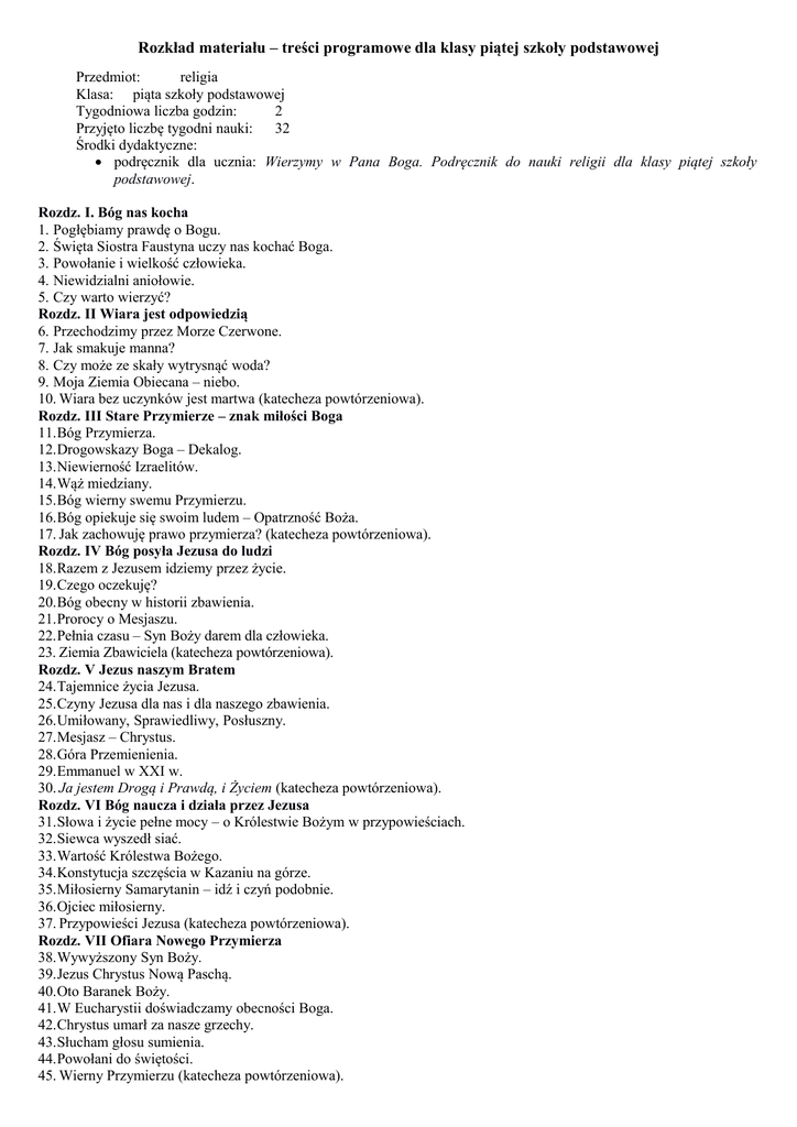 Rozkład materiału – treści programowe dla klasy piątej szkoły podstawowej Przedmiot: religia Klasa: piąta szkoły podstawowej Tygodniowa liczba godzin: 2 Przyjęto liczbę tygodni nauki: 32 Środki dydaktyczne: podręcznik dla ucznia: Wierzymy w Pana Boga. Podręcznik do nauki religii dla klasy piątej szkoły podstawowej. Rozdz. I. Bóg nas kocha 1. Pogłębiamy prawdę o Bogu. 2. Święta Siostra Faustyna uczy nas kochać Boga. 3. Powołanie i wielkość człowieka. 4. Niewidzialni aniołowie. 5. Czy warto wierzyć? Rozdz. II Wiara jest odpowiedzią 6. Przechodzimy przez Morze Czerwone. 7. Jak smakuje manna? 8. Czy może ze skały wytrysnąć woda? 9. Moja Ziemia Obiecana – niebo. 10. Wiara bez uczynków jest martwa (katecheza powtórzeniowa). Rozdz. III Stare Przymierze – znak miłości Boga 11.Bóg Przymierza. 12.Drogowskazy Boga – Dekalog. 13.Niewierność Izraelitów. 14.Wąż miedziany. 15.Bóg wierny swemu Przymierzu. 16.Bóg opiekuje się swoim ludem – Opatrzność Boża. 17. Jak zachowuję prawo przymierza? (katecheza powtórzeniowa). Rozdz. IV Bóg posyła Jezusa do ludzi 18.Razem z Jezusem idziemy przez życie. 19.Czego oczekuję? 20.Bóg obecny w historii zbawienia. 21.Prorocy o Mesjaszu. 22.Pełnia czasu – Syn Boży darem dla człowieka. 23. Ziemia Zbawiciela (katecheza powtórzeniowa). Rozdz. V Jezus naszym Bratem 24.Tajemnice życia Jezusa. 25.Czyny Jezusa dla nas i dla naszego zbawienia. 26.Umiłowany, Sprawiedliwy, Posłuszny. 27.Mesjasz – Chrystus. 28.Góra Przemienienia. 29.Emmanuel w XXI w. 30. Ja jestem Drogą i Prawdą, i Życiem (katecheza powtórzeniowa). Rozdz. VI Bóg naucza i działa przez Jezusa 31.Słowa i życie pełne mocy – o Królestwie Bożym w przypowieściach. 32.Siewca wyszedł siać. 33.Wartość Królestwa Bożego. 34.Konstytucja szczęścia w Kazaniu na górze. 35.Miłosierny Samarytanin – idź i czyń podobnie. 36.Ojciec miłosierny. 37. Przypowieści Jezusa (katecheza powtórzeniowa). Rozdz. VII Ofiara Nowego Przymierza 38.Wywyższony Syn Boży. 39.Jezus Chrystus Nową Paschą. 40.Oto Baranek Boży. 41.W Eucharystii doświadczamy obecności Boga. 42.Chrystus umarł za nasze grzechy. 43.Słucham głosu sumienia. 44.Powołani do świętości. 45. Wierny Przymierzu (katecheza powtórzeniowa). Rozdz. VIII Chrystus naszą Paschą 46.Poranek zmartwychwstania. 47.Chrystus pokonał śmierć. 48.W drodze do Emaus. 49.Jezus umacnia naszą wiarę. 50.Eucharystia pokarmem na życie wieczne. 51.Siedzi po prawicy Ojca. 52.Chrystus powróci. 53. Trzeciego dnia zmartwychwstał (katecheza powtórzeniowa). Rozdz. IX Kocham Boga i ludzi 54.Serce całego Prawa – przykazanie miłości. 55.Dekalog – prawo miłości Boga. 56.Dekalog – prawo miłości bliźniego. 57.Pan Bóg pomaga nam żyć dobrze. 58.Z Świętą Siostrą Faustyną okazujemy miłosierdzie. 59.Jestem dobry dla innych. 60. Tablice Dekalogu moimi płucami (katecheza powtórzeniowa). Rozdz. X Moja odpowiedź Bogu 61.Lolek turysta i sportowiec. 62.Eucharystia – moja odpowiedź. 63.Codziennie będę się karmił Słowem Bożym. 64.W ręku Garncarza. 65. Poznaję i szanuję innych Kryteria oceniania z religii dla klasy piątej szkoły podstawowej Na ocenę celującą uczeń: – Opanował materiał przewidziany programem w stopniu bardzo dobrym. – Samodzielnie i twórczo rozwija własne zainteresowania przedmiotem. – Bierze udział i osiąga sukcesy w konkursach religijnych i zajmuje wysokie miejsca lub wyróżnienia. – Biegle posługuje się zdobytą wiedzą, posiada wiedzę wykraczającą poza program nauczania klasy czwartej. – Jest wzorem i przykładem dla innych uczniów. – Posiada uzupełniony zeszyt i podręcznik do nauki religii. Na ocenę bardzo dobrą uczeń: – Zna modlitwy i mały katechizm: Ojcze nasz, Zdrowaś Mario, Dekalog, Sakramenty, Modlitwa przed nauką, Przykazania kościelne, Uczynki miłosierne co do ciała, Uczynki miłosierne co do duszy, Cztery cnoty główne, Duszo Chrystusowa, Grzechy cudze, Grzechy przeciw Duchowi Świętemu, Grzechy wołające o pomstę do nieba, Siedem grzechów głównych, Anioł Pański, Koronka do Bożego Miłosierdzia. – Wymienia prawdy o człowieku zawarte w Księdze Rodzaju. – Wymienia zadania aniołów w historii zbawienia i podaje imiona archaniołów. – Wyjaśnia, na czym polega istota grzechu, przyczyny i skutki. – Wie, kim była i dlaczego warto naśladować św. s. Faustynę – patronkę roku. – Wyjaśnia rolę Mojżesza w dziejach Izraela. – Porównuje paschę Izraelitów i Paschę chrześcijan, – Opisuje, w jaki sposób Bóg troszczył się o Izraelitów podczas wędrówki do Ziemi Obiecanej. – Wyjaśnia analogie między przejściem przez Morze Czerwone a chrztem świętym; manną na pustyni a eucharystią, wodą ze skały a łaską bożą, Ziemią Obiecaną a niebem. – Wyjaśnia i wskazuje, dlaczego konieczne jest rozwijanie wiary i w jaki sposób chrześcijanin utrwala relacje z Bogiem. – Wymienia przymioty Boga. – Uzasadnia, że dekalog jest wyrazem miłości i troski Boga o człowieka i w Jego świetle ocenia własne postępowanie. – Wyjaśnia analogię między wężem miedzianym na pustyni a krzyżem Chrystusa. – Wyjaśnia konieczność formacji sumienia w zachowaniu przymierza z Bogiem i wyjaśnia, dlaczego człowiek powołany set do świętości. – Ukazuje, jak można do życia ludzi odnieść prawdę niewierności Izraelitów i Bożym przebaczeniu. – Wymienia przejawy miłości Boga w historii zbawienia. – Wymienia imiona proroków zapowiadających przyjście Mesjasza i zna proroctwa zapowiadające Mesjasza. – Wyjaśnia, na czym polega powtórne przyjście Chrystusa. – Opowiada o życiu Świętej Rodziny w Nazarecie. – Uzasadnia, że Jezus jest Bogiem i człowiekiem. – Wyjaśnia misję Jana Chrzciciela – Rozumie, że warunkiem przynależności do Królestwa Bożego jest nawrócenie, wiara, przyjęcie Ewangelii. – Podaje przykłady realizowania zasad Kr