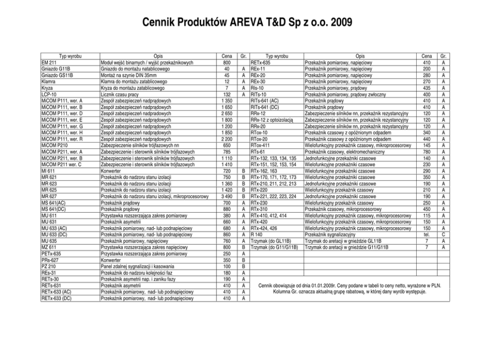 Cennik Produktów AREVA T&D Sp z o.o. 2009 Typ wyrobu EM 211 Gniazdo G11B Gniazdo GS11B Klamra Kryza LCP-10 MiCOM P111, wer. A MiCOM P111, wer. B MiCOM P111, wer. D MiCOM P111, wer. E MiCOM P111, wer. G MiCOM P111, wer. H MiCOM P111, wer. R MiCOM P210 MiCOM P211, wer. A MiCOM P211, wer. B MiCOM P211 wer. C MI 611 MR 621 MR 623 MR 625 MR 627 MS 641(AC) MS 641(DC) MU 611 MU 631 MU 633 (AC) MU 633 (DC) MU 635 MZ 611 PETx-635 PRs-627 PZ 210 REs-31 RETs-30 RETs-631 RETx-633 (AC) RETx-633 (DC) Opis Moduł wejść binarnych / wyjść przekaźnikowych Gniazdo do montażu natablicowego Montaż na szynie DIN 35mm Klamra do montażu zatablicowego Kryza do montażu zatablicowego Licznik czasu pracy Zespół zabezpieczeń nadprądowych Zespół zabezpieczeń nadprądowych Zespół zabezpieczeń nadpradowych Zespół zabezpieczeń nadprądowych Zespół zabezpieczeń nadprądowych Zespół zabezpieczeń nadprądowych Zespół zabezpieczeń nadprądowych Zabezpieczenie silników trójfazowych nn Zabezpieczenie i sterownik silników trójfazowych Zabezpieczenie i sterownik silników trójfazowych Zabezpieczenie i sterownik silników trójfazowych Konwerter Przekaźnik do nadzoru stanu izolacji Przekaźnik do nadzoru stanu izolacji Przekaźnik do nadzoru stanu izolacji Przekaźnik do nadzoru stanu izolacji, mikroprocesorowy Przekaźnik prądowy Przekaźnik prądowy Przystawka rozszerzająca zakres pomiarowy Przekaźnik asymetrii Przekaźnik pomiarowy, nad- lub podnapięciowy Przekaźnik pomiarowy, nad- lub podnapięciowy Przekaźnik pomiarowy, napięciowy Przystawka rozszerzająca zakres napięciowy Przystawka rozszerzająca zakres pomiarowy Konwerter Panel zdalnej sygnalizacji i kasowania Przekaźnik do nadzoru kolejności faz Przekaźnik asymetrii nap. i zaniku fazy Przekaźnik asymetrii Przekaźnik pomiarowy, nad- lub podnapięciowy Przekaźnik pomiarowy, nad- lub podnapięciowy Cena 800 40 45 12 7 132 1 350 1 650 2 650 1 800 1 200 1 850 2 200 650 785 1 110 1 410 720 750 1 360 1 420 3 490 700 880 380 660 680 860 760 800 250 350 100 180 190 410 410 410 Gr. A A A A A B B B B B A A A A A A A B A B B A A A A A Typ wyrobu RETx-635 REx-11 REx-20 REx-30 RIs-10 RITs-10 RITs-641 (AC) RITs-641 (DC) RRx-12 RRx-12 z optoizolacją RRx-20 RTox-10 RTox-20 RTox-411 RTs-61 RTx-132, 133, 134, 135 RTx-151, 152, 153, 154 RTx-162, 163 RTx-170, 171, 172, 173 RTx-210, 211, 212, 213 RTx-220 RTx-221, 222, 223, 224 RTx-230 RTx-310 RTx-410, 412, 414 RTx-420 RTx-424, 426 R 140 Trzymak (do GL11B) Trzymak (do G11/G11B) Opis Przekaźnik pomiarowy, napięciowy Przekaźnik pomiarowy, napięciowy Przekaźnik pomiarowy, napięciowy Przekaźnik pomiarowy, napięciowy Przekaźnik pomiarowy, prądowy Przekaźnik pomiarowy, prądowy zwłoczny Przekaźnik prądowy Przekaźnik prądowy Zabezpieczenie silników nn, przekaźnik rezystancyjny Zabezpieczenie silników nn, przekaźnik rezystancyjny Zabezpieczenie silników nn, przekaźnik rezystancyjny Przekaźnik czasowy z opóźnionym odpadem Przekaźnik czasowy z opóźnionym odpadem Wielofunkcyjny przekaźnik czasowy, mikroprocesorowy Przekaźnik czasowy, elektromechaniczny Jednofunkcyjne przekaźniki czasowe Wielofunkcyjne przekaźniki czasowe Wielofunkcyjne przekaźniki czasowe Wielofunkcyjne przekaźniki czasowe Jednofunkcyjne przekaźniki czasowe Wielofunkcyjny przekaźnik czasowy Jednofunkcyjne przekaźniki czasowe Wielofunkcyjny przekaźnik czasowy Przekaźnik czasowy, mikroprocesorowy Wielofunkcyjny przekaźnik czasowy, mikroprocesorowy Wielofunkcyjny przekaźnik czasowy, mikroprocesorowy Wielofunkcyjny przekaźnik czasowy, mikroprocesorowy Przekaźnik sygnalizacyjny Trzymak do aretacji w gnieździe GL11B Trzymak do aretacji w gnieździe G11/G11B Cena 410 200 280 270 435 400 410 410 120 120 120 340 440 145 780 140 230 290 350 190 210 190 250 450 115 150 150 tel. 7 7 Gr. A A A A A A A A A A A A A A A A A A A A A A A A A A A C A A Cennik obowiązuje od dnia 01.01.2009r. Ceny podane w tabeli to ceny netto, wyrażone w PLN. Kolumna Gr. oznacza aktualną grupę rabatową, w której dany wyrób występuje.