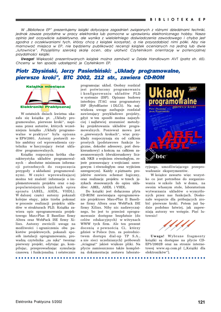 B I B L I O T E K A E P W „Bibliotece EP” prezentujemy książki dotyczące zagadnień związanych z różnymi dziedzinami techniki, jednak zawsze przydatne w pracy elektronika lub pomocne w uprawianiu elektronicznego hobby. Nasza opinia jest oczywiście subiektywna, ale wynika z wieloletniego doświadczenia zawodowego i chyba jest zgodna z oczekiwaniami tych, którzy chcą z książek korzystać, a nie przyozdabiać nimi półki. Aby nie marnować miejsca w EP, nie będziemy publikować recenzji książek ocenianych na jedną lub dwie „lutownice”. Przyjęliśmy szeroką skalę ocen, aby ułatwić Czytelnikom orientację w potencjalnej przydatności książki. Uwaga! Większość prezentowanych książek można zamówić w Dziale Handlowym AVT (patrz str. 65). Chcemy w ten sposób udostępnić je Czytelnikom EP. Piotr Zbysiński, Jerzy Pasierbiński: „Układy programowalne, pierwsze kroki”, BTC 2002, 212 str., zawiera CD−ROM W†ostatnich dniach kwietna ukaza³a siÍ ksi¹øka pt. ìUk³ady programowalne, pierwsze krokiî, napisana przez autorÛw, ktÛrych wczeúniejsza ksi¹øka ìUk³ady programowalne w†praktyceî by³a opisana w†EP9/2001. Autorzy postawili sobie ambitny cel wprowadzenia czytelnika w†fascynuj¹cy úwiat uk³adÛw programowalnych. Ksi¹økÍ rozpoczyna krÛtka charakterystyka uk³adÛw programowalnych - absolutne minimum informacji potrzebnych do rozpoczÍcia przygody z†uk³adami programowalnymi. W†czÍúci wprowadzaj¹cej moøna teø znaleüÊ informacje o†implementowaniu projektu oraz o†najpopularniejszych jÍzykach opisu sprzÍtu (ABEL, AHDL, VHDL). W†dalszej czÍúci autorzy pokazali kolejne etapy, jakie trzeba pokonaÊ w†procesie realizacji projektu uk³adÛw w†strukturach PLD. Ksi¹øka zawiera opis oprogramowania projektowego Max+Plus II Baseline firmy Altera oraz WebPack ISE firmy Xilinx. Autorzy zwrÛcili uwagÍ na moøliwoúci i†ograniczenia obu pakietÛw projektowych, pokazali sposÛb instalacji oprogramowania, prowadz¹ czytelnika ìza rÍkÍî tworz¹c pierwszy projekt, edytuj¹c go, kompiluj¹c, przeprowadzaj¹c symulacjÍ czasow¹ i†funkcjonaln¹ i†ostatecznie programuj¹c uk³ad. Osobny rozdzia³ jest poúwiÍcony programowaniu i†konfigurowaniu uk³adÛw PLD w†systemie (ISP). Opisano budowÍ interfejsu JTAG oraz programatory ISP (ByteBlaster i†DLC5). Na najwiÍksz¹ uwagÍ zas³uguje rozdzia³ zawieraj¹cy przyk³adowe projekty, gdyø w†ten sposÛb moøna najszybciej i†naj³atwiej zrozumieÊ metodykÍ projektowania uk³adÛw programowalnych. Poniewaø mowa jest o†ìpierwszych krokachî, wiÍc przyk³ady rozpoczynaj¹ siÍ od ca³kiem prostych (podstawowe funkcje logiczne, dekoder adresowy, port dwukierunkowy) a†koÒcz¹ na ca³kiem zaawansowanych (dwukierunkowy licznik NKB z†wejúciem rÛwnoleg³ym, rejestr przesuwaj¹cy z†wejúciami szeregowym i†rÛwnoleg³ym oraz wyjúciem szeregowym). Kaødy z†piÍtnastu projektÛw zawiera schemat logiczny, oraz realizacjÍ projektu w†trzech jÍzykach stosowanych do opisu uk³adÛw: ABEL, AHDL i†VHDL. Do ksi¹øki jest do³¹czona p³yta CD-ROM zawieraj¹ca oprogramowanie projektowe Max+Plus II Baseline firmy Altera oraz WebPack ISE firmy Xilinx. Niby nic nadzwyczajnego, bo jest to przecieø oprogramowanie dostÍpne bezp³atnie (do celÛw edukacyjnych) w†witrynach WWW tych firm. Ale ten prezent doceni¹ z†pewnoúci¹ Ci, ktÛrzy gdzieú w†Polsce (tzn. za poúrednictwem dostÍpu dial-up TP S.A., a†nie sieci uczelnianych) prÛbowali ìúci¹gn¹Êî jakieú wiÍksze pliki. Na p³ycie zamieszczono takøe kompletn¹ dokumentacjÍ zestawu laborato- ryjnego, umoøliwiaj¹cego przeprowadzanie eksperymentÛw. W†ksi¹øce zawarto wiÍc wszystko co jest potrzebne do zorganizowania w†szkole lub w†domu, na swoim w³asnym stole, laboratorium wytwarzania uk³adÛw o†wymyúlonych przez nas funkcjach. Doskona³e wsparcie dla prÛbuj¹cych zrobiÊ pierwsze kroki. Potem juø bÍdzie podobno ³atwiej, jak zapewniaj¹ autorzy we wstÍpie. PiÍÊ lutownic! Uwaga! Wybrane fragmenty ksi¹øki s¹ dostÍpne na p³ycie CDEP5/2002B oraz na stronie internetowej www.ep.com.pl (ìKsi¹øki dla elektronikÛwî). ○ ○ ○ ○ ○ ○ ○ ○ ○ ○ ○ ○ ○ ○ ○ ○ ○ ○ ○ ○ ○ ○ ○ ○ ○ ○ ○ ○ ○ ○ ○ ○ ○ ○ ○ ○ ○ ○ ○ ○ ○ ○ ○ ○ ○ ○ ○ ○ ○ ○ ○ ○ ○ ○ ○ ○ ○ ○ ○ ○ ○ ○ ○ ○ Elektronika Praktyczna 5/2002 121