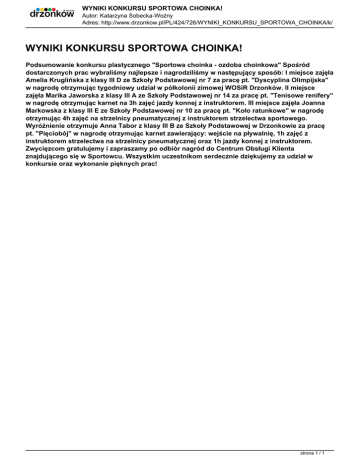 WYNIKI KONKURSU SPORTOWA CHOINKA! Autor: Katarzyna Sobecka-Woźny Adres: http://www.drzonkow.pl/PL/424/726/WYNIKI_KONKURSU_SPORTOWA_CHOINKA/k/ WYNIKI KONKURSU SPORTOWA CHOINKA! Podsumowanie konkursu plastycznego "Sportowa choinka - ozdoba choinkowa" Spośród dostarczonych prac wybraliśmy najlepsze i nagrodziliśmy w następujący sposób: I miejsce zajęła Amelia Kruglińska z klasy III D ze Szkoły Podstawowej nr 7 za pracę pt. "Dyscyplina Olimpijska" w nagrodę otrzymując tygodniowy udział w półkolonii zimowej WOSiR Drzonków. II miejsce zajęła Marika Jaworska z klasy III A ze Szkoły Podstawowej nr 14 za pracę pt. "Tenisowe renifery" w nagrodę otrzymując karnet na 3h zajęć jazdy konnej z instruktorem. III miejsce zajęła Joanna Markowska z klasy III E ze Szkoły Podstawowej nr 10 za pracę pt. "Koło ratunkowe" w nagrodę otrzymując 4h zajęć na strzelnicy pneumatycznej z instruktorem strzelectwa sportowego. Wyróżnienie otrzymuje Anna Tabor z klasy III B ze Szkoły Podstawowej w Drzonkowie za pracę pt. "Pięciobój" w nagrodę otrzymując karnet zawierający: wejście na pływalnię, 1h zajęć z instruktorem strzelectwa na strzelnicy pneumatycznej oraz 1h jazdy konnej z instruktorem. Zwycięzcom gratulujemy i zapraszamy po odbiór nagród do Centrum Obsługi Klienta znajdującego się w Sportowcu. Wszystkim uczestnikom serdecznie dziękujemy za udział w konkursie oraz wykonanie pięknych prac! strona 1 / 1 Powered by TCPDF (www.tcpdf.org)