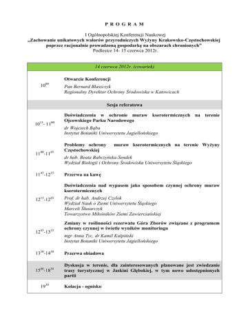 P R O G R A M I Ogólnopolskiej Konferencji Naukowej „Zachowanie unikatowych walorów przyrodniczych Wyżyny Krakowsko-Częstochowskiej poprzez racjonalnie prowadzoną gospodarkę na obszarach chronionych” Podlesice 14- 15 czerwca 2012r. 14 czerwca 2012r. (czwartek) Otwarcie Konferencji 00 10 Pan Bernard Błaszczyk Regionalny Dyrektor Ochrony Środowiska w Katowicach Sesja referatowa 1015- 1100 1100-1145 1145-1215 Doświadczenia w ochronie muraw kserotermicznych na terenie Ojcowskiego Parku Narodowego dr Wojciech Bąba Instytut Botaniki Uniwersytetu Jagiellońskiego Problemy ochrony Częstochowskiej muraw kserotermicznych na terenie Wyżyny dr hab. Beata Babczyńska-Sendek Wydział Biologii i Ochrony Środowiska Uniwersytetu Śląskiego Przerwa na kawę Doświadczenia nad wypasem jako sposobem czynnej ochrony muraw kserotermicznych 1215-1245 1245-1315 1330-1430 00 30 15 -18 1930 Prof. dr hab. Andrzej Czylok Wydział Nauk o Ziemi Uniwersytetu Śląskiego Marceli Ślusarczyk Towarzystwo Miłośników Ziemi Zawierciańskiej Zmiany w roślinności rezerwatu Góra Zborów związane z programem ochrony czynnej w świetle wyników monitoringu mgr Anna Tyc, dr Kamil Kulpiński Instytut Botaniki Uniwersytetu Jagiellońskiego Przerwa obiadowa Dyskusja w terenie, dla zainteresowanych planowane jest zwiedzanie trasy turystycznej w Jaskini Głębokiej, w tym nowo udostępnionych partii Kolacja - ognisko 15 czerwca 2012r. (piątek) Sesja z krótkimi wystąpieniami i dyskusją doświadczeń płynących z czynnej ochrony siedlisk muraw kserotermicznych w Polsce 900-920 Doświadczenia w realizacji projektu „Utrzymanie bioróżnorodności siedlisk kserotermicznych w Małopolsce” Regionalna Dyrekcja Ochrony Środowiska w Krakowie 20 40 9 -9 Racjonalne gospodarowanie na obszarach chronionych a ochrona krajobrazu i ochrona przyrody Zespół Parków Krajobrazowych Województwa Śląskiego 940-1000 1000-1015 Cenne przyrodniczo gatunki i ich Parku Krajobrazowego Orlich Gniazd siedliska na obszarze dr Barbara Majchrzak, dr Cezary Gębicki Akademia im. Jana Długosza w Częstochowie Rezerwat Góra Zborów i okolice. Przyczynkowe rozpoznanie wybranej entomofauny (Lepidoptera, Orthoptera, Odonata, Coleoptera, Hemiptera), jako wskaźnika w przemianach preferowanych środowisk i szaty roślinnej w kontekście prowadzonych zabiegów ochrony czynnej z uwzględnieniem restytucji pazia żeglarza Iphiclides podalirius Marcin Kutera Polskie Towarzystwo Entomologiczne – sekcja lepidopterologiczna 1015-1030 Przerwa na kawę 30 00 10 -11 Dyskusja z udziałem zaproszonych przedstawicieli jednostek i osób prywatnych prowadzących działania związane z czynną ochroną siedlisk muraw kserotermicznych 00 00 Sesja terenowa - poświęcona utrzymaniu siedlisk przyrodniczych w kontekście zachowania krajobrazu kulturowego pasma skalnego Mirów-Bobolice 11 -14 1400 – 1500 Przerwa obiadowa Podsumowanie Konferencji 1500-1530 Pani Jolanta Prażuch Zastępca Regionalnego Dyrektora Ochrony Środowiska w Katowicach Regionalny Konserwator Przyrody