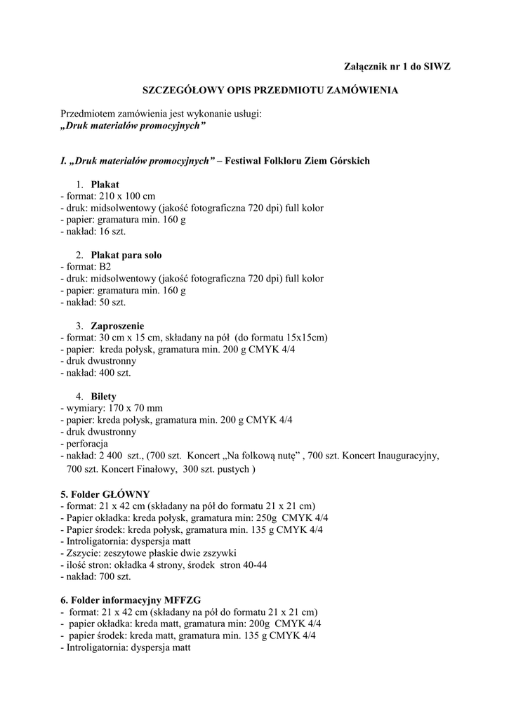Załącznik nr 1 do SIWZ SZCZEGÓŁOWY OPIS PRZEDMIOTU ZAMÓWIENIA Przedmiotem zamówienia jest wykonanie usługi: „Druk materiałów promocyjnych” I. „Druk materiałów promocyjnych” – Festiwal Folkloru Ziem Górskich 1. Plakat - format: 210 x 100 cm - druk: midsolwentowy (jakość fotograficzna 720 dpi) full kolor - papier: gramatura min. 160 g - nakład: 16 szt. 2. Plakat para solo - format: B2 - druk: midsolwentowy (jakość fotograficzna 720 dpi) full kolor - papier: gramatura min. 160 g - nakład: 50 szt. 3. Zaproszenie - format: 30 cm x 15 cm, składany na pół (do formatu 15x15cm) - papier: kreda połysk, gramatura min. 200 g CMYK 4/4 - druk dwustronny - nakład: 400 szt. 4. Bilety - wymiary: 170 x 70 mm - papier: kreda połysk, gramatura min. 200 g CMYK 4/4 - druk dwustronny - perforacja - nakład: 2 400 szt., (700 szt. Koncert „Na folkową nutę” , 700 szt. Koncert Inauguracyjny, 700 szt. Koncert Finałowy, 300 szt. pustych ) 5. Folder GŁÓWNY - format: 21 x 42 cm (składany na pół do formatu 21 x 21 cm) - Papier okładka: kreda połysk, gramatura min: 250g CMYK 4/4 - Papier środek: kreda połysk, gramatura min. 135 g CMYK 4/4 - Introligatornia: dyspersja matt - Zszycie: zeszytowe płaskie dwie zszywki - ilość stron: okładka 4 strony, środek stron 40-44 - nakład: 700 szt. 6. Folder informacyjny MFFZG - format: 21 x 42 cm (składany na pół do formatu 21 x 21 cm) - papier okładka: kreda matt, gramatura min: 200g CMYK 4/4 - papier środek: kreda matt, gramatura min. 135 g CMYK 4/4 - Introligatornia: dyspersja matt - zszycie: zeszytowe płaskie dwie zszywki - ilość stron: okładka 4 strony, środek 40-44 strony - nakład: 8.000 szt. 7. Wkładka do folderu głównego - format: 21 x 42 cm (składany na pół do formatu 21 x 21 cm) - Papier: kreda połysk, gramatura min. 130 g CMYK 4/4 - Introligatornia: Dyspresja matt - zszycie: zeszytowe płaskie dwie zszywki - ilość stron: 4 strony - nakład: 700 szt. 8. Wkładka do folderu informacyjnego - format: 21 x 42 cm (składany na pół do formatu 21 x 21 cm) - Papier: kreda połysk, gramatura min. 130 g CMYK 4/4 - Introligatornia: Dyspresja matt - zszycie: zeszytowe płaskie dwie zszywki - ilość stron: 4 strony - nakład: 8.000 szt. 9. Plakaty do citylightów - format: 186 x 113,5 cm - druk: midsolwentowy (jakość fotograficzna 720 dpi) full kolor - papier: gramatura min. 130 g - nakład: 16 szt. (2 projekty po 8 szt.) 10. Ulotka –mapka - format: A3 - papier: kreda połysk, gramatura min. 160 g CMYK 4/4 - druk dwustronny - klejone w układzie poziomych z krótszego boku po 100 szt.* - nakład: 5.000 szt. *(Ulotki w celu lepszej ich dystrybucji mają być klejone (w celu ich łatwego wyrywania przez turystów), po lewym, krótszym boku. Ilość mapek w jednym bloku po 100 szt.) 11. afisz z programem koncertów wersja polska - format: B1 - druk: midsolwentowy (jakość fotograficzna 720 dpi) full kolor - papier: gramatura min. 160 g - nakład: 60 szt. 12. afisz z programem koncertów wersja angielska, - format: B1 - druk: midsolwentowy (jakość fotograficzna 720 dpi) full kolor - papier: gramatura min. 160 g - nakład: 40 szt. 14. Ulotka – śpiewnik - format: A4 w układzie poziomym, składany na 3 2 - papier: kreda mat, gramatura min. 160 g CMYK 4/4 - druk dwustronny - nakład: 900 szt. 15. Plakat koncertu Na Folkową Nutę - format: B2 - druk: midsolwentowy (jakość fotograficzna 720 dpi) full kolor - papier: gramatura min. 160 g - nakład: 50 szt. 16. Pocztówka festiwalowa - format: A6 - druk: dwustronny - papier: kreda połysk, gramatura min: 350g CMYK 4/4 - nakład: 2000 szt. 17. Plakat Dziecięcy na wystawę w Parku - format: format 135 x 90 cm - druk: midsolwentowy (jakość fotograficzna 720 dpi) full kolor - papier: gramatura min. 160 g - nakład: 18 szt. II. „Druk materiałów promocyjnych” - Miejska Galeria Sztuki 1. Katalog: - format: A4 - Papier okładka: kreda połysk o gramaturze 300 g, lakier dyspersyjny CMYK 4/4 - Papier środek: kreda połysk o gramaturze 135g , CMYK 4/4 - Introligatornia: Dyspersja matt - Zszycie: zeszytowe płaskie dwie zszywki - ilość stron: okładka 4 strony, środek stron 36 - nakład: 300 szt. x 2 projekty 2. Zaproszenie: - format: DL - papier: kreda połysk, gramatura 250 g CMYK 4/4 - druk dwustronny w układzie poziomym - nakład: 500 szt. x 7 projektów 3. Plakaty - Format: B2 - druk: midsolwentowy full kolor - papier: gramatura 160g - nakład: 70 szt. x 7 projektów 4.. Plakaty do citylightów - format: 186 x 113,5 cm - druk: midsolwentowy full kolor - papier: gramatura 130g - nakład: 30 szt. (w tym 5 projektów) 3 III. „Druk materiałów promocyjnych” - ogólne 1. Mapa Zakopanego ulotka - format: A3 - papier: kreda połysk, gramatura min. 160 g CMYK 4/4 - druk dwustronny - klejone w układzie poziomym z krótszego boku po 100 szt.* - nakład: 10.000 szt. *(Ulotki w celu lepszej ich dystrybucji mają być klejone (w celu ich łatwego wyrywania przez turystów), po lewym, krótszym boku. Ilość mapek w jednym bloku po 100 szt.) 2. Katalog z wydarzeniami: - Format: 140 mm szer. x 200 mm wys. - Papier okładka: kreda połysk, gramatura min. 250g CMYK 4/4 - Papier środek: kreda połysk, gramatura min. 130 g CMYK 4/4 - Introligatornia: dyspersja matt - Laminat błysk na 1 stronie okładki - Zszycie: zeszytowe płaskie, dwie zszywki - Nakład: a) sierpień - 15.000 szt. wersja polska, 2.000 szt. wersja angielska, ilość stron: okładka 4 strony, środek 32 lub 36 strony b) wrzesień - 10.000 szt. wersja polska, 1.000 szt. wersja angielska, ilość stron: okładka 4 strony, środek 28 lub 32 strony c) październik-listopad – 10.000 szt. wersja polska, 1.000 szt. wersja angielska, ilość stron: okładka 4 strony, środek 24 lub 28 strony d) grudzień - styczeń – 15.000 szt., 2.000 szt. wersja angielska, ilość stron: okładka 4 strony, środek 36 lub 40 strony 3. Katalog – Festiwal Organowy: - format: 21 x 42 cm (składany na pół do format