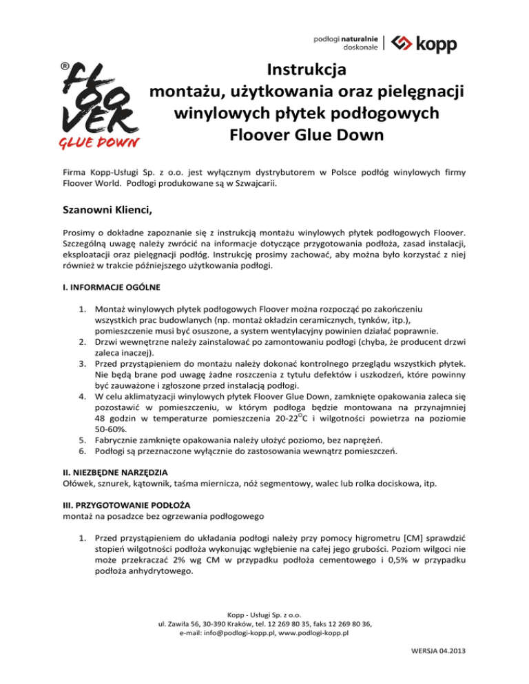 Instrukcja montażu, użytkowania oraz pielęgnacji winylowych płytek podłogowych Floover Glue Down Firma Kopp-Usługi Sp. z o.o. jest wyłącznym dystrybutorem w Polsce podłóg winylowych firmy Floover World. Podłogi produkowane są w Szwajcarii. Szanowni Klienci, Prosimy o dokładne zapoznanie się z instrukcją montażu winylowych płytek podłogowych Floover. Szczególną uwagę należy zwrócić na informacje dotyczące przygotowania podłoża, zasad instalacji, eksploatacji oraz pielęgnacji podłóg. Instrukcję prosimy zachować, aby można było korzystać z niej również w trakcie późniejszego użytkowania podłogi. I. INFORMACJE OGÓLNE 1. Montaż winylowych płytek podłogowych Floover można rozpocząć po zakończeniu wszystkich prac budowlanych (np. montaż okładzin ceramicznych, tynków, itp.), pomieszczenie musi być osuszone, a system wentylacyjny powinien działać poprawnie. 2. Drzwi wewnętrzne należy zainstalować po zamontowaniu podłogi (chyba, że producent drzwi zaleca inaczej). 3. Przed przystąpieniem do montażu należy dokonać kontrolnego przeglądu wszystkich płytek. Nie będą brane pod uwagę żadne roszczenia z tytułu defektów i uszkodzeń, które powinny być zauważone i zgłoszone przed instalacją podłogi. 4. W celu aklimatyzacji winylowych płytek Floover Glue Down, zamknięte opakowania zaleca się pozostawić w pomieszczeniu, w którym podłoga będzie montowana na przynajmniej 48 godzin w temperaturze pomieszczenia 20-22OC i wilgotności powietrza na poziomie 50-60%. 5. Fabrycznie zamknięte opakowania należy ułożyć poziomo, bez naprężeń. 6. Podłogi są przeznaczone wyłącznie do zastosowania wewnątrz pomieszczeń. II. NIEZBĘDNE NARZĘDZIA Ołówek, sznurek, kątownik, taśma miernicza, nóż segmentowy, walec lub rolka dociskowa, itp. III. PRZYGOTOWANIE PODŁOŻA montaż na posadzce bez ogrzewania podłogowego 1. Przed przystąpieniem do układania podłogi należy przy pomocy higrometru [CM] sprawdzić stopień wilgotności podłoża wykonując wgłębienie na całej jego grubości. Poziom wilgoci nie może przekraczać 2% wg CM w przypadku podłoża cementowego i 0,5% w przypadku podłoża anhydrytowego. Kopp - Usługi Sp. z o.o. ul. Zawiła 56, 30-390 Kraków, tel. 12 269 80 35, faks 12 269 80 36, e-mail: [email protected], www.podlogi-kopp.pl WERSJA 04.2013 2. W celu zagwarantowania najwyższej jakości montażu oraz trwałości podłogi montaż powinien być wykonany na odpowiednio przygotowanym, mocnym, stabilnym i suchym podłożu, np.: a) samopoziomujące, cementowe masy szpachlowe b) płyty drewnopochodne, np. OSB, V100, płyty gipsowo-włóknowe c) odpowiednio przygotowane istniejące podłoża użytkowe, takie jak lastryko, okładziny ceramiczne, drewniane itp. 3. Wszelkie nierówności powyżej 2 mm na długości 2 metrów powinny być zniwelowane. 4. Przed rozpoczęciem montażu płaszczyznę podłoża należy sprawdzić używając poziomicy o długości co najmniej 2 metrów. 5. Do przyklejania winylowych płytek Floover należy stosować najwyższej jakości kleje dyspersyjne np.: Wakol D3318, Wakol D3320, Bostik Power Elastic, Thomsit K 188 S. IV. UKŁADANIE PODŁOGI montaż na posadzce bez ogrzewania podłogowego 1. Należy wykonać dokładne pomiary pomieszczenia oraz wyznaczyć dwie prostopadłe do siebie linie przechodzące przez jego środek. Trzeba pamiętać, aby szerokość docinanych do ścian płytek nie była mniejsza niż 5 cm. Aby temu zapobiec, należy sprawdzić odległość linii od ścian i odpowiednio skorygować ich położenie. 2. Aby osiągnąć jak najbardziej atrakcyjny efekt należy po otwarciu opakowań przemieszać płytki. 3. Klej należy nanosić zgodnie z instrukcją techniczną zawartą na opakowaniu. 4. Układanie płytek rozpoczynamy od wyznaczonego liniami środka pomieszczenia, posuwając się w kierunku ścian. V. UKŁADANIE PODŁOGI montaż na posadzce z ogrzewaniem podłogowym 1. Płytki podłogowe Floover Glue Down mogą być instalowane na wodnym systemie ogrzewania podłogowego. 2. System ogrzewania podłogowego musi zostać zamontowany przez profesjonalnego montażystę, zgodnie z wytycznymi producenta. 3. Warunkiem rozpoczęcia montażu płytek winylowych Floover Glue Down jest przedłożenie przez inwestora: a) protokołu odbioru instalacji ogrzewania podłogowego sporządzonego przez montażystę systemu ogrzewania podłogowego, b) protokołu wygrzewania podłoża sporządzonego przez montażystę systemu ogrzewania podłogowego, c) protokołu przedwykonawczego, sporządzonego przez montażystę podłogi, określającego jakość oraz wilgotność podłoża. 4. Przed przystąpieniem do układania podłogi należy przy pomocy higrometru [CM] sprawdzić stopień wilgotności podłoża wykonując wgłębienie na całej jego grubości. Poziom wilgoci nie może przekraczać 1,8% wg CM w przypadku podłoża cementowego i 0,3% w przypadku podłoża anhydrytowego. Kopp - Usługi Sp. z o.o. ul. Zawiła 56, 30-390 Kraków, tel. 12 269 80 35, faks 12 269 80 36, e-mail: [email protected], www.podlogi-kopp.pl WERSJA 04.2013 5. System ogrzewania podłogowego powinien być włączony co najmniej 10 dni przed rozpoczęciem montażu i ustawiony na temperaturę 25-30oC. Ogrzewanie podłogowe należy wyłączyć co najmniej 48 godzin przed klejeniem płytek. Po montażu podłogi należy ponownie włączyć ogrzewanie i zwiększać temperaturę grzania co 2-3OC dziennie, aż do osiągnięcia maksymalnej wartości temperatury. Maksymalna temperatura podłoża w trakcie eksploatacji nie może być wyższa niż 27OC. 6. Po zamontowaniu podłogi należy utrzymywać wilgotność w pomieszczeniu na poziomie 45-65%. W sezonie grzewczym zalecane jest zastosowanie nawilżaczy powietrza, co w zapobiega powstawaniu szczelin pomiędzy płytkami. VI. PIELĘGNACJA Do codziennej pielęgnacji wystarczy zmywanie podłogi wodą z dodatkiem łagodnego detergentu. Do okresowego odświeżania (w zależ