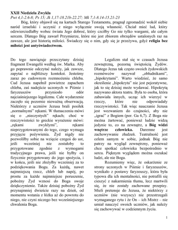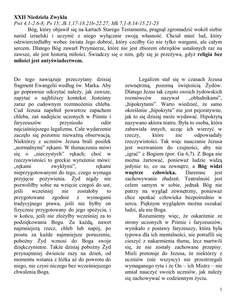 XXII Niedziela Zwykła Pwt 4,1-2.6-8; Ps 15; Jk 1,17-18.21b-22.27; Mk 7,1-8.14-15.21-23 Bóg, który objawił się na kartach Starego Testamentu, pragnął zgromadzić wokół siebie naród izraelski i uczynić z niego wyłącznie swoją własność. Chciał mieć lud, który odzwierciedlałby wobec świata Jego dobroć, który czciłby Go nie tylko wargami, ale całym sercem. Dlatego Bóg zawarł Przymierze, które nie jest zbiorem obrzędów ustalonych raz na zawsze, ale jest historią miłości. Świadczy się o nim, gdy się je przeżywa, gdyż religia bez miłości jest antyświadectwem. Do tego nawiązuje przeczytany dzisiaj fragment Ewangelii według św. Marka. Aby go poprawnie odczytać należy, jak zawsze, zapytać o najbliższy kontekst. Jesteśmy zaraz po cudownym rozmnożeniu chleba. Cud Jezusa napełnił powietrze zapachem chleba, zaś nadejście uczonych w Piśmie i faryzeuszów przyniosło odór najciaśniejszego legalizmu. Całe wydarzenie zaczęło się pozornie nieważną obserwacją. Niektórzy z uczniów Jezusa brali posiłek „normalnymi” rękami. W tłumaczeniu mówi się o „nieczystych” rękach; choć w rzeczywistości to greckie wyrażenie mówi: „rękami zwykłymi”, rękami nieprzygotowanymi do tego, czego wymaga przyjęcie pożywienia. Żyd nigdy nie pozwoliłby sobie na wzięcie czegoś do ust, jeśli wcześniej nie zostałoby to przygotowane zgodnie z wymogami tradycyjnego prawa, jeśli nie byłby on fizycznie przygotowany do jego spożycia, i w końcu, jeśli nie złożyłby wcześniej za to podziękowania Bogu. Za każdą, nawet najmniejszą rzecz, chleb lub napój, po prostu za każde najmniejsze poruszenie, pobożny Żyd wznosi do Boga swoje dziękczynienie. Także dzisiaj pobożny Żyd przynajmniej dwieście razy na dzień, od momentu wstania z łóżka aż do powrotu do niego, nie czyni niczego bez wcześniejszego chwalenia Boga. Legalizm stał się w czasach Jezusa zewnętrzną, pozorną świętością Żydów. Dlatego Jezus tak często swoich żydowskich rozmówców nazywał „obłudnikami”, „hipokrytami”. Warto wiedzieć, że samo określenie „hipokryta” nie jest pejoratywne, jak to się dzisiaj może wydawać. Hipokrytą nazywano aktora teatru. Była to osoba, która zabawiała innych, ucząc ich wierzyć w rzeczy, które nie odpowiadały rzeczywistości. Tak więc nauczanie Jezusa jest wezwaniem do czujności, aby nie „igrać” z Bogiem (por. Ga 6,7). Z Boga nie można żartować, ponieważ ludzie widzą jedynie to, co na zewnątrz, a Bóg widzi wnętrze człowieka. Daremne jest zachowywanie złudzeń. Teatralność jest celem samym w sobie, jednak Bóg nie patrzy na wygląd zewnętrzny, ponieważ chce spotkać człowieka bezpośrednio w sercu. Pięknym wyglądem można oszukać ludzi, ale nie Boga. Rozumiemy więc, że oskarżenie ze strony uczonych w Piśmie i faryzeuszów, wynikało z postawy faryzeuszy, która była typowa dla ich mentalności, nie potrafili się cieszyć z nakarmienia tłumu, lecz martwili się, że nie zostały zachowane przepisy. Mieli pretensje do Jezusa, że niektórzy z uczniów (nie wszyscy) nie przestrzegali wymaganego rytu i że On – ich Mistrz – nie umiał nauczyć swoich uczniów, jak należy się zachowywać w codziennym życiu. 1 Mowa Jezusa, sprowokowana przez te zarzuty, zawiera kilka wątków… Perykopę liturgiczną pozbawiono kilku wersetów, a szkoda! Jezus najpierw dokonał rozróżnienia między tym, co należy do Tory i stanowi serce przymierza a tym, co przynależy do „ogrodzenia” zbudowanego przez ludzi wokół Tory. Kiedy Bóg dał Torę wyraźnie powiedział: „Nic nie dodacie do tego, co ja wam nakazuję, i nic z tego nie odejmiecie…). Ogrodzenie (płot dla Tory), zbudowane zostało w dobrej wierze - celem obrony istoty Tory. Powstały więc wszystkie przezorne zalecenia, dodano drobne przepisy chroniące Torę, które na koniec zamiast pozwolić żyć, przeszkadzały. Przez te „ludzkie dodatki” człowiek został ujarzmiony, stał się ich niewolnikiem i nie wiedział, jak się od nich uwolnić. Z czego to wszystko powstało? To „tradycja ludzka”, „tradycja starożytnych”, po prostu „tradycja”; Jezus powie: „wasza tradycja”. Sam Jezus respektował tę „ludzką tradycję”, jednak przestrzegając ją, relatywizował wiele, często absurdalnych, nakazów i zakazów. Nie mamy tutaj negatywnego nastawienia Jezusa do tradycji ojców, lecz jest prośba, aby mieć „oczy otwarte”; tradycja jest ważna, lecz równocześnie niebezpieczna. W wielu przypadkach ludzkie dodatki, wyjaśnienia, tradycje spowodowały zastąpienie Słowa Bożego. Dlatego Jezus przypomniał, że prymat został dany Słowu Bożemu. Odwołał się do słów proroka Izajasza: „Ten lud czci mnie wargami, lecz sercem swym daleko jest ode Mnie. Ale czci Mnie na próżno, ucząc zasad podanych przez ludzi” (Mk 7,6). W ten sposób Jezus wykroczył poza absurdy legalizmu, sprowadzając wszystko do tego, co istotne: do serca człowieka. I mówił dalej: „Słuchajcie Mnie wszyscy i zrozumcie! Nic nie wchodzi z zewnątrz w człowieka, co mogłoby uczynić go nieczystym, lecz co wychodzi z człowieka, to czyni człowieka nieczystym” (w. 15). Jeden z uczonych żydowskich zalicza te słowa Jezusa do „największych słów w dziejach religii”. Rzeczywiście są one wyjątkowe. Jezus zagadnięty o rzeczy czyste i nieczyste, postawił problem w zupełnie innym świetle: nie można mówić o tym, co czyste, a co nieczyste, pomijając serce człowieka - „z wnętrza bowiem, z serca ludzkiego pochodzą złe myśli” (Mk 7,21). Tym, stwierdzeniem wskazuje nam na ostateczny i główny korzeń tych wszystkich zachowań, które prowadzą do podziałów i do zniszczenia wspólnoty ludzkiej... Głębokie ich źródło znajduje się - mówi nam Jezus - „w sercu”, to znaczy, w miejscu naszych decyzji, naszych wyborów, naszych uczuć. Wartość człowieka określana jest przez jego mi