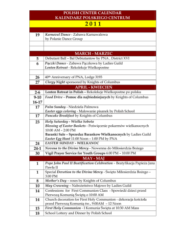 POLISH CENTER CALENDAR KALENDARZ POLSKIEGO CENTRUM 2011 19 Karnaval Dance - Zabawa Karnawalowa by Polanie Dance Group MARCH - MARZEC 5 6 26 27 Debutant Ball – Bal Debiutantow by PNA , District XVI Pączki Dance - Zabawa Pączkowa by Ladies Guild Lenten Retreat - Rekolekcje Wielkopostne 40th Anniversary of PNA, Lodge 3193 Clergy Night sponsored by Knights of Columbus APRIL - KWIECIEŃ Lenten Retreat in Polish – Rekolekcje Wielkopostne po polsku Food Drive – Pomoc dla najbiedniejszych by Knights of Columbus 2-6 9-10 16-17 17 Palm Sunday - Niedziela Palmowa 17 23 24 24-1 30 Easter eggs coloring - Malowanie pisanek by Polish School Pancake Breakfast by Knights of Columbus Holy Saturday - Wielka Sobota Blessing of Easter Baskets - Poświęcenie pokarmów wielkanocnych 10:00 AM – 2:00 PM Baranki Sale – Sprzedaz Barankow Wielkanocnych by Ladies Guild Easter Egg Hunt 11:00 Noon – 1:00 PM by PNA EASTER SUNDAY - WIELKANOC Novena to the Divine Mercy - Nowenna do Miłosierdzia BoŜego Vigil Prayer Service for Youth Groups 6:00 PM – 10:00 PM MAY - MAJ 1 1 8 10 14 14 15 18 Pope John Paul II Beatification Celebration – Beatyfikacja PapieŜa Jana Pawła II Special Devotion to the Divine Mercy - Święto Miłosierdzia BoŜego – 3:00 PM Mother’s Day – roses by Knights of Columbus May Crowning – NaboŜeństwo Majowe by Ladies Guild Confessions for First Communion Class - Spowiedź dzieci przed Pierwszą Komunią Świętą o 10:00 AM Church decoration for First Holy Communion - dekoracja kościoła przed Pierwszą Komunią św., 9:00AM – 12 Noon First Holy Communion - I Komunia Święta at 10:30 AM Mass School Lottery and Dinner by Polish School JUNE - CZERWIEC 11 12 19 End of Polish School Year - Zakończenie roku szkolnego Proud to be Polish Festival - Polish-American Congress Father’s Day - Dzień Ojca JULY - LIPIEC VACATION TIME AUGUST - SIERPIEŃ 7 20 28 Polish American Day by PNA Lodge 3193 Steak Fry by Knights of Columbus Commemoration of Polish Patriotic Anniversaries of the XX Century obchód Polskich Rocznic Patriotycznych XX Wieku by Polish American Congress SEPTEMBER - WRZESIEŃ 17-18 Harvest Festival - DoŜynki 24 Polish School begins - Początek Polskiej Szkoły OCTOBER - PAŹDZIERNIK Commemoration of anniversary of election of Pope John Paul II and anniversary of Fr. Jerzy Popiełuszko martyrdom NOVEMBER - LISTOPAD Ladies Guild Memorial Mass for deceased members Polish Independence Day - obchód rocznicy Niepodległości Polski Msza św. 10:30 AM – Program by Leszek Piestrzeniewicz 12-13 Food Drive – pomoc dla najbiedniejszych by Knights of Columbus 7 6 19-20 13 9:00 AM Memorial Mass for deceased members - Knights of Columbus 19 St. Andrew’s Feast Dance - Andrzejki by PNA Piast Group DECEMBER - GRUDZIEŃ Light up for Christ Christmas Billboard and Christmas Dinner by 3 Knights of Columbus 10-11 Food Drive - pomoc dla najbiedniejszych by Knights of Columbus 17-18 31 Nativity play and Christmas Eve Dinner – Jasełka, Opłatek, Wigilia by Polish School New Year’s Eve Dance - Bal Sylwestrowy - Center Fundraiser 2012 JANUARY - STYCZEŃ 8 New Year’s Caroling – singing and dancing – Noworoczne Kolędowanie – śpiew i tańce, by Polanie Dance Group Free throw contest by Knights of Columbus