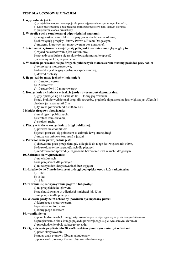 TEST DLA UCZNIÓW GIMNAZJUM 1. Wyprzedzanie jest to: a) przejeżdżanie obok innego pojazdu poruszającego się w tym samym kierunku, b) tylko przejeżdżanie obok pieszego poruszającego się w tym samym kierunku c) przejeżdżanie obok przeszkody 2. W strefie ruchu oznakowanej odpowiednimi znakami : a) mają zastosowanie takie przepisy jak w strefie zamieszkania, b) obowiązują przepisy Ustawy Prawo o Ruchu Drogowym, c) możemy kierować tam motorowerem bez uprawnień. 3. Jeżeli na skrzyżowaniu znajduje się policjant i ma uniesioną rękę w górę to: a) wjazd na skrzyżowanie jest zabroniony, b) pojazdy znajdujące się na skrzyżowaniu muszą je opuścić c) czekamy na kolejne polecenie. 4. W trakcie poruszania się po drogach publicznych motorowerem musimy posiadać przy sobie: a) tylko kartę motorowerową, b) dowód rejestracyjny i polisę ubezpieczeniową, c) dowód osobisty 5. Ile pojazdów może jechać w kolumnie?: a) 10 motorowerów b) 15 rowerów c) 10 rowerów i 10 motorowerów 6. Korzystanie z chodnika w trakcie jazdy rowerem jest dopuszczalne: a) gdy opiekuje się on osobą do lat 10 kierującą rowerem b) gdy brakuje wydzielonej drogi dla rowerów, prędkość dopuszczalna jest większa jak 50km/h i chodnik jest szerszy niż 2 m c) tylko w godzinach od 23.00 do 5.00 7 Kodeks drogowy obowiązuje: a) na drogach publicznych, b) strefach zamieszkania, c) strefach ruchu 8. Pieszy w trakcie korzystania z drogi publicznej: a) porusza się chodnikiem b) jeżeli porusza się poboczem to zajmuje lewą stronę drogi c) może warunkowo korzystać z jezdni 9. Przechodzenie przez jezdnie jest: a) dozwolone poza przejściem gdy odległość do niego jest większa niż 100m, b) dozwolone tylko na przejściach dla pieszych c) niedozwolone spowoduje zagrożenie bezpieczeństwa w ruchu drogowym 10. Zabrania się wyprzedzania: a) na wiaduktach b) na przejściach dla pieszych c) na wszystkich skrzyżowaniach bez wyjątku 11. dziecko do lat 7 może korzystać z drogi pod opieką osoby która ukończyła: a) 10 lat b) 15 lat c) 18 lat 12. zabrania się zatrzymywania pojazdu lub postoju: a) na przejeździe kolejowym, b) na skrzyżowaniu w odległości mniejszej jak 15 m c) na przejściu dla pieszych 13. W czasie jazdy hełm ochronny powinien być używany przez: a) kierującego motorowerem, b) pasażera motoroweru c) kierującego rowerem 14. wymijanie to: a) przechodzenie obok innego użytkownika poruszającego się w przeciwnym kierunku b) przejeżdżanie obok innego pojazdu poruszającego się w tym samym kierunku c) przechodzenie obok stojącego pojazdu 15. Ograniczenie prędkości do 30 km/h znakiem pionowym może być odwołane : a) przez skrzyżowanie b) przez znak pionowy Obszar zabudowany c) przez znak pionowy Koniec obszaru zabudowanego 16. kierujący rowerem: a) przejeżdża ostatni b) ustępuje pierwszeństwa motocyklowi c) ma pierwszeństwo przed samochodem 17. Kierujący rowerem: a) przejeżdża pierwszy b) przejeżdża ostatni c) ustępuje pierwszeństwa samochodowi 18. Kierujący rowerem a) znajduje się na drodze z pierwszeństwem przejazdu b) przejeżdża pierwszy c) udziela pierwszeństwa motocyklowi 19. Na tym skrzyżowaniu rowerzysta: a) przejeżdża pierwszy, b) ustępuje pierwszeństwa autobusowi, c) przejeżdża ostatni 20. Na tym skrzyżowaniu rowerzysta; a) powinien się zatrzymać, b) przejeżdża ostatni, c) warunkowo może wjechać na skrzyżowanie 21. jaką pierwszą czynność wykonujemy na miejscu wypadku drogowego gdy są osoby ranne:. a) zabezpieczamy miejsce w celu zapobieżenia kolejnym zdarzeniom . b)udzielamy od razu pomocy ofiarom wypadku c) powiadamiamy służby ratunkowe 22. krwotok zewnętrzny z żyły należy tamować a) tylko opaską uciskową b) opatrunkiem uciskowym c) tylko bandażem 23. jaką należy zachować kolejność przy zakładaniu opatrunku na ranę: a) wata i bandaż b) gaza, wata i bandaż c) wata i plaster 24. jeżeli u ofiary wypadku drogowego nastąpiło zatrzymanie krążenia i oddechu to wykonujemy: a) najpierw masaż serca w celu przywrócenia akcji b). najpierw sztuczne oddychanie w celu przywrócenia samodzielnego oddechu c) przemiennie masaż serca i sztuczne oddychanie 25. Jeżeli ofiara wypadku doznała złamania otwartego kończyny górnej to należy w pierwszej kolejności: a)pozostawić ją i oczekiwać na przybycie lekarza b) zatamować krwotok i unieruchomić złamaną kończynę w celu uniemożliwienia przemieszczania się odłamów kostnych c) okrywamy kocem, aby nie następowała utrata ciepłoty ciała