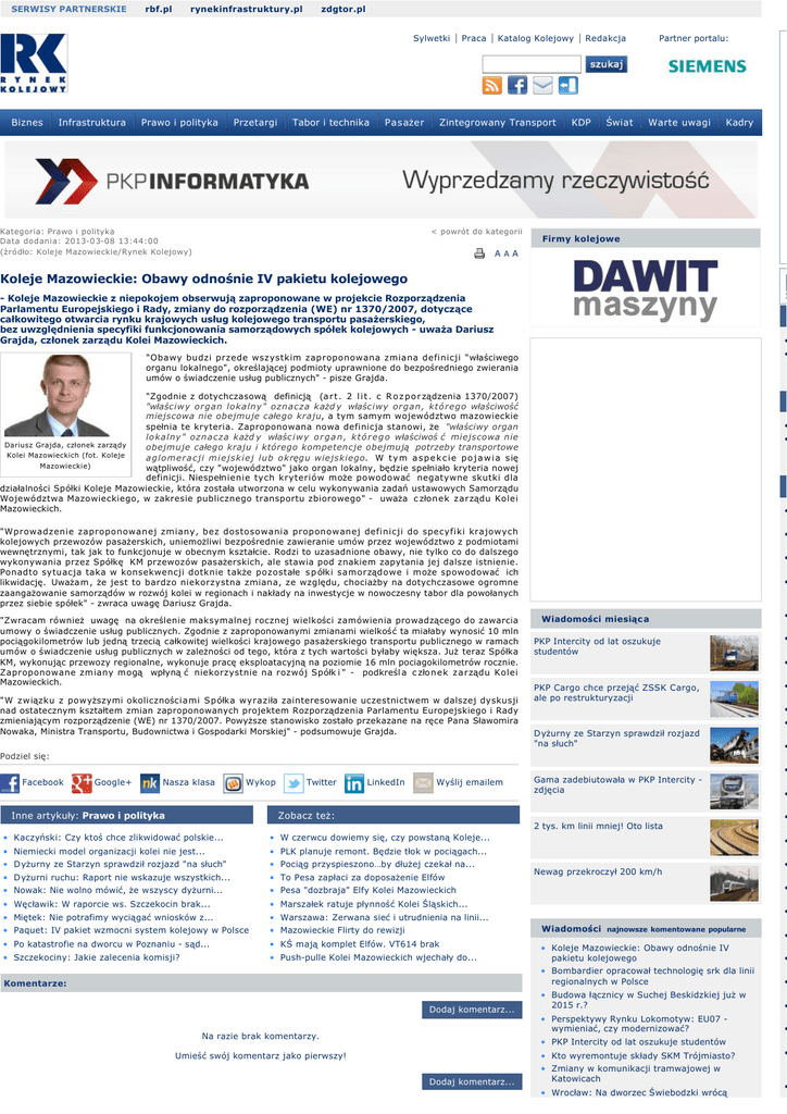 SERWISY PARTNERSKIE rbf.pl rynekinfrastruktury.pl zdgtor.pl Sylwetki Biznes Infrastruktura Prawo i polityka Przetargi Tabor i technika Pasażer Kategoria: Prawo i polityka Data dodania: 2013-0 3-08 13:44:00 (źródło: Koleje Mazowieckie/Rynek Kolejowy) Praca Katalog Kolejowy Zintegrowany Transport < powrót do kategorii Redakcja KDP Świat Partner portalu: Warte uwagi Kadry Firmy kolejowe A AA Koleje Mazowieckie: Obawy odnośnie IV pakietu kolejowego - Koleje Mazowieckie z niepokojem obserwują zaproponowane w projekcie Rozporządzenia Parlamentu Europejskiego i Rady, zmiany do rozporządzenia (WE) nr 1370/2007, dotyczące całkowitego otwarcia rynku krajowych usług kolejowego transportu pasażerskiego, bez uwzględnienia specyfiki funkcjonowania samorządowych spółek kolejowych - uważa Dariusz Grajda, członek zarządu Kolei Mazowieckich. P • • "Obawy budzi przede wszystkim zaproponowana zmiana definicji "właściwego organu lokalnego", określającej podmioty uprawnione do bezpośredniego zwierania umów o świadczenie usług publicznych" - pisze Grajda. "Zgodnie z dotychczasową definicją (a r t . 2 l i t . c R o z p o r ządzenia 1370/2007) "właściwy organ lokalny" oznacza każd y właściwy organ, którego właściwość miejscowa nie obejmuje całego kraju, a tym samym województwo mazowieckie spełnia te kryteria. Zaproponowana nowa definicja stanowi, że "właściwy organ lokalny" oznacza każd y właśc i w y o r g a n , k t ó r e g o właściwoś ć miejscowa nie Dariusz Grajda, członek zarządy obejmuje całego kraju i którego kompetencje obejmują potrzeby transportowe Kolei Mazowieckich (fot. Koleje a g l o m e r a c j i m i e j s k i e j l u b o k ręgu wiejskiego. W t y m a s p e k c i e p o j a w i a s ię Mazowieckie) wątpliwość, czy "województwo" jako organ lokalny, będzie spełniało kryteria nowej definicji. Niespełnienie tych kryteriów może powodować negatywne skutki dla działalności Spółki Koleje Mazowieckie, która została utworzona w celu wykonywania zadań ustawowych Samorządu Województwa Mazowieckiego, w zakresie publicznego transportu zbiorowego" - uważa c złonek zarządu Kolei Mazowieckich. K • • N • "Wprowadzenie zaproponowanej zmiany, bez dostosowania proponowanej definicji do specyfiki krajowych kolejowych przewozów pasażerskich, uniemożliwi bezpośrednie zawieranie umów przez województwo z podmiotami wewnętrznymi, tak jak to funkcjonuje w obecnym kształcie. Rodzi to uzasadnione obawy, nie tylko co do dalszego wykonywania przez Spółkę KM przewozów pasażerskich, ale stawia pod znakiem zapytania jej dalsze istnienie. Ponadto sytuacja taka w konsekwencji dotknie także pozostałe s p ółki samorządowe i może spowodować ich likwidację. Uważa m , że jest to bardzo niekorzystna zmiana, ze względu, chociażby na dotychczasowe ogromne zaangażowanie samorządów w rozwój kolei w regionach i nakłady na inwestycje w nowoczesny tabor dla powołanych przez siebie spółek" - zwraca uwagę Dariusz Grajda. "Zwracam również uwagę na określenie maksymalnej rocznej wielkości zamówienia prowadzącego do zawarcia umowy o świadczenie usług publicznych. Zgodnie z zaproponowanymi zmianami wielkość ta miałaby wynosić 10 mln pociągokilometrów lub jedną trzecią całkowitej wielkości krajowego pasażerskiego transportu publicznego w ramach umów o świadczenie usług publicznych w zależności od tego, która z tych wartości byłaby większa. Już teraz Spółka KM, wykonując przewozy regionalne, wykonuje pracę eksploatacyjną na poziomie 16 mln pociagokilometrów rocznie. Zaproponowane zmiany mogą wpłyną ć niekorzystnie na rozwój Spółk i " - podkreśl a c zło n e k z a r ządu Kolei Mazowieckich. "W związku z powyższymi okolicznościami Spółka wyraziła zainteresowanie uczestnictwem w dalszej dyskusji nad ostatecznym kształtem zmian zaproponowanych projektem Rozporządzenia Parlamentu Europejskiego i Rady zmieniającym rozporządzenie (WE) nr 1370/2007. Powyższe stanowisko zostało przekazane na ręce Pana Sławomira Nowaka, Ministra Transportu, Budownictwa i Gospodarki Morskiej" - podsumowuje Grajda. • • • Wiadomości miesiąc a • PKP Intercity od lat oszukuje studentów • • PKP Cargo chce przejąć ZSSK Cargo, ale po restrukturyzacji • • • Dyżurny ze Starzyn sprawdził rozjazd "na słuch" • Podziel się: • Facebook Google+ Nasza klasa Wykop Inne artykuły: Prawo i polityka Twitter LinkedIn Wyślij emailem Gama zadebiutowała w PKP Intercity zdjęcia Zobacz też: • • 2 tys. km linii mniej! Oto lista • Kaczyński: Czy ktoś chce zlikwidować polskie... • W czerwcu dowiemy się, czy powstaną Koleje... • Niemiecki model organizacji kolei nie jest... • PLK planuje remont. Będzie tłok w pociągach... • Dyżurny ze Starzyn sprawdził rozjazd "na słuch" • Pociąg przyspieszono…by dłużej czekał na... • Dyżurni ruchu: Raport nie wskazuje wszystkich... • To Pesa zapłaci za doposażenie Elfów • Nowak: Nie wolno mówić, że wszyscy dyżurni... • Pesa "dozbraja" Elfy Kolei Mazowieckich • Węcławik: W raporcie ws. Szczekocin brak... • Marszałek ratuje płynność Kolei Śląskich... • Miętek: Nie potrafimy wyciągać wniosków z... • Warszawa: Zerwana sieć i utrudnienia na linii... • Paquet: IV pakiet wzmocni system kolejowy w Polsce • Mazowieckie Flirty do rewizji Wiadomości najnowsze komentowane popularne • Po katastrofie na dworcu w Poznaniu - sąd... • KŚ mają komplet Elfów. VT614 brak • Szczekociny: Jakie zalecenia komisji? • Push-pulle Kolei Mazowieckich wjechały do... • Koleje Mazowieckie: Obawy odnośnie IV pakietu kolejowego • • Bombardier opracował technologię srk dla linii regionalnych w Polsce • • Budowa łącznicy w Suchej Beskidzkiej już w 2015 r.? • • Perspektywy Rynku Lokomotyw: EU07 wymieniać, czy modernizować? • Komentarze: Dodaj komentarz... Na razie brak komentarzy. • New