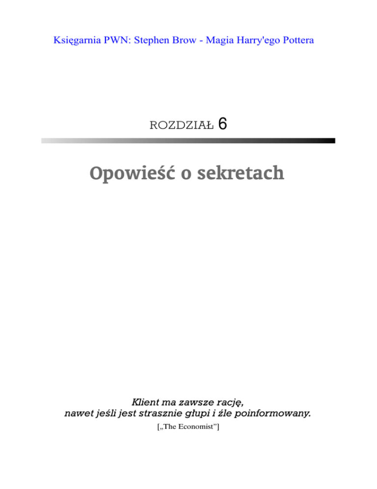 Księgarnia PWN: Stephen Brow - Magia Harry'ego Pottera ROZDZIAŁ 6 Opowieść o sekretach Klient ma zawsze rację, nawet jeśli jest strasznie głupi i źle poinformowany. [„The Economist”] 6.1. Drażnienie proszę 77 6.1. Drażnienie proszę Jeśli istnieje jedno słowo, które zawiera w sobie sens sprzedaży Harry’ego Pottera, to jest nim drażnienie. Najbardziej pobieżny rzut oka na stronę internetową Joanne Rowling ujawnia, że właśnie drażnienie konsumenta jest jej ulubioną metodą marketingową. Triki, rebusy, zagadki, podpuchy, tajemne pokoje i inne łamigłówki są rozsiane po całej stronie stworzonej przez samą autorkę1. Podrzuca tam podpowiedzi na temat zakończenia sagi, losu bohaterów, wskazówki dotyczące poszczególnych epizodów i znaczenia tytułów nadchodzących książek („Nie mogę ujawnić tytułu ostatniej książki. Mój wydawca by mnie zabił!”). Co więcej, dręczy czytelników pytaniami dotyczącymi kwestii ostatecznych: Kto będzie następny? Czy Harry przeżyje? Czy Ron jest już trupem? Dumbledore jest skazany na porażkę, prawda? Czy pewien ogólnie znany czarodziej uderzy w Hagrida? I nie jest w tym osamotniona. Biorąc przykład z Joanne, sprzedawcy Harry’ego wychodzą z siebie, żeby troszkę podręczyć konsumentów. W jak najmilszy sposób, oczywiście. Na przykład Kamień Filozoficzny na DVD zawierał niezliczone ukryte sceny, do których można było dotrzeć tylko przyciskają tajemniczą kombinację cegieł w ścianie pubu Pod Dziurawym Kotłem. W grach komputerowych, podziemia Hogwartu usiane są sekretami, subtelnymi wskazówkami i ukrytymi podpowiedziami. Wprawdzie nie jest to nic nadzwyczajnego dla gry komputerowej czy dodatków do filmów DVD, ale w przypadku produktów Harry’ego wyjątkowo rzuca się w oczy. Innym aspektem tego samego etosu drażnienia, jest stary, dobry marketing odmowy. Oznacza on utrudnianie życia konsumentom oraz zwiększanie ich chęci do nabycia określonych dóbr. Metoda odmowy opiera się na podstawowej zasadzie marketingowej, zgodnie z którą ludzie pragną tego, czego nie mogą mieć, a im trudniej to zdobyć, tym bardziej tego pragną. Ta psychologiczna przesłanka – którą Niemcy nazywają Torschlusspanik (strach przed zamknięciem drzwi) – jest stosowana przez ekskluzywne kluby nocne (niemożliwe dostać się do nich), najlepsze restauracje (spróbuj znowu, w przy1 Zob. www.jkrowling.com. 78 6. Opowieść o sekretach szłym roku), luksusowe sklepy (nie dla Ciebie), przedstawienia na West Endzie, za bilety na które „ludzie się zabijają” (istnieje tam lista oczekujących na dostanie się na listę oczekujących). Równie oczywiste jest stosowanie tej metody na drugim końcu marketingowego spektrum, gdzie wyprzedaże są „tylko kilka dni”, „ostatnie dni”, „do wyczerpania zapasów”, a „zestaw Lego Zamek Hogwarts będzie dopiero po świętach”2. 6.2. Brak! Marketingowe drażnienie było standardową praktyką stosowaną w Hollywood jeszcze na długo przed rewolucją megahitów. Dzisiaj filmowe szlagiery są dostępne dla wszystkich. Dzięki temu mają generować jak największe wpływy w ciągu pierwszego weekendu w kinach, dając dobry pretekst do reklamy. Dawni twórcy filmów ograniczali ich dostępność w celu wydłużenia kolejek, zwiększenia zainteresowania, wpajania kinomaniakom myśli „muszę to zobaczyć” i generowania najważniejszej Wielkiej Chwili. Kiedy w 1975 roku do kin weszły Szczęki, zarezerwowano dla nich rekordową wtedy liczbę 900 kin. Jednak legendarny szef Universal Studios, Lew Wasserman, rychło zmniejszył tę liczbę o 300, właśnie po to, aby podgrzać atmosferę. „Chcę, żeby ten film był grany przez całe lato” – powiedział. „Nie chcę, żeby ludzie z Palm Springs oglądali go w Palm Springs. Chcę, żeby wsiadali do samochodów i jechali do Hollywood”3. I tak też robili. Takie taktyki są teraz rzadko stosowane w marketingu filmów, ale kiedy Christopher Columbus stwierdził, że Komnata Tajemnic jest zbyt straszna dla młodszych dzieci, arachnofobów w szczególności, podążał wydeptaną ścieżką drażnienia. Nic nie wzbudza ekscytacji u dzieci tak skutecznie, jak sugestia, że film jest dla nich zbyt przerażający. Niewątpliwie ta sama taktyka „nie idźcie tam” będzie użyta przy okazji premiery Czary Ognia. Pokazuje śmierć główne2 Bardziej szczegółowo mówię o tym w pracy: Free Gift Inside!, Capstone, Oxford 2003. 3 Tom Shone, Blockbuster: How Hollywood Learned to Stop Worrying and Love the Summer, Simon&Shuster, London 2004, s. 26. 6.3. Książki-podrażniacze są stworzone do sprzedaży obnośnej 79 go bohatera! Dzieci mogą doznać traumy! Gotowi do biegu do kas? Start!! Szeroko rozgłaszane wątpliwości Rowling co do bezwstydnej sprzedaży, działają w podobny sposób. Kiedy ostrzega rodziców przed kupowaniem określonych produktów, jak ma to w zwyczaju, dodaje tym towarom znamion czegoś intrygującego, zwiększając tym samym zainteresowanie, podniecenie, a nawet pożądanie („Jeśli to się nie podoba Jo, to musi być warte zbadania i zainwestowania”). Jej opinie na temat pamiątek i gadżetów, które można wykorzystać w toku negocjacji z potencjalnymi franczyzobiorcami, są dla Warner Bros. prawdziwym dobrodziejstwem. Groźba gniewu JK, który może spaść na dostawców niczym grom z jasnego nieba, jest potężną bronią podczas ustalania poziomu jakości, dostawy, wsparcia promocyjnego i in.4 6.3. Książki-podrażniacze są stworzone do sprzedaży obnośnej Kwintesencja potterodrażnienia jest zapewne pilnie strzeżona przez marketingowców książek. Strategie oparte na drażnieniu nie są niczym nowym. Antymarketing tych produktów narodził się w 1967 roku, kiedy wydawnictwo Harper & Row odmówiło udostępnienia egzemplarzy Śmierci prezydenta Williama Manchestera przeznaczonych dla krytyków (review copy). W ten sposób tak książkę rozreklamowano, że do