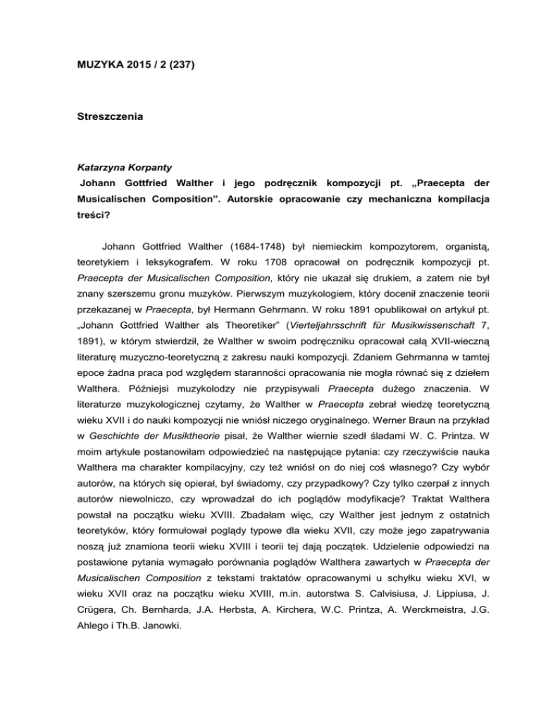 MUZYKA 2015 / 2 (237) Streszczenia Katarzyna Korpanty Johann Gottfried Walther i jego podręcznik kompozycji pt. „Praecepta der Musicalischen Composition”. Autorskie opracowanie czy mechaniczna kompilacja treści? Johann Gottfried Walther (1684-1748) był niemieckim kompozytorem, organistą, teoretykiem i leksykografem. W roku 1708 opracował on podręcznik kompozycji pt. Praecepta der Musicalischen Composition, który nie ukazał się drukiem, a zatem nie był znany szerszemu gronu muzyków. Pierwszym muzykologiem, który docenił znaczenie teorii przekazanej w Praecepta, był Hermann Gehrmann. W roku 1891 opublikował on artykuł pt. „Johann Gottfried Walther als Theoretiker” (Vierteljahrsschrift für Musikwissenschaft 7, 1891), w którym stwierdził, że Walther w swoim podręczniku opracował całą XVII-wieczną literaturę muzyczno-teoretyczną z zakresu nauki kompozycji. Zdaniem Gehrmanna w tamtej epoce żadna praca pod względem staranności opracowania nie mogła równać się z dziełem Walthera. Późniejsi muzykolodzy nie przypisywali Praecepta dużego znaczenia. W literaturze muzykologicznej czytamy, że Walther w Praecepta zebrał wiedzę teoretyczną wieku XVII i do nauki kompozycji nie wniósł niczego oryginalnego. Werner Braun na przykład w Geschichte der Musiktheorie pisał, że Walther wiernie szedł śladami W. C. Printza. W moim artykule postanowiłam odpowiedzieć na następujące pytania: czy rzeczywiście nauka Walthera ma charakter kompilacyjny, czy też wniósł on do niej coś własnego? Czy wybór autorów, na których się opierał, był świadomy, czy przypadkowy? Czy tylko czerpał z innych autorów niewolniczo, czy wprowadzał do ich poglądów modyfikacje? Traktat Walthera powstał na początku wieku XVIII. Zbadałam więc, czy Walther jest jednym z ostatnich teoretyków, który formułował poglądy typowe dla wieku XVII, czy może jego zapatrywania noszą już znamiona teorii wieku XVIII i teorii tej dają początek. Udzielenie odpowiedzi na postawione pytania wymagało porównania poglądów Walthera zawartych w Praecepta der Musicalischen Composition z tekstami traktatów opracowanymi u schyłku wieku XVI, w wieku XVII oraz na początku wieku XVIII, m.in. autorstwa S. Calvisiusa, J. Lippiusa, J. Crügera, Ch. Bernharda, J.A. Herbsta, A. Kirchera, W.C. Printza, A. Werckmeistra, J.G. Ahlego i Th.B. Janowki. Porównanie traktatu Praecepta z traktatami czołowych teoretyków w epoce baroku wykazało, że Walther nie poszedł za jednym wzorem, lecz samodzielnie przedstawił poszczególne problemy sztuki kompozycji. Nie stworzył on nowej teorii kompozycji, bowiem w wieku XVII teoretycy nie dążyli do podkreślenia swojej indywidualności, lecz w sposób oryginalny opisał współczesną mu praktykę kompozytorską. Po przeprowadzonej analizie tekstu Praecepta mogłam także stwierdzić, że sformułowane w nim poglądy filozoficzne oraz charakter opracowania sztuki kompozycji są typowe dla teorii muzyki wieku XVII. Wiktoria Antonczyk Muzyczne dary polskich kompozytorów (nuty z bibliotek nadwornych Petersburga, 1799–1912) Artykuł dotyczy dzieł poświęconych osobom koronowanym i przeznaczonych do podarowania. Te utwory są przykładem syntezy sztuk, łącząc w jedną całość treść muzyczną z wykwintną oprawą artystyczną. Istotne zagadnienie stanowi definicja takiego rodzaju źródła, w związku z czym autorka przedstawia pojęcia, funkcjonujące w polskiej, angielskiej, niemieckiej, francuskiej i rosyjskiej bibliologii dla określenia tych szczególnych egzemplarzy. Odróżniają dar od zwykłych utworów z dedykacją piękno szaty graficznej, oryginalny format, typ papieru i materiał okładki, elementy srebrzone i złocone. W bibliotekach Petersburga zachowały się pokaźne kolekcje takich darów, między innymi podarunkowe egzemplarze rękopisów Carla Philippa Emanuela Bacha, Daniela Aubera, Felixa Mendelssohna. Oddzielną grupę stanowią cenne rękopisy polskich kompozytorów, którzy, będąc obywatelami Imperium Rosyjskiego i pracując w tym kraju, nieraz dedykowali swoje utwory rosyjskim carom i członkom ich rodzin. Te jedyne w swoim rodzaju nuty przykuwają uwagę walorami artystycznymi i inspirują do refleksji nad interesującym z powodów muzycznych i pozamuzycznych zjawiskiem. Bez względu na dysonans powstający przy zetknięciu się ówczesnych wyobrażeń o postawie obywatelskiej i współczesnej wizji patriotyzmu, podniesione polskimi muzykami dary dla rosyjskich monarchów nie warto wyłączać z obiegu naukowego. Stanowią one niewątpliwą wartość jako unikatowe autografy, w większości przypadków jedyne zachowane rękopisy poszczególnych dzieł kompozytorów-Polaków Renata Suchowiejko albo jedyne zachowane przykłady twórczości nieznanych Spuścizna Michała Spisaka (1914–1965) w Paryżu. Nowe źródła do badań nad twórczością kompozytora Spuścizna Michała Spisaka, przechowywana w Bibliotece Polskiej / Towarzystwie Historyczno-Literackim w Paryżu, stanowi bezcenny zasób materiałów źródłowych dotyczących tego kompozytora, a w szerszym kontekście, historii muzyki XX wieku i losów kompozytorów emigracyjnych. Zawiera rękopisy muzyczne, druki, faksymile, listy, zdjęcia, wycinki prasowe, rachunki i dokumenty osobiste. W sumie 23 pudła wypełnione po brzegi archiwaliami i muzykaliami. Spuścizna ta, przekazana w lutym 1996 roku jako „dar wdowy po Michale Spisaku”, nie została jeszcze systematycznie przebadana. Wynikało to przede wszystkim ze stanu zachowania źródeł, które były nieuporządkowane i nieusystematyzowane, co uniemożliwiało jakiekolwiek prace badawcze. Dopiero w 2009 roku przeprowadzono wstępne prace porządkowe w ramach tego zasobu, a w 2010 roku wykonano szczegółowe opracowanie źródeł muzycznych (rękopisów i druków), polegające na ich identyfikacji, klasyfikacji i opisie. Niniejszy artykuł prezentuje rezultaty tych prac. Zawiera ogólną charakter