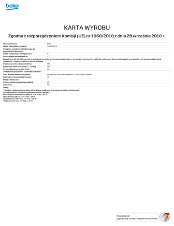KARTA WYROBU Zgodna z rozporządzeniem Komisji (UE) nr 1060/2010 z dnia 28 września 2010 r. Nazwa dostawcy Beko Model (identyfikator modelu) GNE60521X Kategoria urządzenia chłodniczego dla gospodarstw domowych - Klasa efektywności energetycznej A+ Oznakowanie ekologiczne UE - Zużycie energii 456 kWh rocznie na podstawie wyników testu przeprowadzonego w normalnych warunkach w cyklu 24 godzinnym. Rzeczywiste zużycie energii zależy od sposobu użytkowania urządzenia i miejsca, w którym się ono znajduje. Pojemność netto chłodziarki [litry] 356 Pojemność netto zamrażarki (***)* [litry] 152 System bezszronowy (No Frost) Nie Temperatura projektowa "pozostałych komór" - Czas wzrostu temperatury [godz.] Bezpieczny czas przechowywania 22 godzin bez zasilania Zdolność zamrażania [kg/24godz.] 10 Klasa klimatyczna* - Poziom emitowanego hałasu [dB(A)] 42 Zabudowa Nie Uwagi * Zgodnie z zadeklarowaną klasa klimatyczną urządzenie przeznaczone jest do użytkowania w temperaturach otoczenia z podanego poniżej zakresu: Rozszerzona umiarkowana (SN): od + 10°C do + 32°C Umiarkowana (N): od + 16°C do + 32°C Subtropikalna (ST): od + 16°C do + 38°C Tropikalna (T): od + 16 °Cdo + 43°C Masz pytania? Zapraszamy na czat z naszym konsultantem. 1