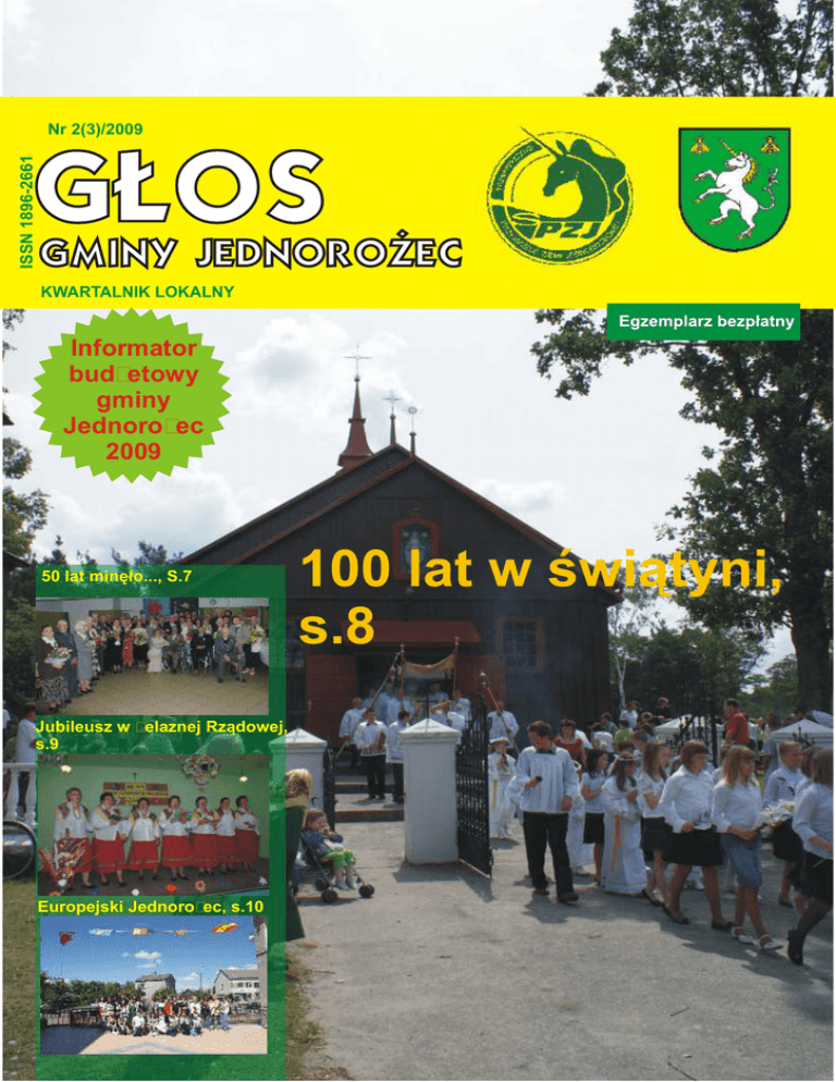 ISSN 1896-2661 Nr 2(3)/2009 KWARTALNIK LOKALNY Informator budżetowy gminy Jednorożec 2009 50 lat minęło..., S.7 Jubileusz w Żelaznej Rządowej, s.9 Europejski Jednorożec, s.10 Spis treści Wieści z terenu.............................4 Informator budżetowy...............15 Sonda...........................................19 Kącik Poetycki...........................20 Historia.......................................21 Informacje, ogłoszenia...............23 Z prac samorządu......................24 ABC Rolnika..............................26 Informacje, ogłoszenia...............27 Sport............................................29 Rozrywka....................................30 Okres ukazania się naszego lokalnego pisma zbiega się z datą zakończenia roku szkolnego oraz początkiem lata. W aktualnym numerze GGJ znajdują się dane sumaryczne z wyborów do parlamentu europejskiego. Frekwencja nie zostawia złudzeń, zainteresowanie mieszkańców ,,euro-polityką” jest bardzo mizerne. Niestety, w naszym kraju występuje nadal poważny deficyt umiejętności korzystania z dobrodziejstw demokracji. Miniony okres obfitował w naszej gminie w święta, jubileusze oraz wizyty o charakterze międzynarodowym. 28 czerwca świętujemy, jak co roku, Dzień Jednorożca, który jest okazją do zaprezentowania dorobku kulturalnego mieszkańców naszej gminy. Najnowszy numer naszej gazety zaopatrzony jest w urzędniczą wkładkę z ,,Informatorem Budżetowym 2009”. Mogą Państwo przeczytać jak gmina Jednorożec pozyskuje pieniądze i w jaki sposób je wydaje. Na tylnej okładce naszego pisma znajdują się fotografie z kolejnej wyprawy turystycznej Stowarzyszenia ,,Przyjaciele Ziemi Jednorożeckiej”. Uczestnicy wyprawy starali się pokazać najciekawsze miejsca w danych miejscowościach. W nadchodzącym sezonie letnim życzę mieszkańcom naszej gminy udanego wypoczynku wakacyjnego, w szczególności rolnikom udanej aury pogodowej oraz obfitych zbiorów. Wojciech Łukaszewski Głos Gminy Jednorożec Kwartalnik lokalny Wydawca: Stowarzyszenie ,,Przyjaciele Ziemi Jednorożeckiej” Siedziba i adres: Stowarzyszenie ,,Przyjaciele Ziemi Jednorożeckiej” , ul. Odrodzenia 14, 06-323 Jednorożec, tel.: (029) 751 70 30; fax (029) 751 70 31, e-mail: [email protected] Redakcja: Wojciech Łukaszewski (redaktor naczelny) [email protected], Urszula Bojarska, Monika Dworniczak, Jolanta Grec, Andrzej Grzyb, Krzysztof Iwulski, Alicja Kamińska, Eugeniusz Kuciński, Eugenia Leszczyńska, Teresa Wojciechowska, Lilla Zabielska Skład komputerowy:Wojciech Łukaszewski Druk i oprawa: Drukarnia J. J. Maciejewscy, Przasnysz Nakład: 2000 egz. Ku czci św. Brunona Bruno Bonifacy z Kwerfurtu (ur. ok. 974, zm. 14 lutego lub 9 marca 1009) - mnich benedyktyński, kapelan cesarski, biskup misyjny, męczennik i święty Kościoła katolickiego. Urodzony w arystokratycznej rodzinie saskiego grafa w Kwerfurcie (ob. Querfurt). Kształcił się w szkole katedralnej w Magdeburgu. W 995 mianowany kanonikiem, następnie na dworze cesarza Ottona III pełnił funkcję kapelana i pozostawał w zażyłej przyjaźni z cesarzem. W 998 w Rzymie porzucił karierę dworską i prawdopodobnie wstąpił do zakonu benedyktynów w klasztorze na Awentynie. Zapewne wówczas otrzymał imię zakonne Bonifacy. W 1001 zamieszkał w pustelni św. Romualda w Pereum koło Rawenny w Italii. Na życzenie Bolesława Chrobrego w 1001 grupa misjonarzy z Pereum udała się do Polski. Miał do nich dołączyć Brunon po uzyskaniu pozwolenia na działalność misyjną. Jest wysoce prawdopodobne, że Chrobry chciał, by misjonarze prowadzili ewangelizację wśród Słowian nadodrzańskich, co musiało spotkać się z niepokojem metropolitów niemieckich. Brunon otrzymał pozwolenie na wyświęcenie od Sylwestra II oraz zezwolenie dla misji zakonników z Pereum. Otrzymał również paliusz. Zimą 1002 udał się na dwór cesarza Henryka II, lecz musiał czekać do 1004 na święcenia uzyskane z rąk arcybiskupa Magdeburga. Celem jego działalności misyjnej stały się jednak Węgry, a potem plemiona Pieczyngów (teren nad Dnieprem, na południe od Rusi Kijowskiej). Brunon wysłał także wyświęconego przez siebie biskupa do Szwecji. Po śmierci jego współbraci (Pięciu Braci Męczenników - Italczyków: Benedykta z Benewentu i Jana oraz Słowian - Mateusza, Krystyna i Izaaka, którzy ponieśli śmierć męczeńską w 1003), wybrał się do Polski. Według późniejszej Kroniki Spangeberga mnich benedyktyński Bruno ok. 1000 r. założył kościół św. Wawrzyńca w Łomży. Napisał dwa dzieła hagiograficzne: Żywot św. Wojciecha i Żywot Pięciu Braci Męczenników. Są to pierwszorzędne źródła do dziejów wczesnośredniowiecznej Polski i Europy środkowej. Napisał również List do Henryka II, stanowiący próbę mediacji między cesarzem a Chrobrym. List jest jednym z pierwszych dzieł napisanych bez wątpienia na terenie Polski. Wobec przedłużającej się wojny między obydwoma władcami udał się na misję do Prusów, na pogranicze Litwy i Rusi. Poniósł śmierć męczeńską wraz z 18 misjonarzami 14 lutego lub 9 marca 1009 roku. Dniem obchodu liturgicznego św. Brunona jest 12 lipca. Odprawia się uroczystości w diecezji łomżyńskiej, oraz parafii w Giżycku, których Brunon jest głównym patronem. W tekstach liturgicznych współczesnego pochodzenia Brunon z Kwerfurtu wzmiankowany jest rzadko. Jedyny pomnik męczeńskiej śmierci św. Brunona na ziemiach polskich znajduje się w Giżycku, kilometr na płd. zach. od centrum miasta, na wzgórzu nad jeziorem Niegocin, nieopodal trasy kolejowej Olsztyn - Giżycko. Miejsce to było począwszy od końca XIX wieku uważane przez Niemców za miejsce kaźni świętego, co jednak nie znajduje potwierdzenia w źródłach. Chorzele. Celem było umożliwienie wierzącym powrotu do źródeł wiary poprzez odnowienie przyrzeczeń chrzcielnych oraz udziału w uroczystej Eucharystii. Przed b