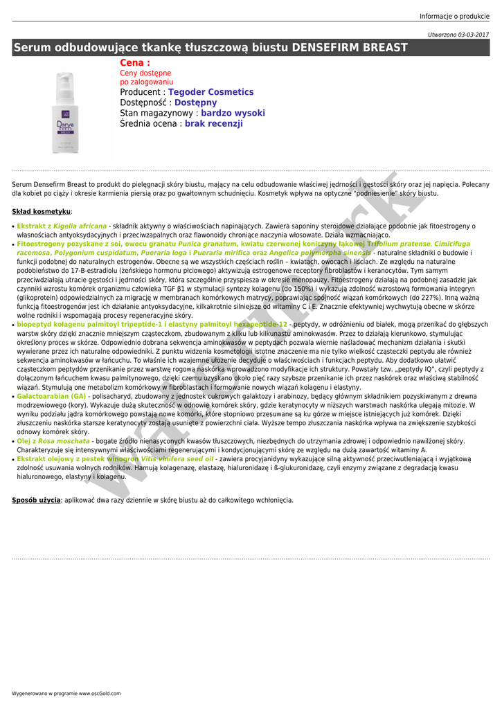 Informacje o produkcie Utworzono 03-03-2017 Serum odbudowujące tkankę tłuszczową biustu DENSEFIRM BREAST Cena : Ceny dostępne po zalogowaniu Producent : Tegoder Cosmetics Dostępność : Dostępny Stan magazynowy : bardzo wysoki Średnia ocena : brak recenzji er m ar k Serum Densefirm Breast to produkt do pielęgnacji skóry biustu, mający na celu odbudowanie właściwej jędrności i gęstości skóry oraz jej napięcia. Polecany dla kobiet po ciąży i okresie karmienia piersią oraz po gwałtownym schudnięciu. Kosmetyk wpływa na optyczne "podniesienie" skóry biustu. Skład kosmetyku: ● ● ● ● w ● Ekstrakt z Kigelia africana - składnik aktywny o właściwościach napinających. Zawiera saponiny steroidowe działające podobnie jak fitoestrogeny o własnościach antyoksydacyjnych i przeciwzapalnych oraz flawonoidy chroniące naczynia włosowate. Działa wzmacniająco. Fitoestrogeny pozyskane z soi, owocu granatu Punica granatum, kwiatu czerwonej koniczyny łąkowej Trifolium pratense, Cimicifuga racemosa, Polygonium cuspidatum, Pueraria loga i Pueraria mirifica oraz Angelica polymorpha sinensis - naturalne składniki o budowie i funkcji podobnej do naturalnych estrogenów. Obecne są we wszystkich częściach roślin – kwiatach, owocach i liściach. Ze względu na naturalne podobieństwo do 17-B-estradiolu (żeńskiego hormonu płciowego) aktywizują estrogenowe receptory fibroblastów i keranocytów. Tym samym przeciwdziałają utracie gęstości i jędrności skóry, która szczególnie przyspiesza w okresie menopauzy. Fitoestrogeny działają na podobnej zasadzie jak czynniki wzrostu komórek organizmu człowieka TGF β1 w stymulacji syntezy kolagenu (do 150%) i wykazują zdolność wzrostową formowania integryn (glikoprotein) odpowiedzialnych za migrację w membranach komórkowych matrycy, poprawiając spójność wiązań komórkowych (do 227%). Inną ważną funkcją fitoestrogenów jest ich działanie antyoksydacyjne, kilkakrotnie silniejsze od witaminy C i E. Znacznie efektywniej wychwytują obecne w skórze wolne rodniki i wspomagają procesy regeneracyjne skóry. biopeptyd kolagenu palmitoyl tripeptide-1 i elastyny palmitoyl hexapeptide-12 - peptydy, w odróżnieniu od białek, mogą przenikać do głębszych warstw skóry dzięki znacznie mniejszym cząsteczkom, zbudowanym z kilku lub kilkunastu aminokwasów. Przez to działają kierunkowo, stymulując określony proces w skórze. Odpowiednio dobrana sekwencja aminokwasów w peptydach pozwala wiernie naśladować mechanizm działania i skutki wywierane przez ich naturalne odpowiedniki. Z punktu widzenia kosmetologii istotne znaczenie ma nie tylko wielkość cząsteczki peptydu ale również sekwencja aminokwasów w łańcuchu. To właśnie ich wzajemne ułożenie decyduje o właściwościach i funkcjach peptydu. Aby dodatkowo ułatwić cząsteczkom peptydów przenikanie przez warstwę rogową naskórka wprowadzono modyfikacje ich struktury. Powstały tzw. „peptydy IQ”, czyli peptydy z dołączonym łańcuchem kwasu palmitynowego, dzięki czemu uzyskano około pięć razy szybsze przenikanie ich przez naskórek oraz właściwą stabilność wiązań. Stymulują one metabolizm komórkowy w fibroblastach i formowanie nowych wiązań kolagenu i elastyny. Galactoarabian (GA) - polisacharyd, zbudowany z jednostek cukrowych galaktozy i arabinozy, będący głównym składnikiem pozyskiwanym z drewna modrzewiowego (kory). Wykazuje dużą skuteczność w odnowie komórek skóry, gdzie keratynocyty w niższych warstwach naskórka ulegają mitozie. W wyniku podziału jądra komórkowego powstają nowe komórki, które stopniowo przesuwane są ku górze w miejsce istniejących już komórek. Dzięki złuszczeniu naskórka starsze keratynocyty zostają usunięte z powierzchni ciała. Wyższe tempo złuszczania naskórka wpływa na zwiększenie szybkości odnowy komórek skóry. Olej z Rosa moschata - bogate źródło nienasyconych kwasów tłuszczowych, niezbędnych do utrzymania zdrowej i odpowiednio nawilżonej skóry. Charakteryzuje się intensywnymi właściwościami regenerującymi i kondycjonującymi skórę ze względu na dużą zawartość witaminy A. Ekstrakt olejowy z pestek winogron Vitis vinifera seed oil - zawiera procyjanidyny wykazujące silną aktywność przeciwutleniającą i wyjątkową zdolność usuwania wolnych rodników. Hamują kolagenazę, elastazę, hialuronidazę i ß-glukuronidazę, czyli enzymy związane z degradacją kwasu hialuronowego, elastyny i kolagenu. at ● Sposób użycia: aplikować dwa razy dziennie w skórę biustu aż do całkowitego wchłonięcia. Wygenerowano w programie www.oscGold.com