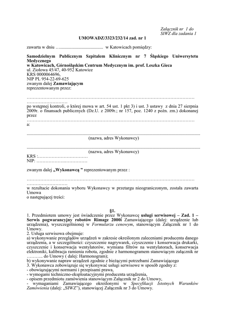 Załącznik nr 1 do SIWZ dla zadania 1 UMOWADZ/3323/232/14 zad. nr 1 zawarta w dniu …...................................... w Katowicach pomiędzy: Samodzielnym Publicznym Szpitalem Klinicznym nr 7 Śląskiego Uniwersytetu Medycznego w Katowicach, Górnośląskim Centrum Medycznym im. prof. Leszka Gieca ul. Ziołowa 45/47, 40-952 Katowice KRS 0000064696, NIP PL 954-22-69-625 zwanym dalej Zamawiającym reprezentowanym przez: ………………………………………………………………………………………………… ……………………… po wstępnej kontroli, o której mowa w art. 54 ust. 1 pkt 3) i ust. 3 ustawy z dnia 27 sierpnia 2009r. o finansach publicznych (Dz.U. z 2009r.; nr 157, poz. 1240 z poźn. zm.) dokonanej przez ………………………………………………………………………………………………… a: ......................................................................................................................................................... (nazwa, adres Wykonawcy) ......................................................................................................................................................... (nazwa, adres Wykonawcy) KRS :…………………………… NIP: ……………….…………… zwanym dalej „Wykonawcą ” reprezentowanym przez : ………………………………………………………………………………………………… ……………………… w rezultacie dokonania wyboru Wykonawcy w przetargu nieograniczonym, została zawarta Umowa o następującej treści: §1. 1. Przedmiotem umowy jest świadczenie przez Wykonawcę usługi serwisowej – Zad. 1 – Serwis pogwarancyjny robotów Rimage 2000i Zamawiającego (dalej: urządzenie lub urządzenia), wyszczególnionej w Formularzu cenowym, stanowiącym Załącznik nr 1 do Umowy. 2. Usługa serwisowa obejmuje: a) wykonywanie przeglądów urządzeń w zakresie określonym zaleceniami producenta danego urządzenia, a w szczególności: czyszczenie nagrywarek, czyszczenie i konserwacja drukarki, czyszczenie i konserwacja wentylatorów, wymiana filtrów na wentylatorach, konserwacja elektroniki, kalibracja ramienia robota, zgodnie z harmonogramem stanowiącym załącznik nr ……….. do Umowy ( dalej: Harmonogram); b) wykonywanie napraw urządzeń zgodnie z bieżącymi potrzebami Zamawiającego 3. Wykonawca zobowiązuje się wykonywać usługi serwisowe w sposób zgodny z: - obowiązującymi normami i przepisami prawa, - wymogami techniczno-eksploatacyjnymi producenta urządzenia, - opisem przedmiotu zamówienia stanowiącym Załącznik nr 2 do Umowy, - wymaganiami Zamawiającego określonymi w Specyfikacji Istotnych Warunków Zamówienia (dalej: „SIWZ”), stanowiącej Załącznik nr 3 do Umowy. §3. 1. Wykonawca zobowiązany jest doręczyć Zamawiającemu, w terminie do 7 dni od dnia zawarcia Umowy: a) wzór raportu serwisowego sporządzanego przez Wykonawcę po wykonaniu przeglądu urządzenia zawierający co najmniej następujące informacje: datę wykonania przeglądu, zakres i rodzaj wykonanych czynności, wykaz zużytych części i materiałów, oświadczenie Wykonawcy o wykonaniu przeglądu zgodnie z zaleceniami producenta urządzenia, wyraźne oznaczenie Wykonawcy i Zamawiającego wraz z wyodrębnionym miejscem na podpisy przedstawicieli Stron; b) wzór orzeczenia technicznego o wycofaniu urządzenia z użytkowania. 2. Wykonawca zobowiązany jest wykonywać przeglądy urządzeń zgodnie z Harmonogramem, przy czym godzinę wykonania przeglądu Wykonawca zobowiązany jest uzgodnić z Zamawiającym, co najmniej 7 dni naprzód. 3. Każdorazowo po wykonaniu przeglądu urządzenia Wykonawca zobowiązany jest: a) sporządzić i doręczyć Zamawiającemu raport serwisowy zgodnie z zaakceptowanym przez Zamawiającego wzorem, o którym mowa w ust. 1 pkt. a); b) dokonać odpowiedniego wpisu w paszporcie technicznym urządzenia; c) wystawić i doręczyć Zamawiającemu certyfikat sprawności urządzenia; d) sporządzić i doręczyć Zamawiającemu informację o stwierdzonych w trakcie przeglądu koniecznych naprawach urządzenia i ich zakresie; e) w przypadku stwierdzenia w trakcie przeglądu konieczności wycofania urządzenia z użytkowania –sporządzić i doręczyć Zamawiającemu odpowiednie orzeczenie techniczne zgodne z zaakceptowanym przez Zamawiającego wzorem, o którym mowa w ust. 1 pkt.b). 4. Należyte, zgodne z Umową, wykonanie przeglądu urządzenia, w tym wykonanie obowiązków wskazanych w ust. 3,będzie potwierdzone każdorazowo przez Zamawiającego protokołem odbioru usługi przeglądu. §4. 1. Naprawy urządzeń będą wykonywane zgodnie z bieżącymi potrzebami Zamawiającego. 2. Wykonawca zobowiązany jest pozostawać w gotowości do wykonania naprawy urządzeń od poniedziałku do piątku, w godzinach od 7:00 do 15:00 z wyłączeniem świąt i dni ustawowo wolnych od pracy. 3. Wykonawca zobowiązany jest nie później niż w ciągu 48 godzin (z wyłączeniem sobót, niedziel, świąt i dni ustawowo wolnych od pracy) od momentu uzyskania informacji od Zamawiającego o konieczności wykonania naprawy przedstawić Zamawiającemu, w formie pisemnej, do akceptacji, wycenę kosztów naprawy określającą: zakres koniecznej naprawy, koszt materiałów niezbędnych do wykonania naprawy, czas niezbędny do wykonania naprawy liczony w roboczogodzinach, przy czym czas ten nie może być dłuższy niż 7 dni od momentu uzyskania informacji od Zamawiającego o akceptacji wyceny kosztów. 4. Wykonawca zobowiązany jest wykonać naprawę urządzenia w terminie wskazanym w zaakceptowanej przez Zamawiającego wycenie kosztów, o której mowa w ust.3. Wykonawca nie może przystąpić do wykonania naprawy bez akceptacji przez Zamawiającego wyceny kosztów. 5. W szczególnych przypadkach uzasadniających wykonywanie naprawy w terminie dłuższym niż wskazany w zaakceptowanej wycenie kosztów napr