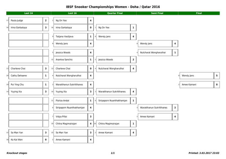 IBSF Snooker Championships Women - Doha / Qatar 2016 Last 24 Last 16 17 Paula Judge 2 1 16 Irina Gorbataya 3 16 Quarter Final Semi Final Final Ng On Yee 4 Irina Gorbataya 0 1 Ng On Yee 1 9 Tatjana Vasiljeva 1 8 Wendy Jans 4 8 Wendy Jans 4 8 Wendy Jans 4 5 Jessica Woods 4 4 Nutcharat Wongharuthai 1 12 Arantxa Sanchis 1 5 Jessica Woods 2 Charlene Chai 0 4 Nutcharat Wongharuthai 4 13 Charlene Chai 3 13 20 Cathy Dehaene 1 4 Nutcharat Wongharuthai 4 8 Wendy Jans 5 19 Pui Ying Chu 1 3 Waratthanun Sukritthanes 4 2 Amee Kamani 0 14 Yuying Xia 3 14 Yuying Xia 3 3 Waratthanun Sukritthanes 4 11 Floriza Andal 1 6 Siripaporn Nuanthakhamjan 1 6 Siripaporn Nuanthakhamjan 4 3 Waratthanun Sukritthanes 2 7 Vidya Pillai 3 2 Amee Kamani 4 10 Chitra Magimairajan 4 10 So Man Yan 3 2 Amee Kamani 4 15 So Man Yan 3 15 18 Ka Kai Wan 0 2 Knockout stages Chitra Magimairajan 1 Amee Kamani 4 1/1 Printed: 3.03.2017 23:03