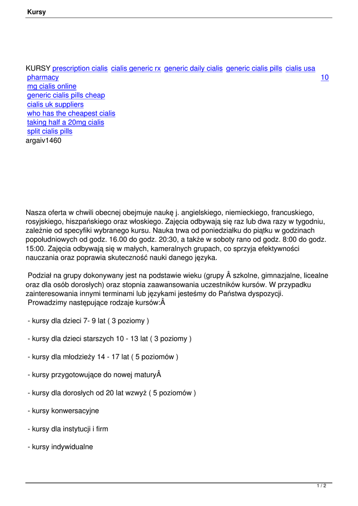 Kursy KURSY prescription cialis cialis generic rx generic daily cialis generic cialis pills cialis usa pharmacy 10 mg cialis online generic cialis pills cheap cialis uk suppliers who has the cheapest cialis taking half a 20mg cialis split cialis pills argaiv1460 Nasza oferta w chwili obecnej obejmuje naukę j. angielskiego, niemieckiego, francuskiego, rosyjskiego, hiszpańskiego oraz włoskiego. Zajęcia odbywają się raz lub dwa razy w tygodniu, zależnie od specyfiki wybranego kursu. Nauka trwa od poniedziałku do piątku w godzinach popołudniowych od godz. 16.00 do godz. 20:30, a także w soboty rano od godz. 8:00 do godz. 15:00. Zajęcia odbywają się w małych, kameralnych grupach, co sprzyja efektywności nauczania oraz poprawia skuteczność nauki danego języka. Podział na grupy dokonywany jest na podstawie wieku (grupy  szkolne, gimnazjalne, licealne oraz dla osób dorosłych) oraz stopnia zaawansowania uczestników kursów. W przypadku zainteresowania innymi terminami lub językami jesteśmy do Państwa dyspozycji. Prowadzimy następujące rodzaje kursów: - kursy dla dzieci 7- 9 lat ( 3 poziomy ) - kursy dla dzieci starszych 10 - 13 lat ( 3 poziomy ) - kursy dla młodzieży 14 - 17 lat ( 5 poziomów ) - kursy przygotowujące do nowej matury - kursy dla dorosłych od 20 lat wzwyż ( 5 poziomów ) - kursy konwersacyjne - kursy dla instytucji i firm - kursy indywidualne 1/2 Kursy Firmy i instytucje: Dla firm oraz instytucji publicznych przygotowujemy zawsze specjalne, indywidualne oferty. Są one dopasowane do specyficznych potrzeb, możliwości czasowo-finansowych oraz umiejętności językowych pracowników. 2/2