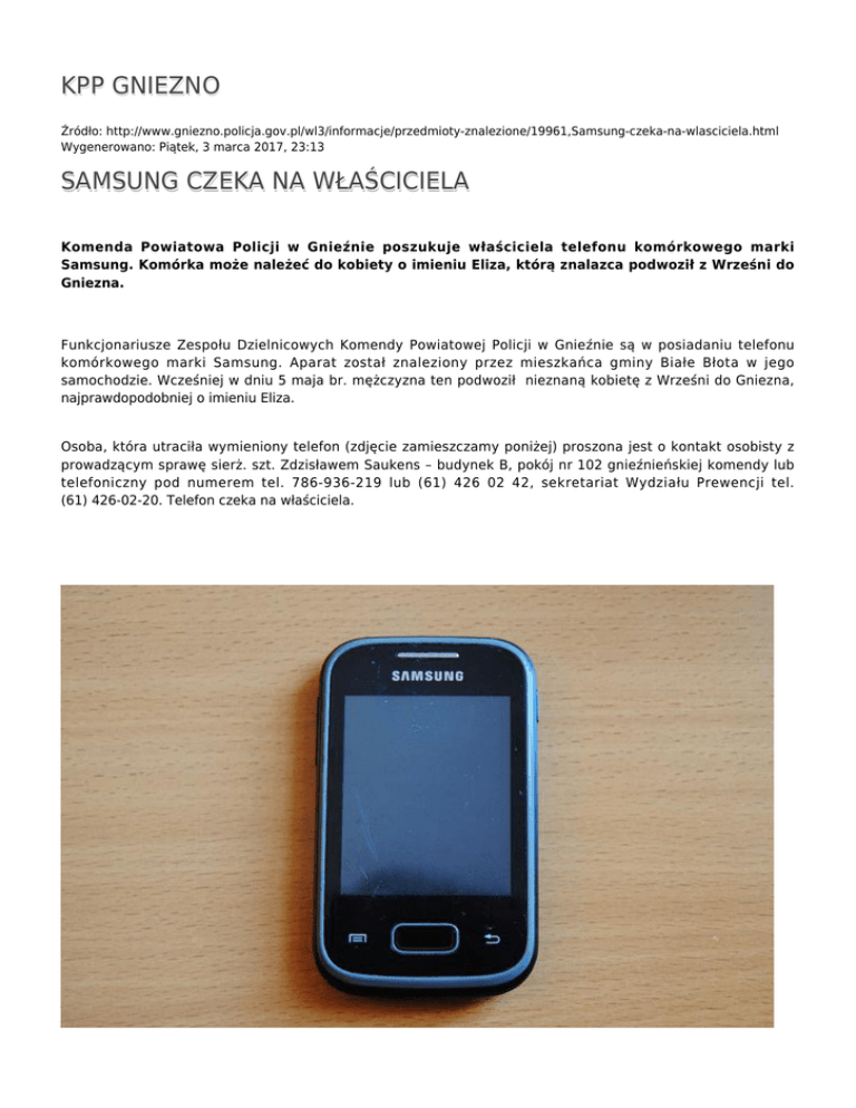 KPP GNIEZNO Źródło: http://www.gniezno.policja.gov.pl/wl3/informacje/przedmioty-znalezione/19961,Samsung-czeka-na-wlasciciela.html Wygenerowano: Piątek, 3 marca 2017, 23:13 SAMSUNG CZEKA NA WŁAŚCICIELA Komenda Powiatowa Policji w Gnieźnie poszukuje właściciela telefonu komórkowego marki Samsung. Komórka może należeć do kobiety o imieniu Eliza, którą znalazca podwoził z Wrześni do Gniezna. Funkcjonariusze Zespołu Dzielnicowych Komendy Powiatowej Policji w Gnieźnie są w posiadaniu telefonu komórkowego marki Samsung. Aparat został znaleziony przez mieszkańca gminy Białe Błota w jego samochodzie. Wcześniej w dniu 5 maja br. mężczyzna ten podwoził nieznaną kobietę z Wrześni do Gniezna, najprawdopodobniej o imieniu Eliza. Osoba, która utraciła wymieniony telefon (zdjęcie zamieszczamy poniżej) proszona jest o kontakt osobisty z prowadzącym sprawę sierż. szt. Zdzisławem Saukens – budynek B, pokój nr 102 gnieźnieńskiej komendy lub telefoniczny pod numerem tel. 786-936-219 lub (61) 426 02 42, sekretariat Wydziału Prewencji tel. (61) 426-02-20. Telefon czeka na właściciela. Ocena: 0/5 (0) Tweetnij