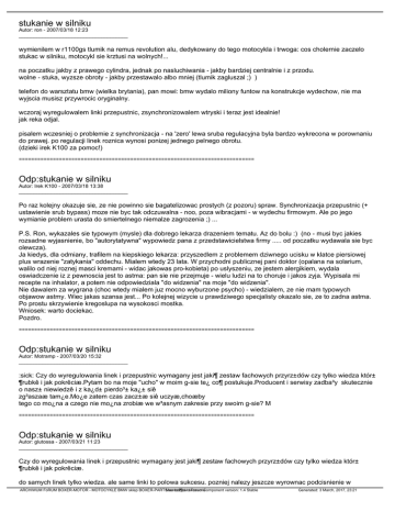 stukanie w silniku Autor: ron - 2007/03/18 12:23 _____________________________________ wymienilem w r1100gs tlumik na remus revolution alu, dedykowany do tego motocykla i trwoga: cos cholernie zaczelo stukac w silniku, motocykl sie krztusi na wolnych!... na poczatku jakby z prawego cylindra, jednak po nasluchiwania - jakby bardziej centralnie i z przodu. wolne - stuka, wyzsze obroty - jakby przestawalo albo mniej (tlumik zagluszal ;) ) telefon do warsztatu bmw (wielka brytania), pan mowi: bmw wydalo miliony funtow na konstrukcje wydechow, nie ma wyjscia musisz przywrocic oryginalny. wczoraj wyregulowalem linki przepustnic, zsynchronizowalem wtryski i teraz jest idealnie! jak reka odjal. pisalem wczesniej o problemie z synchronizacja - na 'zero' lewa sruba regulacyjna byla bardzo wykrecona w porownaniu do prawej. po regulacji linek roznica wynosi ponizej jednego pelnego obrotu. (dzieki irek K100 za pomoc!) ============================================================================ Odp:stukanie w silniku Autor: Irek K100 - 2007/03/18 13:38 _____________________________________ Po raz kolejny okazuje sie, ze nie powinno sie bagatelizowac prostych (z pozoru) spraw. Synchronizacja przepustnic (+ ustawienie srub bypass) moze nie byc tak odczuwalna - noo, poza wibracjami - w wydechu firmowym. Ale po jego wymianie problem urasta do smiertelnego niemalze zagrozenia ;) ... P.S. Ron, wykazales sie typowym (mysle) dla dobrego lekarza drazeniem tematu. Az do bolu :) (no - musi byc jakies rozsadne wyjasnienie, bo "autorytatywna" wypowiedz pana z przedstawicielstwa firmy ..... od poczatku wydawala sie byc olewcza). Ja kiedys, dla odmiany, trafilem na kiepskiego lekarza: przyszedlem z problemem dziwnego ucisku w klatce piersiowej plus wrazenie "zatykania" oddechu. Mialem wtedy 23 lata. W przychodni publicznej pani doktor (opalana na solarium, walilo od niej roznej masci kremami - widac jakowas pro-kobieta) po uslyszeniu, ze jestem alergikiem, wydala oswiadczenie iz z pewnoscia jest to astma: pan sie nie przejmuje - wielu ludzi na to choruje i jakos zyja. Wypisala mi recepte na inhalator, a potem nie odpowiedziala "do widzenia" na moje "do widzenia". Nie dawalem za wygrana (choc wtedy mialem juz mocno wyburzone psycho) - wiedzialem, ze nie mam typowych objawow astmy. Wiec jakas szansa jest... Po kolejnej wizycie u prawdziwego specjalisty okazalo sie, ze to zadna astma. Po prostu skrzywienie kregoslupa na wysokosci mostka. Wniosek: warto dociekac. Pozdro. ============================================================================ Odp:stukanie w silniku Autor: Motramp - 2007/03/20 15:32 _____________________________________ :sick: Czy do wyregulowania linek i przepustnic wymagany jest jaki¶ zestaw fachowych przyrz±dów czy tylko wiedza któr± ¶rubkê i jak pokrêciæ.Pytam bo na moje "ucho" w moim g-sie te¿ co¶ postukuje.Producent i serwisy zadba³y skutecznie o nasz± niewiedzê i z ka¿d± pierdo³± ka¿± siê zg³aszaæ tam¿e.Mo¿e zatem czas zacz±æ siê uczyæ,choæby tego co mo¿na a czego nie mo¿na zrobiæ we w³asnym zakresie przy swoim g-sie? M ============================================================================ Odp:stukanie w silniku Autor: glutossa - 2007/03/21 11:23 _____________________________________ Czy do wyregulowania linek i przepustnic wymagany jest jaki¶ zestaw fachowych przyrz±dów czy tylko wiedza któr± ¶rubkê i jak pokrêciæ. do samych linek tylko wiedza. ale same linki to polowa sukcesu. pozniej nalezy jeszcze wyrownac podcisnienie w ARCHIWUM FoRUM BOXER-MOTOR - MOTOCYKLE BMW sklep BOXER-PARTS.eu MamboBoard czê¶ci i akcesoria Forum Component version: 1.4 Stable Generated: 3 March, 2017, 23:21 kanalach ssacych. do tego trzeba juz zakupic wakuometr np taki - http://www.carbtune.com/ ============================================================================ Odp:stukanie w silniku Autor: ron - 2007/03/21 12:21 _____________________________________ nt wakuometrow juz bylo wiele. poszukaj na forum. generalnie wystarczy pare metrow przezroczystej rurki igielitowej, deska i olej. oraz oczywiscie troche wiedzy. ============================================================================ ARCHIWUM FoRUM BOXER-MOTOR - MOTOCYKLE BMW sklep BOXER-PARTS.eu MamboBoard czê¶ci i akcesoria Forum Component version: 1.4 Stable Generated: 3 March, 2017, 23:21