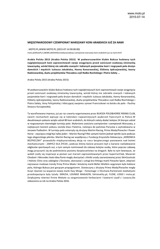 www.moto.pl 2015-07-14 MIĘDZYNARODOWY CZEMPIONAT WARSZAWY KONI ARABSKICH JUŻ ZA NAMI . MOTO.PL,WWW.MOTO.PL (2015-07-14 00:00:00) moto.pl/MotoPL/1,88389,18354458,miedzynarodowy-czempionat-warszawy-koni-arabskich-juz-za-nami.html Arabia Polska 2015 (Arabia Polska 2015) W podwarszawskim klubie Buksza hodowcy tych najpiękniejszych koni zaprezentowali swoje osiągnięcia przed sześciuset osobową śmietanką towarzyską, wśród której nie zabrakło znanych i lubianych pasjonatów koni i rozgrywek polo drużyn damskich i męskich: Łukasza Jakubiaka, Hanny Konarowskiej, Elżbiety Jędrzejewskiej, Iwony Radziszewskiej, duetu projektantów Thecadess czyli Radka Rocińskiego i Piotra Sałaty ... Arabia Polska 2015 (Arabia Polska 2015) W podwarszawskim klubie Buksza hodowcy tych najpiękniejszych koni zaprezentowali swoje osiągnięcia przed sześciuset osobową śmietanką towarzyską, wśród której nie zabrakło znanych i lubianych pasjonatów koni i rozgrywek polo drużyn damskich i męskich: Łukasza Jakubiaka, Hanny Konarowskiej, Elżbiety Jędrzejewskiej, Iwony Radziszewskiej, duetu projektantów Thecadess czyli Radka Rocińskiego i Piotra Sałaty, Ilony Felicjańskiej i kibicującej swojemu synowi Franciszkowi na boisku do polo - Pauliny Smaszcz Kurzajewskiej Ta wyrafinowana impreza, już po raz czwarty organizowana przez BUKSZA POLO&HORSE RIDING CLUB, swoim rozmachem wpisuje się w kalendarz najważniejszych wydarzeń hipicznych w Polsce.W dwudniowym pokazie wzięło udział 80 koni arabskich, do których należy dodać kolejne 24 biorące udział w rozgrywanym równolegle turnieju polo. Wyłoniono sześcioro czempionów i czempionek Warszawy, a najlepszym koniem pokazu została klacz Palatina, należąca do państwa Parysów a wyhodowana w Janowie Podlaskim. W turnieju polo zmierzyły się drużyny Martini Racing, Prima Moda/Panache i Power Horse - zwycięzca mógł być tylko jeden - Martini Racing!!!Nie samymi końmi jednak tętniło życie podczas tego eleganckiego pikniku. Martini Racing we współpracy z Fundacją Krzysztofa Hołowczyca „KIEROWCA BEZPIECZNY” prowadziło międzynarodową akcję na rzecz bezpiecznego panowania nad końmi mechanicznymi - ZARYCZ DLA ŻYCIA!, podczas której Goście proszeni byli o barwne naśladowanie odgłosów sportowych aut, a tym samym nominowali do zabawy kolejne osoby, które poprzez zabawę mogą przyczynić się do podniesienia poziomu bezpieczeństwa na drogach. Było to tym łatwiejsze, że wokół czaiły się inspiracje w postaci aut marzeń zaprezentowanych przez SuperCarClub, Maserati Chodzeń i Mercedes Auto-Idea.Panie mogły skorzystać z kliniki urody zaaranżowanej przez SkinCeuticals i Holistic Clinic oraz zabiegów L'Occitane, skorzystać z usługi bra-fittingu marki Panache Sport, obejrzeć najnowsze modowe trendy firmy Prima Moda i biżuterię marki Beller.Wielkim wygranym było kobiece polo, którego Buksza jest gorącym propagatorem. Dziewczyny z drużyny Prima Moda/Panache mogły liczyć również na wsparcie nowej marki Ewy Minge - Femestage i L'Occitane.Partnerami medialnymi przedsięwzięcia były tytuły: GRAZIA, LOUNGE MAGAZIN, fahionality.pl, FLOW, LOGO i moto.pl. Dziękujemy również firmie Mokate za zorganizowanie herbaciarni i kawiarni Loyd's i Lavazza.Do zobaczenia za rok na Arabia Polska 2016.