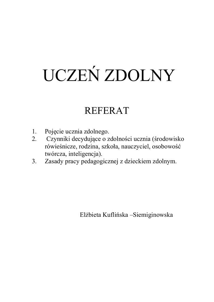UCZEŃ ZDOLNY REFERAT 1. 2. 3. Pojęcie ucznia zdolnego. Czynniki decydujące o zdolności ucznia (środowisko rówieśnicze, rodzina, szkoła, nauczyciel, osobowość twórcza, inteligencja). Zasady pracy pedagogicznej z dzieckiem zdolnym. Elżbieta Kuflińska –Siemiginowska O uczniach zdolnych mówimy w odniesieniu do jednostek przejawiających wysoki poziom zdolności ogólnych (inteligencji) lub posiadających jakąś zdolność specjalną w sferze działalności umysłowej lub manualnej. Uczniowie zdolni charakteryzują się dwiema podstawowymi cechami: ponadprzeciętnymi osiągnięciami lub potencjalnymi zdolnościami do takich osiągnięć. Cechę pierwszą możemy stwierdzić obserwując rezultaty aktywności ucznia, cechę drugą badając go instrumentami psychologicznymi np. testami. Pojęcie „uczeń zdolny” służy do określania jednostek, które pod względem zdolności intelektualnych przewyższają swoich rówieśników. W próbach określenia ucznia zdolnego zwraca się uwagę na takie własności jak: - zdolność do efektywnego uczenia się rzeczy nowych, - stale wyróżniające się wyniki w jakiejś aktywności, - oryginalność w myśleniu i działaniu, duże nasilenie dążeń poznawczych, - przejawianie wysokiego poziomu myślenia analitycznego, - łatwość rozumienia i przyswajania symboli abstrakcyjnych i stosunków symbolicznych, właściwego posługiwania się symbolami we własnym działaniu, - zainteresowania poznawcze, zdolność do koncentracji uwagi, zwłaszcza na treściach abstrakcyjnych, - wrażliwość na problemy i wytrwałość w ich rozwiązywaniu, - przeżywanie satysfakcji z rozwiązywania problemów i pokonywania trudności intelektualnych. Wysoka inteligencja może zaznaczać się zarówno we wszystkich lub w wielu dziedzinach działalności, jak również tylko w pewnych określonych dziedzinach, jak np. w odniesieniu do matematyki i nauk ścisłych, do języków, humanistyki itp. Swoje ponadprzeciętne zdolności uczeń zdolny przejawia w szkole na kilku polach: - „akademickim” tj. w uczeniu się przedmiotów szkolnych odpowiadających gałęziom wiedzy ( np. potrafi wynajdywać oryginalne dowody i sposoby rozwiązań matematycznych) - artystycznym, - technicznym, - sportowym, - społecznym ( wykazuje talent przywódczy lub umiejętność skutecznego rozwiązywania problemów społecznych). O efektach tej działalności współdecydują obok zdolności także twórczość, zdolności ponadprzeciętne, osobowość, stopień zaangażowania w działalność oraz lepsze warunki życia i aktywność jednostki. Rozwój wybitnych uzdolnień uzależniony jest zarówno od warunków zewnętrznych, w których jednostka się znajduje, jak również od warunków wewnętrznych związanych z wyposażeniem biologicznym, z posiadanymi zdolnościami kierunkowymi i ogólnymi, z intelektualnymi zdolnościami twórczymi. Warunki zewnętrzne czyli rodzina, szkoła, grupa rówieśnicza mogą działać jako stymulatory. Jednym z ważniejszych czynników wpływających na rozwój zdolności jednostki jest motywacja, umiejętność koncentracji na zadaniu, a także wyobraźnia twórcza, która umożliwia tworzenie nowych idei, koncepcji i dzieł. Rola rodziny jako stymulatora rozwoju zdolności jest niepodważalna i wiodąca. Ważne jest wspieranie rodziców, dokształcanie ich i towarzyszenie im w codziennym byciu z dzieckiem zdolnym. Zasady pracy pedagogicznej z uczniem zdolnym: 1. OBSERWACJA - jest to bardzo ważna zasada, bowiem od właściwego rozpoznania zdolności może zależeć dalszy rozwój dziecka. Uczeń może przejawiać wiele zdolności, które są sprzężone z ośrodkami inteligencji. Są to zdolności językowe, logiczno – matematyczne, wizualno –przestrzenne, kinestetyczne, muzyczne, interpersonalne, intrapersonalne, przyrodnicze, egzystencjalne i duchowe. Jednak w szkole najbardziej pożądani są uczniowie o wysokim poziomie zdolności językowych i logicznomatematycznych. To oni wygrywają konkursy i olimpiady przedmiotowe, bez problemów opanowują wiadomości programowe. Nie są cenione natomiast: inteligencja interpersonalna –niezbędna w pracy psychologa czy pedagoga, inteligencja intrapersonalna – wykorzystywana przez pisarzy, doradców, filozofów, inteligencja wizualno – przestrzenna, którą posługują się architekci, malarze, nawigatorzy, przyrodnicy. Należy w miarę możliwości obserwować również i te zdolności. 2. INDYWIDUALIZACJA – dzieci zdolne szybko się nudzą przy wykonywaniu tych samych, rutynowych czynności. Wspieranie rozwoju dziecka zdolnego polega na poszerzaniu i wzbogacaniu programu szkolnego oraz indywidualnych wymagań. Celem indywidualizacji pracy z uczniem zdolnym jest rozwój talentu, stawianie mu bogatszych celów kształcenia. Materiał, który poznaje uczeń można wzbogacać o nowe elementy, tak by stawiał on opór intelektualny, lecz możliwy do pokonania przez ucznia i by pokonanie tego oporu sprawiło uczniowi satysfakcję. Należy stosować indywidualny program nauczania w zakresie jednego przedmiotu lub kilku przedmiotów pokrewnych. Można umieścić ucznia w klasie programowo wyższej. Należy umożliwić uczniowi udział w olimpiadach, konkursach, turniejach i kołach zainteresowań. Nauczyciel musi dostosować metody nauczania do danego stylu uczenia się. Niektóre dzieci uczą się dotykowo (operowanie pomocami naukowymi, pisanie rysowanie) lub kinestetycznie (poprzez doświadczenia odnoszące się do życia). Osoby te muszą się poruszać, dotykać, działać. Znudzone stosowanymi metodami nauczania przestają się angażować w szkolną edukację. 3. WALKA Z NUDĄ – nauka, która jest organizowana w sposób sztywny, bez elementów żartu, zabawy, radości, pomysłowości, żywiołowości nie jest nauką przyjazną dla ucznia zdolnego. Monotonia schematyczna lekcji tłumi zapał, zniechęca do myślenia i samodzielnego działania. 4. WYCHOWANIE DO SUKCESU – podstaw