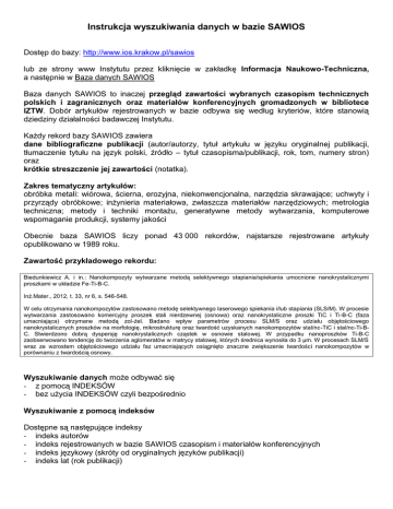 Instrukcja wyszukiwania danych w bazie SAWIOS Dostęp do bazy: http://www.ios.krakow.pl/sawios lub ze strony www Instytutu przez kliknięcie w zakładkę Informacja Naukowo-Techniczna, a następnie w Baza danych SAWIOS Baza danych SAWIOS to inaczej przegląd zawartości wybranych czasopism technicznych polskich i zagranicznych oraz materiałów konferencyjnych gromadzonych w bibliotece IZTW. Dobór artykułów rejestrowanych w bazie odbywa się według kryteriów, które stanowią dziedziny działalności badawczej Instytutu. Każdy rekord bazy SAWIOS zawiera dane bibliograficzne publikacji (autor/autorzy, tytuł artykułu w języku oryginalnej publikacji, tłumaczenie tytułu na język polski, źródło – tytuł czasopisma/publikacji, rok, tom, numery stron) oraz krótkie streszczenie jej zawartości (notatka). Zakres tematyczny artykułów: obróbka metali: wiórowa, ścierna, erozyjna, niekonwencjonalna, narzędzia skrawające; uchwyty i przyrządy obróbkowe; inżynieria materiałowa, zwłaszcza materiałów narzędziowych; metrologia techniczna; metody i techniki montażu, generatywne metody wytwarzania, komputerowe wspomaganie produkcji, systemy jakości Obecnie baza SAWIOS liczy ponad 43 000 rekordów, najstarsze rejestrowane artykuły opublikowano w 1989 roku. Zawartość przykładowego rekordu: Biedunkiewicz A. i in.: Nanokompozyty wytwarzane metodą selektywnego stapiania/spiekania umocnione nanokrystalicznymi proszkami w układzie Fe-Ti-B-C. Inż.Mater., 2012, t. 33, nr 6, s. 546-548. W celu otrzymania nanokompozytów zastosowano metodę selektywnego laserowego spiekania i/lub stapiania (SLS/M). W procesie wytwarzania zastosowano komercyjny proszek stali nierdzewnej (osnowa) oraz nanokrystaliczne proszki TiC i Ti-B-C (faza umacniająca) otrzymane metodą zol-żel. Badano wpływ parametrów procesu SLM/S oraz udziału objętościowego nanokrystalicznych proszków na morfologię, mikrostrukturę oraz twardość uzyskanych nanokompozytów stal/nc-TiC i stal/nc-Ti-BC. Stwierdzono dobrą dyspersję nanokrystalicznych cząstek w osnowie stalowej. W przypadku nanoproszków Ti-B-C zaobserwowano tendencję do tworzenia aglomeratów w matrycy stalowej, których średnica wynosiła do 3 µm. W procesach SLM/S wraz ze wzrostem objętościowego udziału faz umacniających osiągnięto znaczne zwiększenie twardości nanokompozytów w porównaniu z twardością osnowy. Wyszukiwanie danych może odbywać się z pomocą INDEKSÓW bez użycia INDEKSÓW czyli bezpośrednio Wyszukiwanie z pomocą indeksów Dostępne są następujące indeksy indeks autorów indeks rejestrowanych w bazie SAWIOS czasopism i materiałów konferencyjnych indeks językowy (skróty od oryginalnych języków publikacji) indeks lat (rok publikacji) Indeksy pełnią funkcję pomocniczą, tj. kliknięcie na wybranego autora, czasopismo lub język powoduje, że uzyskujemy wynik w postaci zbioru wszystkich rekordów danego autora lub autorów zbioru wszystkich rekordów zarejestrowanych w bazie pochodzących z danego czasopisma zbioru wszystkich rekordów z tytułem oryginalnym publikacji w wybranym języku zbioru wszystkich rekordów artykułów opublikowanych w wybranym roku Wyszukiwanie bezpośrednie czyli według określonych kryteriów Proszę rozwinąć listę dostępnych pól wyszukiwawczych (z lewej strony) i wybrać właściwe pole, jak niżej Wybieramy spośród następujących pól: autorzy słowa z tytułu oryginału słowa z tytułu w j. polskim słowa z notatki skrót tytułu czasopisma język rok dowolne słowa opisu Formularz wyszukiwania składa się z trzech wierszy – pól, które możemy dowolnie łączyć operatorami. Formularz akceptuje zarówno znaki diakrytyczne, jak też brak tych znaków np. cięcie, wiązanie, twardość, Tönshoff lub ciecie, wiazanie, twardosc, Tonshoff Po wpisaniu pierwszych liter nazwiska autora (podpowiada INDEKS z prawej strony) lub skrótu tytułu czasopisma (podpowiada INDEKS z prawej strony) rozwija się żółte pole z podpowiedziami aktywnymi, tj. kliknięcie w określone nazwisko lub tytuł czasopisma powoduje umieszczenie tego kryterium w polu wyszukiwawczym. Przykład: Wybieramy najskuteczniejsze kryteria wyszukiwania (jeśli nie znamy nazwiska autora ani tytułu czasopisma) czyli ,,dowolne słowa opisu” lub ,,słowa z notatki”- nazywamy po polsku temat, na który poszukujemy informacji. Proszę wpisywać terminy bez końcówki deklinacyjnej, bo wtedy nie zawężamy kryterium wyboru. dowolne słowa opisu [można wpisać kilka obok siebie] lub słowa z notatki [można wpisać kilka obok siebie] np. toczen żeliw sferoidal zamiast ,,toczenie żeliwa sferoidalnego” uchwyt tokarsk zamiast ,,uchwyt tokarski” struktur gradientow selektywn spiekan laser rapid prototyp ceramik azotk powł nanostruktur powł diamentopodobn profilom niepewnoś pomiar Rezultat wyszukiwania będzie tym dokładniejszy, im precyzyjniej sformułujemy pytanie. Oznacza to, że należy wybrać możliwie dokładne kryteria. Dodatkowo wyniki wyszukiwania możemy zawężać: - można wybrać lata publikacji, które nas interesują - język oryginału (jeden!) patrz: Zawężanie wyników wyszukiwania Jeśli temat jest bardzo szczegółowy, nie należy zawężać kryteriów wyszukiwania. Proszę wybrać operator logiczny (łączy pola wyszukiwawcze): iloczyn (AND), suma (OR), różnica (to co w pierwszym okienku, z wyłączeniem tego co w drugim) – w takim przypadku możemy wypełnić tylko dwa pola - ta funkcja działa tylko w odniesieniu do kryteriów: autorzy i słowa z notatki Nacisnąć klawisz: SZUKAJ i sprawdzić wyniki wyszukiwania Wypełniony formularz wyszukiwania - przykłady A oto fragment wyniku wyszukiwania – odpowiedź wg kryteriów podanych w pierwszym przykładzie Proszę zwrócić uwagę na okno powyżej tj. wybrane kryteria oraz łączenie warunków: wybraliśmy artykuły autorstwa p. Pofelskiej z wyłączeniem tych, których współautorem jest p. Czechowski. A oto fragme