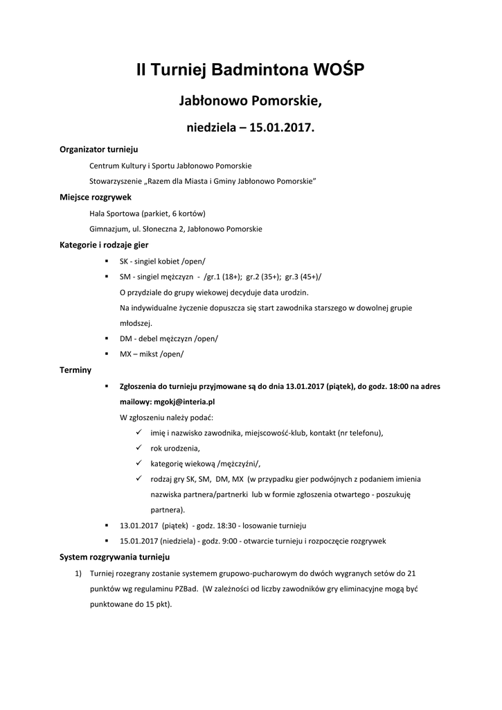 II Turniej Badmintona WOŚP Jabłonowo Pomorskie, niedziela – 15.01.2017. Organizator turnieju Centrum Kultury i Sportu Jabłonowo Pomorskie Stowarzyszenie „Razem dla Miasta i Gminy Jabłonowo Pomorskie” Miejsce rozgrywek Hala Sportowa (parkiet, 6 kortów) Gimnazjum, ul. Słoneczna 2, Jabłonowo Pomorskie Kategorie i rodzaje gier SK - singiel kobiet /open/ SM - singiel mężczyzn - /gr.1 (18+); gr.2 (35+); gr.3 (45+)/ O przydziale do grupy wiekowej decyduje data urodzin. Na indywidualne życzenie dopuszcza się start zawodnika starszego w dowolnej grupie młodszej. DM - debel mężczyzn /open/ MX – mikst /open/ Zgłoszenia do turnieju przyjmowane są do dnia 13.01.2017 (piątek), do godz. 18:00 na adres Terminy mailowy: [email protected] W zgłoszeniu należy podać: imię i nazwisko zawodnika, miejscowość-klub, kontakt (nr telefonu), rok urodzenia, kategorię wiekową /mężczyźni/, rodzaj gry SK, SM, DM, MX (w przypadku gier podwójnych z podaniem imienia nazwiska partnera/partnerki lub w formie zgłoszenia otwartego - poszukuję partnera). 13.01.2017 (piątek) - godz. 18:30 - losowanie turnieju 15.01.2017 (niedziela) - godz. 9:00 - otwarcie turnieju i rozpoczęcie rozgrywek System rozgrywania turnieju 1) Turniej rozegrany zostanie systemem grupowo-pucharowym do dwóch wygranych setów do 21 punktów wg regulaminu PZBad. (W zależności od liczby zawodników gry eliminacyjne mogą być punktowane do 15 pkt). 2) Turniej rozegrany będzie we wszystkich rodzajach gier w każdej kategorii wiekowej przy minimalnej liczbie 4 zgłoszeń. Przy liczbie zgłoszeń mniejszej niż 4 zawodnicy zostaną automatycznie przypisani do grupy młodszej. 3) Zawodnik może brać udział maksymalnie w dwóch grach różnego rodzaju, ale nie w 2 kategoriach wiekowych tego samego rodzaju gry. 4) Turniej odbywa się bez sędziów kortowych - zwycięzca meczu podaje wynik sędziemu głównemu. 5) Obowiązuje aktualny ranking lotek PZBad.. 6) Wszelkie sprawy nie objęte regulaminem organizacyjnym oraz w sprawach spornych decyduje sędzia główny turnieju. 7) Rozstawienie zawodników odbywać się będzie wg informacji z innych turniejów oraz w miarę możliwości tak aby zawodnicy z jednej miejscowości (klubu) nie grali w jednej grupie. Sędzia turnieju Zbigniew Sowiński tel. +48 608 687 104 Wpisowe gra pojedyncza - 20 zł/osoba gra podwójna - 15 zł/osoba Nagrody Za zajęcie miejsc 1- 3 organizator przewiduje wręczenie dyplomów i medali. Postanowienia końcowe Organizator zapewnia lotki Mavis , napoje i poczęstunek kulinarny. Zawodnicy zobowiązani są posiadać strój sportowy i zmienne obuwie halowe, własny sprzęt do gry, w tym inne lotki niż j/w. Uczestnicy wyrażają zgodę na udostępnienie swojego wizerunku do celów medialnych przez organizatora. Organizator nie odpowiada za stan zdrowia uczestników turnieju. Organizator nie ponosi odpowiedzialności za ewentualne kontuzje, urazy oraz uszczerbki na zdrowiu zawodników biorących udział w turnieju. Zawodnicy biorą udział w zawodach na własną odpowiedzialność. Organizator nie odpowiada za wartościowe rzeczy pozostawione w szatniach. Warunkiem przystąpienia do zawodów jest złożenie przez zawodnika oświadczenia o braku przeciwwskazań zdrowotnych do udziału w zawodach. Kontakt Centrum Kultury i Sportu Jabłonowo Pomorskie tel: 56 49 59 137 email: [email protected] Dyrektor CKiS mgr Justyna Prajs