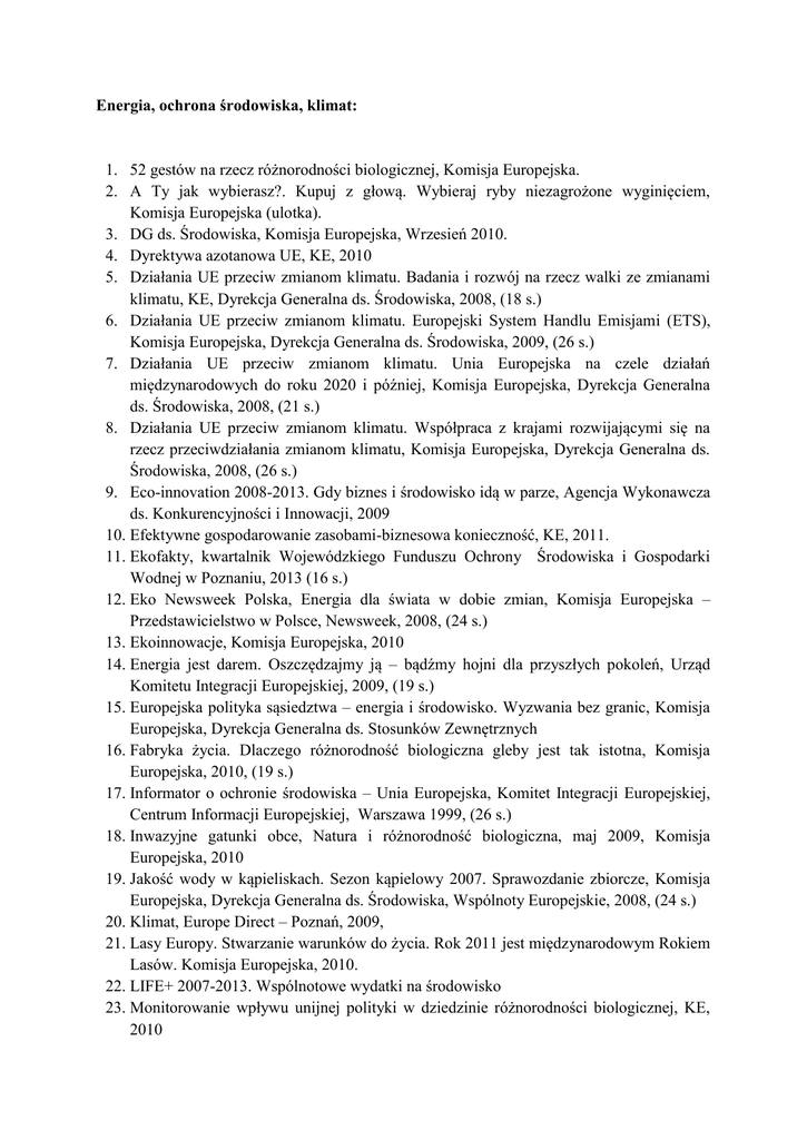 Energia, ochrona środowiska, klimat: 1. 52 gestów na rzecz różnorodności biologicznej, Komisja Europejska. 2. A Ty jak wybierasz?. Kupuj z głową. Wybieraj ryby niezagrożone wyginięciem, Komisja Europejska (ulotka). 3. DG ds. Środowiska, Komisja Europejska, Wrzesień 2010. 4. Dyrektywa azotanowa UE, KE, 2010 5. Działania UE przeciw zmianom klimatu. Badania i rozwój na rzecz walki ze zmianami klimatu, KE, Dyrekcja Generalna ds. Środowiska, 2008, (18 s.) 6. Działania UE przeciw zmianom klimatu. Europejski System Handlu Emisjami (ETS), Komisja Europejska, Dyrekcja Generalna ds. Środowiska, 2009, (26 s.) 7. Działania UE przeciw zmianom klimatu. Unia Europejska na czele działań międzynarodowych do roku 2020 i później, Komisja Europejska, Dyrekcja Generalna ds. Środowiska, 2008, (21 s.) 8. Działania UE przeciw zmianom klimatu. Współpraca z krajami rozwijającymi się na rzecz przeciwdziałania zmianom klimatu, Komisja Europejska, Dyrekcja Generalna ds. Środowiska, 2008, (26 s.) 9. Eco-innovation 2008-2013. Gdy biznes i środowisko idą w parze, Agencja Wykonawcza ds. Konkurencyjności i Innowacji, 2009 10. Efektywne gospodarowanie zasobami-biznesowa konieczność, KE, 2011. 11. Ekofakty, kwartalnik Wojewódzkiego Funduszu Ochrony Środowiska i Gospodarki Wodnej w Poznaniu, 2013 (16 s.) 12. Eko Newsweek Polska, Energia dla świata w dobie zmian, Komisja Europejska – Przedstawicielstwo w Polsce, Newsweek, 2008, (24 s.) 13. Ekoinnowacje, Komisja Europejska, 2010 14. Energia jest darem. Oszczędzajmy ją – bądźmy hojni dla przyszłych pokoleń, Urząd Komitetu Integracji Europejskiej, 2009, (19 s.) 15. Europejska polityka sąsiedztwa – energia i środowisko. Wyzwania bez granic, Komisja Europejska, Dyrekcja Generalna ds. Stosunków Zewnętrznych 16. Fabryka życia. Dlaczego różnorodność biologiczna gleby jest tak istotna, Komisja Europejska, 2010, (19 s.) 17. Informator o ochronie środowiska – Unia Europejska, Komitet Integracji Europejskiej, Centrum Informacji Europejskiej, Warszawa 1999, (26 s.) 18. Inwazyjne gatunki obce, Natura i różnorodność biologiczna, maj 2009, Komisja Europejska, 2010 19. Jakość wody w kąpieliskach. Sezon kąpielowy 2007. Sprawozdanie zbiorcze, Komisja Europejska, Dyrekcja Generalna ds. Środowiska, Wspólnoty Europejskie, 2008, (24 s.) 20. Klimat, Europe Direct – Poznań, 2009, 21. Lasy Europy. Stwarzanie warunków do życia. Rok 2011 jest międzynarodowym Rokiem Lasów. Komisja Europejska, 2010. 22. LIFE+ 2007-2013. Wspólnotowe wydatki na środowisko 23. Monitorowanie wpływu unijnej polityki w dziedzinie różnorodności biologicznej, KE, 2010 24. Nasz region rozwija się z Europą, Nr 1/2010, Biuletyn Informacyjny Wielkopolskiego Regionalnego Programu Operacyjnego na lata 2007-20103, (15 s.) 25. Nasz region rozwija się z Europą, Nr 1/2013, Biuletyn Informacyjny Wielkopolskiego Regionalnego Programu Operacyjnego na lata 2007-2013, (16 s.) 26. Natura 2000 w regionie alpejskim, Komisja Europejska, 2010, (15 s.) 27. Natura 2000 w regionie kontynentalnym, Komisja Europejska, 2010, (11 s.) 28. Natura 2000. Nasza europejska przyroda w 27 państwach członkowskich UE, 2009, (28 s.) 29. Natura 2000. Partnerska ochrona przyrody, Komisja Europejska, 2009, (15 s.) 30. Negocjacje klimatyczne. Kopenhaga budzi wielkie nadzieje, Przyroda dla Europejsczyków,36/2009, Magazyn DG ds. Środowiska, Komisja Europejska, (15 s.) 31. Ochrona środowiska. Przedsiębiorcy, Urząd Komitetu Integracji Europejskiej, 2008, (48 s.) 32. Ochrona środowiska. Samorządy, Urząd Komitetu Integracji Europejskiej, 2008, (36 s.) 33. Pakiet klimatyczno-energetyczny. Analityczna ocena propozycji Komisji Europejskiej, Urząd Komitetu Integracji Europejskiej, Departament Polityki Integracyjnej, 2008, (553 s.), BF 34. Produkty i funkcje ekosystemu, wrzesień 2009, Komisja Europejska, 2010 35. Program Operacyjny Infrastruktura I Środowisko 2007-2013. V priorytet – Ochrona przyrody i kształtowanie postaw ekologicznych, Centrum Koordynacji Projektów Środowiskowych, Warszawa 2008, (18 s.) 36. Przyroda dla Europejczyków, W ochronie różnorodności biologicznej Europy, Magazyn DG ds. Środowiska, Nr 38 maj 2010, Komisja Europejska (15 s.) 37. Przyroda dla Europejczyków. Efektywne gospodarowanie zasobami. Przez mniejsze zużycie ku lepszemu życiu. Magazyn Dyrekcji Generalnej ds. Środowiska, Komisja Europejska, 15 s. 38. Przyroda dla Europejczyków. Natura 2000 – na rzecz natury i dla ludzi. Magazyn dyrekcji ds. Środowiska, Komisja Europejska, 15 s. 39. Przyroda dla Europejczyków. Szerzenie zielonego przesłania na całym świecie. Magazyn DG ds. Środowiska, Nr 45 grudzień 2011, Komisja Europejska, (15 s.) 40. Przyroda dla rozwoju Europejczyków. W obliczu zmieniającego się klimatu, Nr 35 2009, (15 s.) 41. Przyroda dla Europejczyków. Magazyn Dyrekcji Generalnej ds. Środowiska, Komisja Europejska, nr 50, 2013, (16 s.) 42. Racjonalniej i ekologicznej. Zrównoważona konsumpcja i produkcja, KE, 2010, (25 s.) 43. Ramowa dyrektywa wodna, Komisja Europejska, Listopad 2010. 44. Razem w sieci. Obywatele wobec zmian klimatycznych i przyszłości energetycznej Unii Europejskiej. Praca zbiorowa pod redakcją Mikołaja J. Tomaszyka i Adama Jaskulskiego, Wydawnictwo Naukowe WNPiD UAM, Poznań 2008, Europe DirectPoznań, (118 s.) 45. Rola przyrody w zmianach klimatu, Natura i różnorodność biologiczna, sierpień 2009, Komisja Europejska, 2010 46. Rozporządzenie UE w sprawie drewna, które zacznie obowiązywać od dnia 3 marca 2013 r., Komisja Europejska 2010. 47. Segregacja? To się opłaca, Urząd Komitetu Integracji Europejskiej, 2009, (19 s.) 48. Stan chronionej przyrody w Europie, Komisja Europejska 2010 (24 s.) 49. Sygnały 2009 EEA. Kluczowe problemy środowiskowe, z którymi musi zmierzyć się Europa, Europejska Agencja Środowiskowa, 2009, (38 s.) 50. Sygnały EEA 2010. Różnorodność biologiczna, zmiany klimatu i TY, Europejska Agencja Środowis