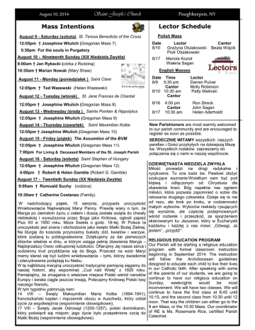 Poughkeepsie, NY Saint Joseph’s Church August 10, 2014 Mass Intentions August 9 - Saturday (sobota) St. Teresa Benedicta of the Cross 12:05pm † Josephine Wtulich (Gregorian Mass 7) 5:30pm For the souls in Purgatory August 10 - Nineteenth Sunday (XIX Niedziela Zwykła) Lector Schedule Polish Mass Date 8/10 Lector Grażyna Otulakowski Piotr Otulakowski 8/17 Mariola Kozioł Waleria Sagan 9:00am † Jan Rybacki (córka z Rodziną) 10:30am † Marian Nowak (Mary Shaw) August 11 - Monday (poniedziałek ) Saint Clare 12:05pm † Ted Wazewski (Helen Wazewski) August 12 - Tuesday (wtorek) St. Jane Frances de Chantal Cantor Beata Wójcik English Masses Date Time 8/9 5:30 pm Cantor 8/10 10:30 am Cantor 12:05pm † Josephine Wtulich (Gregorian Mass 8) 8/16 August 13 - Wednesday (środa ) Saints Pontian & Hippolytus 8/17 4:00 pm Cantor 10:30 am Lector Darren Pulver Molly Robinson Patty Malinski Ron Streck John Sagan Helen Aderholdt 12:05pm † Josephine Wtulich (Gregorian Mass 9) August 14 - Thursday (czwartek) Saint Maximilian Kolbe 12:05pm † Josephine Wtulich (Gregorian Mass 10) August 15 - Friday (piątek) The Assumtion of the BVM 12:05pm † Josephine Wtulich (Gregorian Mass 11) 7:00pm For Living & Deceased Members of the St. Joseph Parish New Parishioners are most warmly welcomed to our parish community and are encouraged to register as soon as possible. SERDECZNIE WITAMY wszystkich naszych parafian i Gości przybyłych na dzisiejszą Mszę św. Wszystkich rodaków zapraszamy do połączenia się z nami w naszej wspólnocie. August 16 - Saturday (sobota) Saint Stephen of Hungary 12:05pm † Josephine Wtulich (Gregorian Mass 12) 4:00pm † Robert & Helen Gamble (Robert G. Gamble) August 17 - Twentieth Sunday (XX Niedziela Zwykła) 9:00am † Romuald Suchy (rodzina) 10:30am † Catherine Costanzo (Family) W nadchodzący piątek, 15 sierpnia, przypada uroczystość Wniebowzięcia Najświętszej Maryi Panny. Prawdę wiary o tym, że Maryja po ziemskim życiu z ciałem i duszą została wzięta do chwały niebieskiej i wywyższona przez Boga jako Królowa, ogłosił papież Pius XII w 1950 roku. Msza Swieta o godz. 19-tej. W Polsce ta uroczystość jest znana i obchodzona jako święto Matki Bożej Zielnej. Na liturgię do kościoła przynosimy bukiety ziół, kwiatów i warzyw, które zostaną tu pobłogosławione. Dziękujemy za dar pierwszych zbiorów właśnie w dniu, w którym osiąga pełnię zbawienia Maryja – Najdojrzalszy Owoc odkupionej ludzkości. Ofiarujmy Jej nasze serca i codzienny trud przybliżania się do Boga. Przecież na wzór Maryi mamy starać się być ludźmi wniebowzięcia – tymi, którzy świadomie i zdecydowanie podążają ku Niebu. W tę najbliższą maryjną uroczystość tradycyjnie pamięcią sięgamy do naszej historii, aby wspominać „Cud nad Wisłą” z 1920 roku. Pamiętajmy, że zmagania o właściwe miejsce Polski wśród narodów Europy i świata ciągle jeszcze trwają. Polecajmy Królowej Polski losy naszego Narodu. W tym tygodniu patronują nam: 14 VIII – Święty Maksymilian Maria Kolbe (1894-1941), franciszkański kapłan i męczennik obozu w Auschwitz, który oddał życie za współwięźnia (wspomnienie obowiązkowe); 17 VIII – Święty Jacek Odrowąż (1200-1257), polski dominikanin, który poświęcił się misjom; jego życie było przepełnione czcią do Matki Bożej (wspomnienie obowiązkowe). DZIEWIĘTNASTA NIEDZIELA ZWYKŁA Miłość prowadzi na drogi radykalne i ryzykowne. To ona każe św. Pawłowi złożyć szokujące wyznanie:Wolałbym sam być pod klątwą i odłączonym od Chrystusa dla zbawienia braci. Bóg napełnia nas ogniem miłości, która pozwala zapomnieć o sobie dla ratowania drugiego człowieka. Dzieje się to nie od razu, ale krok po kroku, w codzienności małych wyborów. Wyborów niekiedy rysujących się wyraźnie, ale częściej podejmowanych wśród rozterek i przeszkód, ze spojrzeniem skierowanym ku Jezusowi, który w Eucharystii każdemu i każdej z nas mówi: „Odwagi, Ja jestem”, „przyjdź!”. RELIGIOUS EDUCATION PROGRAM Our Parish will be starting a religious education program with formal classroom instruction beginning in September 2014. The instruction will follow the Archdiocesan guidelines designed to educate each child to live their lives in our Catholic faith. After speaking with some of the parents of our students, we are going to continue to have our religious education on Sunday; weeknights would be most inconvenient. We will have two classes. We will continue to have the first class at 8:45 until 10:15, and the second class from 10:30 until 12 noon. That way the children can either go to the 9 am Mass, or the 10:30 Mass. Our coordimator of RE is Ms. Rosemarie Rice, certified Parish Catechist. Saint Joseph’s Church August 10, 2014 Weekly Collections Last Week’s Offering - Weekend August 3rd I Collection $ 1,097.25 II Collection (monthly) $ 687.00 Assumption $ 30.00 Daily Masses $ 188.25 Votive Candles $ 313.35 WEEKLY OFFERINGS TOTAL $ OUR WEEKLY BUDGET IS 2,315.85 $ 2,309.18 Thank you for your generosity! OUR STEWARDSHIP This week we have the Regular Collection and Support the Church in Latin America Next week we have the Regular Collection and Assumption of the Blessed Virgin Mary St. Joseph’s Polish Festival: Kirchhoff-Consigli Construction - $500.00 Effron - $300.00 Bozena & Miroslaw Sulewscy - $300.00 St. Joseph's Church Polish Library - $200.00 Dorsey Metrology International - $150.00 Eleanor L. Badura/Edward Badura - $100.00 Beata Mroczek/ Krzysztof Mroczek - $100.00 Romuald Magryta/ Maria Magryta - $100.00 A. Page & Associates LLC - $100.00 Kirchhoff Green Energy - $75.00 Julia Wasilewski - $50.00 Rose Krukiel - $50.00 Marion L. Cataldi - $50.00 Rhinebeck Bank - $50.00 John Zabawski - $25.00 Stanley M. Zabawski - $25.00 Stephanie Sokolowski - $25.00 Anna Mae Tkazyik - $25.00 Poughkeepsie, NY ST'JOSEPH'S POLISH FESTIVAL Saturday 8/16/2014 10:00 AM - Grand Opening following 
