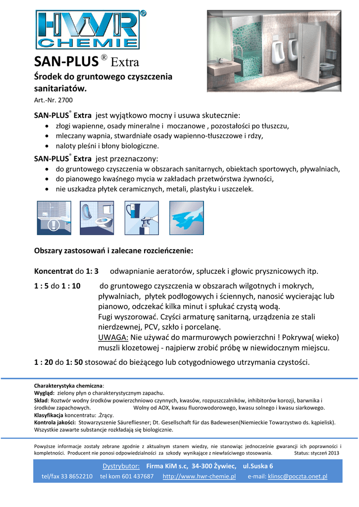 SAN-PLUS ® Extra Środek do gruntowego czyszczenia sanitariatów. Art.-Nr. 2700 SAN-PLUS® Extra jest wyjątkowo mocny i usuwa skutecznie: złogi wapienne, osady mineralne i moczanowe , pozostałości po tłuszczu, mleczany wapnia, stwardniałe osady wapienno-tłuszczowe i rdzy, naloty pleśni i błony biologiczne. SAN-PLUS® Extra jest przeznaczony: do gruntowego czyszczenia w obszarach sanitarnych, obiektach sportowych, pływalniach, do pianowego kwaśnego mycia w zakładach przetwórstwa żywności, nie uszkadza płytek ceramicznych, metali, plastyku i uszczelek. Obszary zastosowań i zalecane rozcieńczenie: Koncentrat do 1: 3 1 : 5 do 1 : 10 odwapnianie aeratorów, spłuczek i głowic prysznicowych itp. do gruntowego czyszczenia w obszarach wilgotnych i mokrych, pływalniach, płytek podłogowych i ściennych, nanosid wycierając lub pianowo, odczekad kilka minut i spłukad czystą wodą. Fugi wyszorowad. Czyści armaturę sanitarną, urządzenia ze stali nierdzewnej, PCV, szkło i porcelanę. UWAGA: Nie używad do marmurowych powierzchni ! Pokrywa( wieko) muszli klozetowej - najpierw zrobid próbę w niewidocznym miejscu. 1 : 20 do 1: 50 stosowad do bieżącego lub cotygodniowego utrzymania czystości. Charakterystyka chemiczna: Wygląd: zielony płyn o charakterystycznym zapachu. Skład: Roztwór wodny środków powierzchniowo czynnych, kwasów, rozpuszczalników, inhibitorów korozji, barwnika i środków zapachowych. Wolny od AOX, kwasu fluorowodorowego, kwasu solnego i kwasu siarkowego. Klasyfikacja koncentratu: .Żrący. Kontrola jakości: Stowarzyszenie Säurefliesner; Dt. Gesellschaft für das Badewesen(Niemieckie Towarzystwo ds. kąpielisk). Wszystkie zawarte substancje rozkładają się biologicznie. Powyższe informacje zostały zebrane zgodnie z aktualnym stanem wiedzy, nie stanowiąc jednocześnie gwarancji ich poprawności i kompletności. Producent nie ponosi odpowiedzialności za szkody wynikające z niewłaściwego stosowania. Status: styczeo 2013 Dystrybutor: Firma KiM s.c, 34-300 Żywiec, ul.Suska 6 tel/fax 33 8652210 tel kom 601 437687 http://www.hwr-chemie.pl e-mail: [email protected]