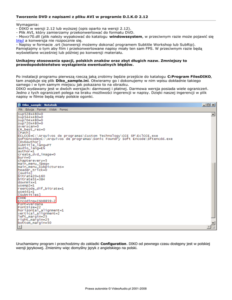 Tworzenie DVD z napisami z pliku AVI w programie D.I.K.O 2.12 Wymagania: - DIKO w wersji 2.12 lub wyższej (opis oparto na wersji 2.12). - Plik AVI, który zamierzamy przekonwertować do formatu DVD. - Msvcr70.dll (plik należy wypakować do katalogu windowssystem, w przeciwnym razie może pojawić się błąd a konwersja nie rozpocznie się. - Napisy w formacie .srt (konwersji możemy dokonać programem Subtitle Workshop lub SubRip). Pamiętajmy o tym aby film i przekonwertowane napisy miały ten sam FPS. W przeciwnym razie będą wyświetlane wcześniej lub później po konwersji materiału. Unikajmy stosowania spacji, polskich znaków oraz zbyt długich nazw. Zmniejszy to prawdopodobieństwo wystąpienia ewentualnych błędów. Po instalacji programu pierwszą rzeczą jaką zrobimy będzie przejście do katalogu C:Program FilesDIKO, tam znajduje się plik Diko_sample.ini. Otwieramy go i dokonujemy w nim wpisu dokładnie takiego samego i w tym samym miejscu jak pokazano to na obrazku. DIKO wydawany jest w dwóch wersjach: darmowej i płatnej. Darmowa wersja posiada wiele ograniczeń. Jedno z tych ograniczeń polega na braku możliwości ingerencji w napisy. Dzięki naszej ingerencji w plik napisy w filmie będą miały polskie ogonki. Uruchamiamy program i przechodzimy do zakładki Configuration. DIKO od pewnego czasu dostępny jest w polskiej wersji językowej. Zmienimy więc domyślny język z angielskiego na polski. Prawa autorskie © VideoAudio.pl 2001-2008 Zmiany wersji językowej dokonujemy w zakładce Parameters. Po wybraniu w Interface Language na Polish akceptujemy zmiany wciskając Ok. Aby zmiany, których przed chwilą dokonaliśmy odniosły skutek musimy zrestartować program DIKO. Zamykamy go i uruchamiamy ponownie. Prawa autorskie © VideoAudio.pl 2001-2008 Po tej operacji wszystkie komunikaty w programie wyświetlane będą w języku polskim. Zanim rozpoczenimy konwersję AVI do DVD skonfigurujemy w pierwszej kolejności aplikację i przygotujemy ją do pracy. Klikając na zakładkę Konfiguracja wchodzimy w dział ustawień. Ścieżka: Do konwersji video oraz audio możemy użyć darmowych wbudowanych dekoderów lub płatnych zewnętrznych. CCE jest płatnym koderem obrazu. Możemy użyć nakładki EclCCE dzięki, której na okres 30 dni użyskujemy możliwość użycia CCE do konwersji plików. Aby użyć CCE należy w pierwszej kolejności załadować go do EclCCE a dopiero później wskazać w podanej ścieżce lokalizację pliku EclCCE. Darmową alterantywą jest FreeEnc i na nim właśnie oprzemy opis. SoftEncode jest komercyjnym enkoderem odpowiedzialnym za konwersję dźwięku. Dla niego darmową alternatywą jest BeSweet, którego użyjemy w naszym opisie. Proszę zwrócić uwagę na fakt, że ścieżki do obu programów nie są aktywne. Dzieje się tak dlatego ponieważ w opcjach programu nie zostały one wybrane. Nasz opis będzie oparty na darmowym sofcie dlatego owe okna nie są aktywne. Ostatnia pozycja pozwala na wybór miejsca gdzie będą przechowywane pliki tymczasowe oraz finalne pliki zawierające przekonwertowany materiał. Proszę pamiętać aby wybierając folder był on wcześniej utworzony. Prawa autorskie © VideoAudio.pl 2001-2008 Parametry: Tryb BDVD tworzy strukturę DVD. Tryb BSVCD tworzy strukturę SVCD. System PAL/NTSC pozwala na wybór systemu. W przypadku polski będzie to PAL. Koder Video pozwala na wybór kodera za pomocą, którego dokonana zostanie konwersja. Pierwszy z nich CCE jest programem komercyjnym. FreeEnc jest darmowy. CCE z nakładką EclCCE oferuje 30 dniowy okres bezpłatnej pracy. Dodatkowo można wybrać konwersję wieloprzebiegową. Darmowy FreeEnc oferuje także konwersję wieloprzebiegową a dodatkowo jest programem darmowym. Koder dźwięku odpowiedzialny jest za konwersję audio. SoftEncode jest komercyjnym enkoderem. BeSweet jest alternatywnym darmowym narzędziem. Jaka jest między nimi różnica? Konwertując film AVI do DVD ze ścieżką dźwiękową w formacie AC3 używając BeSweet audio będzie przekonwertowane na stereo. W efekcie otrzymamy DVD ze steorofonicznym dźwiękiem. Jeżeli chcielibyśmy zachować ścieżkę dźwiękową wielokanałową musimy skorzystać z płatnego SoftEncode. Pokaż monitor AviSynth uaktywnia monitor procesów. Warto aktytować tą opcję. W dalszym opisie pokażemy jakie będą z tego korzyści. Prawa autorskie © VideoAudio.pl 2001-2008 Authoring: W tym przypadku możemy pozostawić wszystkie ustawienia tak jak pokazano to na poniższym zrzucie. Ważne jest aby zaznaczyć Authoring płyty. Video: Tryb kodowania umożliwia wybór ilości przebiegów. Dla tych, którym nie zależy zbytnio na jakości wystarczy 1 przebieg. Dla osób, którym zależy na jakości kosztem czasu polecam wybór kilku przebiegów. Jeżeli konwersji dokonujemy darmowym FreeEnc do wyboru mamy maksymalnie 2 przebiegi (po zaznaczeniu Kilka przebiegów VBR). W przypadku CCE mamy możliwość wyboru nawet 5 przebiegów. Pozostałe opcje można pozostawić na domyślnych ustawieniach. Jak widać część z okien nie jest aktywna. Są one dostępne wyłącznie w trybie używania CCE. Prawa autorskie © VideoAudio.pl 2001-2008 Dźwięk: Bitrate dla dźwięku 2.0 pozwala określić wartość bitrate. Domyślna wartość 160 jest odpowiednia. Bitrate dla dźwięku 5.1 aktywne jest tylko podczas używania Soft Encode. Także w tym przypadku możemy określić wartość bitrate ale dla dźwięku wielokanałowego. Napisy: Na początku opisu edytowaliśmy plik Diko_sample.ini. Dzięki tej operacji wybierając napisy jako Wklejone otrzymamy napisy "wtopione" w film z polskimi ogonkami. Tylko wersja GOLD programu DIKO pozwala na obecną chwilę swobodnie manewrować opcjami związanymi z napisami. Jest to ostatnie okno związane z konfiguracją programu. Teraz wciskamy OK aby zaakceptować zmiany. Prawa autorskie © VideoAudio.pl 2001-2008 Program mamy skonfigurowany. Jeżeli jesteśmy gotowi możemy rozpocząć przyg