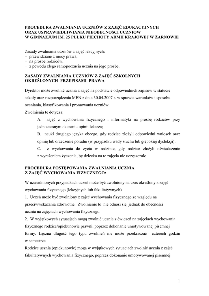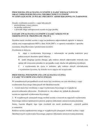PROCEDURA ZWALNIANIA UCZNIÓW Z ZAJĘĆ EDUKACYJNYCH ORAZ USPRAWIEDLIWIANIA NIEOBECNOŚCI UCZNIÓW W GIMNAZJUM IM. 25 PUŁKU PIECHOTY ARMII KRAJOWEJ W ŻARNOWIE Zasady zwalniania uczniów z zajęć lekcyjnych: − przewidziane z mocy prawa; − na prośbę rodziców; − z powodu złego samopoczucia ucznia na jego prośbę. ZASADY ZWALNIANIA UCZNIÓW Z ZAJĘĆ SZKOLNYCH OKREŚLONYCH PRZEPISAMI PRAWA Dyrektor może zwolnić ucznia z zajęć na podstawie odpowiednich zapisów w statucie szkoły oraz rozporządzenia MEN z dnia 30.04.2007 r. w sprawie warunków i sposobu oceniania, klasyfikowania i promowania uczniów. Zwolnienia te dotyczą: A. zajęć z wychowania fizycznego i informatyki na prośbę rodziców przy jednoczesnym okazaniu opinii lekarza; B. nauki drugiego języka obcego, gdy rodzice złożyli odpowiedni wniosek oraz opinię lub orzeczenie poradni (w przypadku wady słuchu lub głębokiej dysleksji); C. z wychowania do życia w rodzinie, gdy rodzice złożyli oświadczenie z wyrażeniem życzenia, by dziecko na te zajęcia nie uczęszczało. PROCEDURA POSTĘPOWANIA ZWALNIANIA UCZNIA Z ZAJĘĆ WYCHOWANIA FIZYCZNEGO: W uzasadnionych przypadkach uczeń może być zwolniony na czas określony z zajęć wychowania fizycznego (lekcyjnych lub fakultatywnych) 1. Uczeń może być zwolniony z zajęć wychowania fizycznego ze względu na przeciwwskazania zdrowotne. Zwolnienie to nie odnosi się jednak do obecności ucznia na zajęciach wychowania fizycznego. 2. W wyjątkowych sytuacjach mogą zwolnić ucznia z ćwiczeń na zajęciach wychowania fizycznego rodzice/opiekunowie prawni, poprzez dokonanie umotywowanej pisemnej formy. Łączna długość tego typu zwolnień nie może przekraczać czterech godzin w semestrze. Rodzice ucznia (opiekunowie) mogą w wyjątkowych sytuacjach zwolnić ucznia z zajęć fakultatywnych wychowania fizycznego, poprzez dokonanie umotywowanej pisemnej 1 formy. Łączna długość zwolnień od rodziców nie może przekraczać czterech godzin w semestrze. 4. Dokumentację dotyczącą doraźnych zwolnień z zajęć wychowania fizycznego przechowuje nauczyciel do końca semestru. 5. Dłuższe zwolnienie ucznia z zajęć wychowania fizycznego musi być poparte odpowiednim zaświadczeniem wystawionym przez lekarza - specjalistę. 6. Zaświadczenie lekarskie, wskazujące na konieczność zwolnienia ucznia z zajęć wychowania fizycznego na okres nie dłuższy niż 1 miesiąc, należy przekazać nauczycielowi wychowania fizycznego, który obowiązany jest przechowywać je do końca semestru. 7. Zaświadczenie lekarskie wystawione na okres dłuższy niż miesiąc, jednak nie obejmującego całego semestru, należy złożyć wraz z podaniem w sekretariacie szkoły. W przypadku dostarczenia kolejnego/kolejnych zaświadczeń dyrektor szkoły wydaje decyzje o zwolnieniu ucznia z zajęć wychowania fizycznego na podstawie tych zaświadczeń. 8. Zwolnienie może dotyczyć pierwszego lub drugiego semestru lub całego roku szkolnego, w zależności od wskazań lekarza zawartych w zaświadczeniu o ograniczonych możliwościach uczestniczenia ucznia w zajęciach. 9. O zwolnienie ucznia z zajęć wychowania fizycznego występują rodzice/opiekunowie prawni. Składają podanie ( zał. nr 1) do dyrektora szkoły w sekretariacie, na dziennik korespondencji, do którego dołączają zaświadczenie lekarskie. 10. Podanie należy przedłożyć dyrektorowi niezwłocznie po uzyskaniu zaświadczenia od lekarza, jednak nie później niż: a. w przypadku zwolnienia dotyczącego I semestru – do 15 września danego roku szkolnego, b. w przypadku zwolnienia dotyczącego II semestru – do 10 lutego danego roku szkolnego. c. w przypadku zdarzeń losowych i zaświadczeń lekarskich wystawionych w ciągu roku szkolnego rodzice składają podania poza ustalonymi wyżej terminami, jednak niezwłocznie po uzyskaniu zaświadczenia lekarskiego. 11. Zaświadczenie lekarskie zwalniające ucznia z ćwiczeń z wsteczną datą będzie respektowane od daty złożenia zaświadczenia. Zwolnienie nie dostarczone w terminie będzie ważne od daty jego złożenia w sekretariacie. 12. Dyrektor szkoły wydaje decyzję o zwolnieniu ucznia z zajęć w terminie do 7 dni 2 roboczych od daty wpływu podania. Rodzice/opiekunowie prawni odbierają decyzję dyrektora w sekretariacie szkoły. 13. O zwolnieniu ucznia z zajęć poinformowany zostaje nauczyciel prowadzący zajęcia oraz wychowawca ucznia. Fakt przyjęcia informacji do wiadomości potwierdzają podpisem złożonym na decyzji. 14. Jeżeli uczeń uzyskuje zwolnienie w trakcie roku szkolnego, a jego nieobecności na lekcjach nie przekroczyły połowy wymaganego czasu i są podstawy do wystawienia oceny, to wówczas uczeń podlega klasyfikacji z danego przedmiotu. 15. W przypadku zwolnienia ucznia z zajęć wychowania fizycznego przez cały semestr w dokumentacji przebiegu nauczania zamiast oceny klasyfikacyjnej wpisuje się „zwolniony”. 16. Uczeń zwolniony z zajęć wychowania fizycznego ma obowiązek być obecny na tych zajęciach, także w przypadkach, gdy lekcje te są pierwszymi lub ostatnimi zajęciami w danym dniu. 17. W wyjątkowych wypadkach, uczeń może być zwolniony z ostatnich lub pierwszych godzin lekcji wychowania fizycznego, na podstawie pisemnego oświadczenia rodziców/opiekunów prawnych złożonego w sekretariacie i po uzyskaniu zgody dyrektora szkoły. O tym fakcie informowani są nauczyciel wychowania fizycznego oraz wychowawca klasy. 18. Uczeń zwolniony z zajęć do domu ma zaznaczone w dzienniku nieobecności usprawiedliwione. 19. Zawarte w zaświadczeniu lekarskim ewentualne ograniczenia, skutkujące zwolnieniem z wykonywania wybranej grupy ćwiczeń, nie są podstawą do zwolnienia ucznia z zajęć wychowania fizycznego, który zobowiązany jest uwzględnić zalecenia lekarza w pracy z uczniem. 20. Z niniejsza procedurą zapoznaje uczniów nauczyciel wychowania fizycznego na pierwszych zajęciach w danym roku szkolnym, natomi