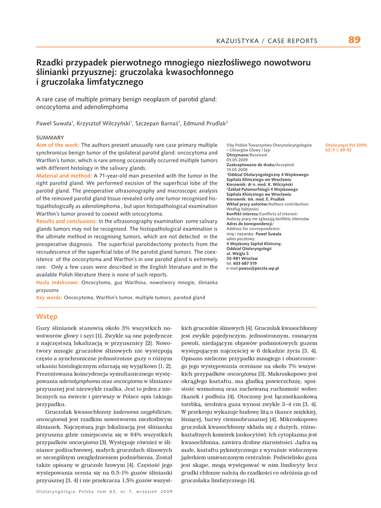 KAZUISTYKA / CASE REPORTS 89 Rzadki przypadek pierwotnego mnogiego niezłośliwego nowotworu ślinianki przyusznej: gruczolaka kwasochłonnego i gruczolaka limfatycznego A rare case of multiple primary benign neoplasm of parotid gland: oncocytoma and adenolimphoma Paweł Suwała1, Krzysztof Wilczyński1, Szczepan Barnaś1, Edmund Prudlak 2 SUMMARY Aim of the work: The authors present unusually rare case primary multiple synchronicus benign tumor of the ipsilateral parotid gland: oncocytoma and Warthin’s tumor, which is rare among occasionally occurred multiple tumors with different histology in the salivary glands. Material and method: A 71-year-old man presented with the tumor in the right parotid gland. We performed excision of the superficial lobe of the parotid gland. The preoperative ultrasonography and macroscopic analysis of the removed parotid gland tissue revealed only one tumor recognised histopathologically as adenolimphoma , but upon histopathological examination Warthin’s tumor proved to coexist with oncocytoma. Results and conclusions: In the ultrasonography examination some salivary glands tumors may not be recognised. The histopathological examination is the ultimate method in recognising tumors, which are not detected in the preoperative diagnosis. The superfi cial parotidectomy protects from the recrudescence of the superfi cial lobe of the parotid gland tumors. The coexistence of the oncocytoma and Warthin’s in one parotid gland is extremely rare. Only a few cases were described in the English literature and in the available Polish literature there is none of such reports. ©by Polskie Towarzystwo Otorynolaryngologów – Chirurgów Głowy i Szyi Otrzymano/Received: 05.05.2009 Zaakceptowano do druku/Accepted: 15.05.2009 1 Oddział Otolaryngologiczny 4 Wojskowego Szpitala Klinicznego we Wrocławiu Kierownik: dr n. med. K. Wilczyński 2 Zakład Patomorfologii 4 Wojskowego Szpitala Klinicznego we Wrocławiu Kierownik: lek. med. E. Prudlak Wkład pracy autorów/Authors contribution: Według kolejności Konflikt interesu/Conflicts of interest: Autorzy pracy nie zgłaszają konfliktu interesów. Adres do korespondencji/ Address for correspondence: imię i nazwisko: Paweł Suwała adres pocztowy: 4 Wojskowy Szpital Kliniczny, Oddział Otolaryngologii ul. Weigla 5 50-981 Wrocław tel. 603 687 519 e-mail [email protected] Hasła indeksowe: Oncocytoma, guz Warthina, nowotwory mnogie, ślinianka przyuszna Key words: Oncocytoma, Warthin’s tumor, multiple tumors, parotod gland Wstęp Guzy ślinianek stanowią około 3% wszystkich nowotworów głowy i szyi [1]. Zwykle są one pojedyncze z najczęstszą lokalizacją w przyusznicy [2]. Nowotwory mnogie gruczołów ślinowych nie występują często a synchroniczne jednostronne guzy o różnym utkaniu histologicznym zdarzają się wyjątkowo [1, 2]. Prezentowana koincydencja symultanicznego występowania adenolymphoma oraz oncocytoma w śliniance przyusznej jest niezwykle rzadka. Jest to jeden z nielicznych na świecie i pierwszy w Polsce opis takiego przypadku. Gruczolak kwasochłonny (adenoma oxyphilicum, oncocytoma) jest rzadkim nowotworem niezłośliwym ślinianek. Najczęstszą jego lokalizacją jest ślinianka przyuszna gdzie umiejscawia się w 84% wszystkich przypadków oncocytoma [3]. Występuje również w śliniance podżuchwowej, małych gruczołach ślinowych ze szczególnym uwzględnieniem podniebienia. Został także opisany w gruczole łzowym [4]. Częstość jego występowania ocenia się na 0,5-1% guzów ślinianki przyusznej [3, 4] i nie przekracza 1,5% guzów wszystO t o l a r y n g o l o g i a P o l s k a t o m 6 3 , n r 7, w r z e s i e ń 2 0 0 9 kich gruczołów ślinowych [4]. Gruczolak kwasochłonny jest zwykle pojedynczym, jednostronnym, rosnącym powoli, niedającym objawów podmiotowych guzem występującym najczęściej w 6 dekadzie życia [3, 4]. Opisano nieliczne przypadki mnogiego i obustronnego jego występowania oceniane na około 7% wszystkich przypadków oncocytoma [3]. Makroskopowo jest okrągłego kształtu, ma gładką powierzchnię, spoistość wzmożoną oraz zachowaną ruchomość wobec tkanek i podłoża [4]. Otoczony jest łącznotkankową torebką, średnica guza wynosi zwykle 3–4 cm [3, 4]. W przekroju wykazuje budowę litą o tkance miękkiej, lśniącej, barwy ciemnobrunatnej [4]. Mikroskopowo gruczolak kwasochłonny składa się z dużych, różnokształtnych komórek (onkocytów). Ich cytoplazma jest kwasochłonna, zawiera drobne ziarnistości. Jądra są małe, kształtu pyknotycznego z wyraźnie widocznym jąderkiem umieszczonym centralnie. Podścielisko guza jest skąpe, mogą występować w nim limfocyty lecz grudki chłonne należą do rzadkości co odróżnia go od gruczolaka limfatycznego [4]. Otolaryngol Pol 2009; 63 (7 ): 89-92 90 KAZU ISTYKA / CASE REPORTS Ryc. 1. Widoczne typowe utkanie adenolymphoma z komponentą nabłonkową, tworzącą struktury gruczołowe oraz tkanką limfatyczną z ośrodkiem rozmnażania. Tkankę nabłonkową od limfatycznej oddziela wyraźna błona podstawna. Barwienie H-E, pow. 100x. Ryc. 2. Oncocytoma. Wieloboczne komórki z ziarnistą kwasochłonną cytoplazmą oraz pyknotycznym jądrem. Obok widoczne prawidłowe utkanie ślinianki. Barwienie H-E, pow. 100x. Guz Warthina (gruczolak limfatyczny, adenolymphoma, cystoadenoma papillare lymphomatosum) jest łagodnym nowotworem lokalizującym się niemal wyłącznie w śliniance przyusznej, najczęściej w dolnym biegunie płata powierzchownego. Opisywano kazuistyczne przypadki jego występowania w małych gruczołach krtani, podniebienia twardego, wargi górnej i dolnej, przestrzeni przygardłowej, w gruczole łzowym oraz części nosowej gardła [5, 6]. Pojawia się zwykle u osób między 4 a 7 dekadą życia [6], choć może wystąpić już u dzieci [4, 7]. Znacznie częściej adenolymphoma rozpoznawana jest u mężczyzn ale w ostatnich latach znacznie wzrosła zachorowalność na ten typ no