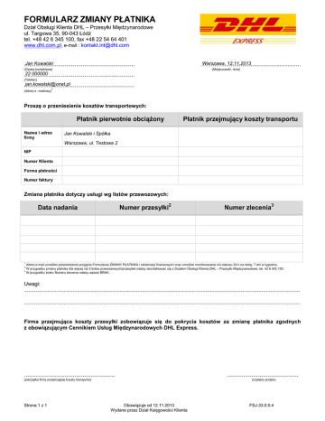 FORMULARZ ZMIANY PŁATNIKA Dział Obsługi Klienta DHL – Przesyłki Międzynarodowe ul. Targowa 35, 90-043 Łódź tel. +48 42 6 345 100, fax +48 22 54 64 401 www.dhl.com.pl, e-mail : [email protected] Jan Kowalski .................................................................... Warszawa, 12.11.2013 …….…….............................................. (Miejscowość, dnia) (Osoba kontaktowa) 22 000000 .................................................................... (Telefon) [email protected] .................................................................... (Adres e –mailowy) 1 Proszę o przeniesienie kosztów transportowych: Płatnik pierwotnie obciążony Nazwa i adres firmy Płatnik przejmujący koszty transportu Jan Kowalski i Spółka Warszawa, ul. Testowa 2 NIP Numer Klienta Forma płatności Numer faktury Zmiana płatnika dotyczy usługi wg listów przewozowych: Numer przesyłki2 Data nadania 1 2 3 Numer zlecenia3 Adres e-mail umożliwi potwierdzenie przyjęcia Formularza ZMIANY PŁATNIKA i reklamacji finansowych oraz umożliwi monitorowanie ich statusu 24 h na dobę, 7 dni w tygodniu. W przypadku zmiany płatnika dla więcej niż 5 listów przewozowych/przesyłek należy skontaktować się z Działem Obsługi Klienta DHL – Przesyłki Międzynarodowe, tel. 42 6 345 100. . W przypadku braku Numeru zlecenia należy wpisać BRAK. Uwagi: ........................................................................................................................................................................................... ........................................................................................................................................................................................... Firma przejmująca koszty przesyłki zobowiązuje się do pokrycia kosztów za zmianę płatnika zgodnych z obowiązującym Cennikiem Usług Międzynarodowych DHL Express. ........................................................ (pieczątka firmy przejmującej koszty transportu) Strona 1 z 1 ............................................ (czytelny podpis) Obowiązuje od 12.11.2013 Wydane przez Dział Księgowości Klienta FSJ-33.0.0.4