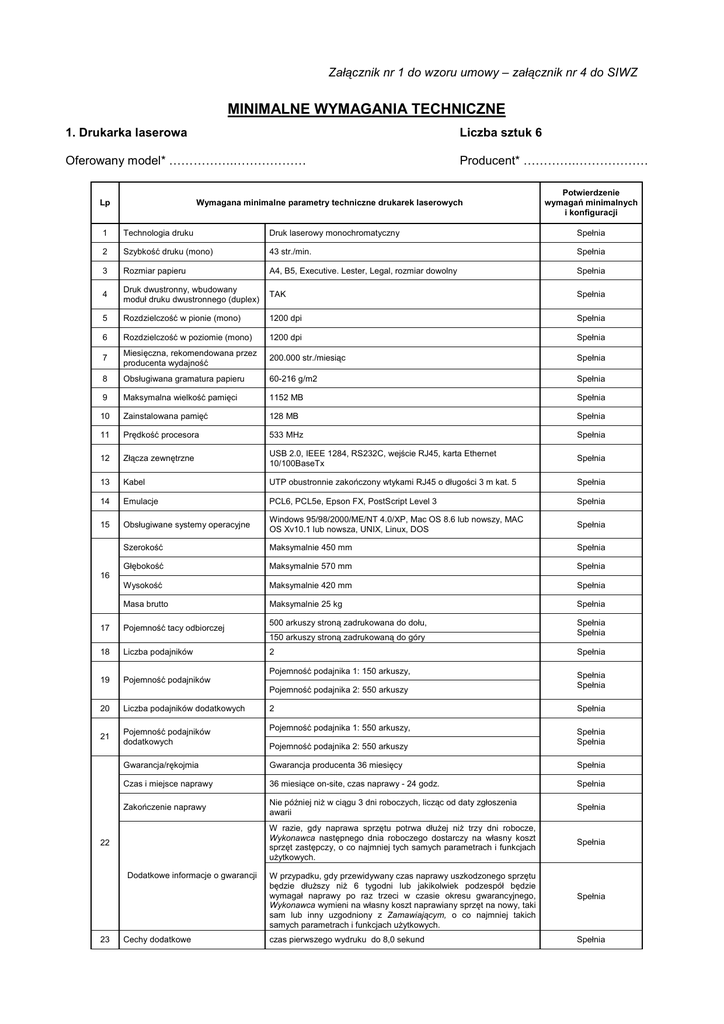 Załącznik nr 1 do wzoru umowy – załącznik nr 4 do SIWZ MINIMALNE WYMAGANIA TECHNICZNE 1. Drukarka laserowa Liczba sztuk 6 Oferowany model* …………….……………… Producent* ………….……………… Lp Wymagana minimalne parametry techniczne drukarek laserowych Potwierdzenie wymagań minimalnych i konfiguracji 1 Technologia druku Druk laserowy monochromatyczny Spełnia 2 Szybkość druku (mono) 43 str./min. Spełnia 3 Rozmiar papieru A4, B5, Executive. Lester, Legal, rozmiar dowolny Spełnia 4 Druk dwustronny, wbudowany moduł druku dwustronnego (duplex) TAK Spełnia 5 Rozdzielczość w pionie (mono) 1200 dpi Spełnia 6 Rozdzielczość w poziomie (mono) 1200 dpi Spełnia 7 Miesięczna, rekomendowana przez producenta wydajność 200.000 str./miesiąc Spełnia 8 Obsługiwana gramatura papieru 60-216 g/m2 Spełnia 9 Maksymalna wielkość pamięci 1152 MB Spełnia 10 Zainstalowana pamięć 128 MB Spełnia 11 Prędkość procesora 533 MHz Spełnia 12 Złącza zewnętrzne USB 2.0, IEEE 1284, RS232C, wejście RJ45, karta Ethernet 10/100BaseTx Spełnia 13 Kabel UTP obustronnie zakończony wtykami RJ45 o długości 3 m kat. 5 Spełnia 14 Emulacje PCL6, PCL5e, Epson FX, PostScript Level 3 Spełnia 15 Obsługiwane systemy operacyjne Windows 95/98/2000/ME/NT 4.0/XP, Mac OS 8.6 lub nowszy, MAC OS Xv10.1 lub nowsza, UNIX, Linux, DOS Spełnia Szerokość Maksymalnie 450 mm Spełnia Głębokość Maksymalnie 570 mm Spełnia Wysokość Maksymalnie 420 mm Spełnia Masa brutto Maksymalnie 25 kg Spełnia 500 arkuszy stroną zadrukowana do dołu, Spełnia Spełnia 16 17 Pojemność tacy odbiorczej 150 arkuszy stroną zadrukowaną do góry 18 Liczba podajników 19 Pojemność podajników 2 Spełnia Pojemność podajnika 1: 150 arkuszy, Spełnia Spełnia Pojemność podajnika 2: 550 arkuszy 20 Liczba podajników dodatkowych 21 Pojemność podajników dodatkowych Pojemność podajnika 1: 550 arkuszy, Pojemność podajnika 2: 550 arkuszy Spełnia Spełnia Spełnia Gwarancja/rękojmia Gwarancja producenta 36 miesięcy Spełnia Czas i miejsce naprawy 36 miesiące on-site, czas naprawy - 24 godz. Spełnia Zakończenie naprawy Nie później niŜ w ciągu 3 dni roboczych, licząc od daty zgłoszenia awarii Spełnia W razie, gdy naprawa sprzętu potrwa dłuŜej niŜ trzy dni robocze, Wykonawca następnego dnia roboczego dostarczy na własny koszt sprzęt zastępczy, o co najmniej tych samych parametrach i funkcjach uŜytkowych. Spełnia W przypadku, gdy przewidywany czas naprawy uszkodzonego sprzętu będzie dłuŜszy niŜ 6 tygodni lub jakikolwiek podzespół będzie wymagał naprawy po raz trzeci w czasie okresu gwarancyjnego, Wykonawca wymieni na własny koszt naprawiany sprzęt na nowy, taki sam lub inny uzgodniony z Zamawiającym, o co najmniej takich samych parametrach i funkcjach uŜytkowych. Spełnia czas pierwszego wydruku do 8,0 sekund Spełnia 22 Dodatkowe informacje o gwarancji 23 2 Cechy dodatkowe 24 25 Poziom hałasu w czasie pracy Dodatkowe wymagania Maksymalnie 56,0 dBA Spełnia Oznakowanie efektywności energetycznej Energy Star Spełnia Deklaracja zgodności CE producenta Spełnia Oprogramowanie do zarządzania drukarką ww sieci na nośniku CD Spełnia Oprogramowanie drukarki na nośniku CD Spełnia Kabel łączący drukarkę z portem USB długości 3 m, Spełnia Toner startowy o wydajności, co najmniej 10.000 stron + zapasowy toner fabrycznie nowy o wydajności: 22 000 stron przy 5% zaczernieniu Spełnia 2. Drukarka termotransferowa do kodów kreskowych Liczba sztuk 1 Oferowany model* ……………………… Producent* …………………………… Lp. 1 2 3 Wymagane minimalne parametry techniczne drukarki termotransferowej do kodów kreskowych Potwierdzenie wymagań minimalnych i konfiguracji Prędkość wydruku Szerokość wydruku Rodzaj wydruku Dzienna, rekomendowana prze producenta wydajność 140 mm/sek 100mm Tekst, kody kreskowe I grafika Spełnia Spełnia Spełnia 1500 etykiet dziennie Spełnia 5 Rozdzielczość wydruku 200 dpi Spełnia 6 Metoda wydruku Termotransferowa, moŜliwość druku na folii polietylenowej Spełnia 7 Wejścia 1 port szeregowy 1 port równoległy 1 port USB Spełnia Spełnia 8 Pamięć operacyjna 8 MB pamięci DRAM, 4 MB pamięci Flash, dodatkowy slot CF na karty pamięci 9 10 11 Procesor Karta sieciowa Zainstalowana pamięć 12 Dodatkowe wymagania 13 Materiały eksploatacyjne 4 Spełnia 32 bit Wbudowany Ethernet 10 Mb/s, RJ45 128 MB Metalowy korpus, odklejak, moŜliwość rozszerzenia pamięci operacyjnej, wielkość zasobnika na etykiety umoŜliwiająca zastosowanie rolek etykiet o średnicy min 185 mm, czcionki True Type, moŜliwość rozszerzenia tablicy czcionek, sterowniki drukarki dla Windows NT/2000/XP, instrukcja uŜytkownika w języku polskim zawierająca opis metody kontroli poprawności pracy czytnika i jego uŜycia, wydruk kodów: CODE 39, Inteleaved2/5, UPCA, UPCE, EAN-8, EAN-13, CODE128. Wszystkie niezbędne materiały eksploatacyjne do wydruku 25.000 etykiet (rozmiar etykiet:: wysokość od 50 do 70 mm, szerokość od 80 do 90 mm) folia polietylenowa, tasma itp.. Spełnia Gwarancja/rękojmia Gwarancja producenta 36 miesięcy Spełnia Czas i miejsce naprawy 36 miesiące on-site, czas naprawy - 24 godz. Spełnia Zakończenie naprawy Nie później niŜ w ciągu 3 dni roboczych, licząc od daty zgłoszenia awarii W razie, gdy naprawa sprzętu potrwa dłuŜej niŜ trzy dni robocze, Wykonawca następnego dnia roboczego dostarczy na własny koszt sprzęt zastępczy, o co najmniej tych samych parametrach i funkcjach uŜytkowych. W przypadku, gdy przewidywany czas naprawy uszkodzonego sprzętu będzie dłuŜszy niŜ 6 tygodni lub jakikolwiek podzespół będzie wymagał naprawy po raz trzeci w czasie okresu gwarancyjnego, Wykonawca wymieni na własny koszt naprawiany sprzęt na nowy, taki sam lub inny uzgodniony z Zamawiającym, o co najmniej takich samych parametrach i funkcjach uŜytkowych. Maksymalnie 460 mm Maksymalnie 300 mm