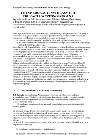 Załącznik do uchwały nr 8/2009/2010 SP Nr 3 im. Orła Białego I ETAP EDUKACYJNY: KLASY I-III EDUKACJA WCZESNOSZKOLNA Wg załącznika nr 2 do Rozporządzenia Ministra Edukacji Narodowej z dnia 23 grudnia 2008 r. w sprawie podstawy programowej wychowania przedszkolnego oraz kształcenia ogólnego w poszczególnych typach szkół Edukacja wczesnoszkolna ma stopniowo i możliwie łagodnie przeprowadzić dziecko z kształcenia zintegrowanego do nauczania przedmiotowego w klasach IV-VI szkoły podstawowej. Edukacja wczesnoszkolna opisana jest poprzez: 1) zestaw celów kształcenia i wynikających z nich ogólnych zadań szkoły; 2) wykaz wiadomości i umiejętności ucznia kończącego klasę I i ucznia kończącego klasę III szkoły podstawowej. Powodem wyodrębnienia klasy I szkoły podstawowej jest podkreślenie ciągłości procesu edukacji rozpoczętego w przedszkolu i kontynuowanego w szkole podstawowej. Chodzi też o uwzględnienie możliwości rozwojowych ucznia klasy I, a także o właściwe rozmieszczenie treści nauczania w ramach I etapu edukacyjnego. Edukacja wczesnoszkolna jest procesem rozłożonym na 3 lata nauki szkolnej. Oznacza to, że wiadomości i umiejętności zdobywane przez ucznia w klasie I będą powtarzane, pogłębiane i rozszerzane w klasie II i III. Zakres wiadomości i umiejętności, jakimi ma dysponować uczeń kończący klasę III szkoły podstawowej, ustalono tak, by nauczyciel mógł je zrealizować z uczniami o przeciętnych możliwościach. Jest to ważne założenie, gdyż wiadomości i umiejętności ukształtowane w klasach I-III szkoły podstawowej stanowią bazę i punkt wyjścia do nauki w klasach IV-VI szkoły podstawowej. W sprzyjających warunkach edukacyjnych można kształcenie zorganizować tak, by uczniowie w ciągu I etapu edukacyjnego nauczyli się znacznie więcej. Z drugiej strony, niektórym uczniom trzeba udzielić pomocy psychologiczno-pedagogicznej, żeby mogli sprostać wymaganiom określonym w podstawie programowej kształcenia ogólnego dla szkół podstawowych w zakresie I etapu edukacyjnego. I. Treści nauczania - klasa I szkoły podstawowej 1. Edukacja polonistyczna. Wspomaganie rozwoju umysłowego w zakresie wypowiadania się. Dbałość o kulturę języka. Początkowa nauka czytania i pisania. Kształtowanie umiejętności wypowiadania się w małych formach teatralnych. Uczeń kończący klasę I: 1) w zakresie umiejętności społecznych warunkujących porozumiewanie się i kulturę języka: a) obdarza uwagą dzieci i dorosłych, słucha ich wypowiedzi i chce zrozumieć, co przekazują; komunikuje w jasny sposób swoje spostrzeżenia, potrzeby, odczucia, b) w kulturalny sposób zwraca się do rozmówcy, mówi na temat, zadaje pytania i odpowiada na pytania innych osób, dostosowuje ton głosu do sytuacji, np. nie mówi zbyt głośno, c) uczestniczy w rozmowie na tematy związane z życiem rodzinnym i szkolnym, także inspirowane literaturą; 3) w zakresie umiejętności czytania i pisania: a) rozumie sens kodowania oraz dekodowania informacji; odczytuje uproszczone rysunki, piktogramy, znaki informacyjne i napisy, b) zna wszystkie litery alfabetu, czyta i rozumie proste, krótkie teksty, c) pisze proste, krótkie zdania: przepisuje, pisze z pamięci; dba o estetykę i poprawność graficzną pisma (przestrzega zasad kaligrafii), d) posługuje się ze zrozumieniem określeniami: wyraz, głoska, literą sylaba, zdanie, e) interesuje się książką i czytaniem; słucha w skupieniu czytanych utworów (np. baśni, opowiadań, wierszy), w miarę swoich możliwości czyta lektury wskazane przez nauczyciela f) korzysta z pakietów edukacyjnych (np. zeszytów ćwiczeń i innych pomocy dydaktycznych) pod kierunkiem nauczyciela; 4) w zakresie umiejętności wypowiadania się w małych formach teatralnych: a) uczestniczy w zabawie teatralnej, ilustruje mimiką gestem, ruchem zachowania bohatera literackiego lub wymyślonego, b) rozumie umowne znaczenie rekwizytu i umie posłużyć się nim w odgrywanej scence, c) odtwarza z pamięci teksty dla dzieci, np. wiersze, piosenki, fragmenty prozy. 2. Język obcy nowożytny. Wspomaganie dzieci w porozumiewaniu się z osobami, które mówią innym językiem. Uczeń kończący klasę I: 1) 2) 3) 4) rozumie proste polecenia i właściwie na nie reaguje; nazywa obiekty w najbliższym otoczeniu; recytuje wierszyki i rymowanki, śpiewa piosenki z repertuaru dziecięcego; rozumie sens opowiedzianych historyjek, gdy są wspierane obrazkami, gestami, przedmiotami. 3. Edukacja muzyczna. Wychowanie do odbioru i tworzenia muzyki: śpiewanie i muzykowanie, słuchanie i rozumienie. Uczeń kończący klasę I: 1) powtarza prostą melodię; śpiewa piosenki z repertuaru dziecięcego, wykonuje śpiewanki i rymowanki; 2) odtwarza proste rytmy głosem i na instrumentach perkusyjnych; wyraża nastrój i charakter muzyki pląsając i tańcząc (reaguje na zmianę tempa i dynamiki); 3) realizuje proste schematy rytmiczne (tataizacją, ruchem całego ciała); 4) wie, że muzykę można zapisać i odczytać; 5) świadomie i aktywnie słucha muzyki, potem wyraża swe doznania werbalnie i niewerbalnie; 6) kulturalnie zachowuje się na koncercie oraz w trakcie śpiewania hymnu narodowego. 4. Edukacja plastyczna. Poznawanie architektury, malarstwa i rzeźby. Wyrażanie własnych myśli i uczuć w różnorodnych formach plastycznych. Przygotowanie do korzystania z medialnych środków przekazu. Uczeń kończący klasę I: 1) wypowiada się w wybranych technikach plastycznych na płaszczyźnie i w przestrzeni; posługuje się takimi środkami wyrazu plastycznego, jak: kształt, barwa, faktura; 2) ilustruje sceny i sytuacje (realne i fantastyczne) inspirowane wyobraźnią baśnią opowiadaniem, muzyką korzysta z narzędzi multimedialnych; 3) wykonuje proste rekwizyty (np. lalkę, pacynkę) i wykorzystuje je w małych formach teatralnych; tworzy przedmioty charakterystyczne dla sztuki ludowej regionu, w którym mieszk