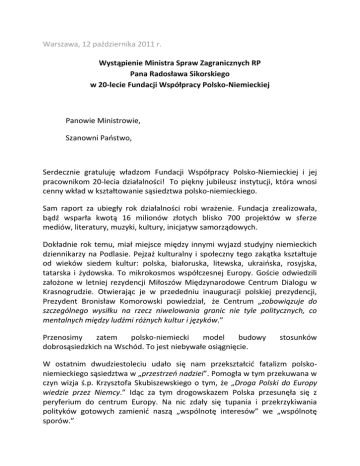 Warszawa, 12 października 2011 r. Wystąpienie Ministra Spraw Zagranicznych RP Pana Radosława Sikorskiego w 20-lecie Fundacji Współpracy Polsko-Niemieckiej Panowie Ministrowie, Szanowni Państwo, Serdecznie gratuluję władzom Fundacji Współpracy Polsko-Niemieckiej i jej pracownikom 20-lecia działalności! To piękny jubileusz instytucji, która wnosi cenny wkład w kształtowanie sąsiedztwa polsko-niemieckiego. Sam raport za ubiegły rok działalności robi wrażenie. Fundacja zrealizowała, bądź wsparła kwotą 16 milionów złotych blisko 700 projektów w sferze mediów, literatury, muzyki, kultury, inicjatyw samorządowych. Dokładnie rok temu, miał miejsce między innymi wyjazd studyjny niemieckich dziennikarzy na Podlasie. Pejzaż kulturalny i społeczny tego zakątka kształtuje od wieków siedem kultur: polska, białoruska, litewska, ukraińska, rosyjska, tatarska i żydowska. To mikrokosmos współczesnej Europy. Goście odwiedzili założone w letniej rezydencji Miłoszów Międzynarodowe Centrum Dialogu w Krasnogrudzie. Otwierając je w przededniu inauguracji polskiej prezydencji, Prezydent Bronisław Komorowski powiedział, że Centrum „zobowiązuje do szczególnego wysiłku na rzecz niwelowania granic nie tyle politycznych, co mentalnych między ludźmi różnych kultur i języków.” Przenosimy zatem polsko-niemiecki model budowy dobrosąsiedzkich na Wschód. To jest niebywałe osiągnięcie. stosunków W ostatnim dwudziestoleciu udało się nam przekształcić fatalizm polskoniemieckiego sąsiedztwa w „przestrzeń nadziei”. Pomogła w tym przekuwana w czyn wizja ś.p. Krzysztofa Skubiszewskiego o tym, że „Droga Polski do Europy wiedzie przez Niemcy.” Idąc za tym drogowskazem Polska przesunęła się z peryferium do centrum Europy. Na nic zdały się tupania i przekrzykiwania polityków gotowych zamienić naszą „wspólnotę interesów” we „wspólnotę sporów.” Dziś Polskę i Niemcy łączy bezprecedensowa współpraca partnerska. 58% Polaków życzy sobie ścisłych związków z Niemcami. Niemcy są najważniejszym partnerem handlowym Polski, zaś Polska jest kluczowa dla Niemiec w wymianie handlowej z Europą Środkowo-Wschodnią. Mamy 600 związków partnerskich miast polskich i niemieckich. 8,5 tysiąca studentów z Polski studiuje na uczelniach w Niemczech, a Niemców w Polsce – tutaj mamy sporo do nadrobienia – niespełna 600. Aż 7,000 niemieckich podmiotów zainwestowało około 25 miliardów EURO w Polsce; polskie firmy ulokowały ponad miliard EURO w Niemczech. Ale cieszy fakt, iż tym półroczu odnotowaliśmy rekordową wielkość polskich inwestycji za Odrą – 600 milionów EURO. Łączy nas współodpowiedzialność za losy Europy. Kanclerz Angela Merkel wzywa Niemcy i Polskę, aby „naszą współpracę na polu polityki europejskiej uczynić jeszcze bardziej intensywną,” zwłaszcza kiedy Europa przeżywa „kryzys egzystencjalny.” Niecałe dwa tygodnie temu jako prezydencja Unii gościliśmy szczyt Partnerstwa Wschodniego. Dołożyliśmy kolejną cegiełkę do realizacji projektu europejskiego. Przyjęliśmy deklarację potwierdzającą wolę dalszego pogłębiania integracji Unii Europejskiej i jej sześciu partnerów w Europie Wschodniej. Do końca roku powinniśmy zakończyć negocjacje umowy stowarzyszeniowej z Ukrainą i rozpoczniemy je z Mołdawią i Gruzją. Jeśli państwa te spełnią określone warunki, zniesiemy obowiązek wizowy. Wspólnie potępiliśmy Białoruś za pogwałcenie podstawowych wolności, ale jednocześnie przyznaliśmy jej jasną perspektywę współpracy i szczodrej pomocy, gdy reżim wypuści z więzień działaczy demokratycznych i wkroczy na drogę przemian. Przed nami uzdrowienie strefy euro. Musimy doprowadzić do porządku finanse publiczne, aby uniknąć kolejnych perturbacji; kontynuować gruntowne reformy zarządzania gospodarczego; stymulować wzrost gospodarczy; i poprzez te kroki, odbudować zaufanie obywateli. Chcemy dalej razem budować Europę. Uzgodnione w 20-tą rocznicę Traktatu polsko-niemieckiego dokumenty rocznicowe zobowiązują nas do podjęcia kolejnego kroku - „Partnerstwa dla Europy.” Niemcy, promotor rozwiązań w obecnym kryzysie projektu integracyjnego, znajdują w Polsce partnera w działaniach zmierzających do przezwyciężenia trudności. To dzięki Niemcom przeforsowano Pakt Euro Plus, który pozwala Polsce uczestniczyć w istotnych debatach o przyszłości Unii. Niemcy, lider strefy euro, i Polska, choć na razie poza strefą to jednak spokojna wyspa na burzliwym morzu gospodarki europejskiej, stanowią silną oś polityczną Europy. Zawsze dobrze wychodziliśmy stawiając na otwartość i solidarność. W momencie próby, jak dziś, zobowiązani jesteśmy podtrzymywać te wartości i przeciwdziałać populistycznym pomysłom, za którymi nie kryje się interes wspólnotowy, lecz egoistyczny protekcjonizm. My tę lekcję już kiedyś przerabialiśmy. Zaprowadziła nas ona tylko na manowce. W tych trudnych czasach widzę ważną rolę do spełnienia przez Fundację. Chodzi o współtworzenie narracji w stosunkach polsko-niemieckich i wychodzenie z nią na forum unijne. Na Europejskim Kongresie Kultury we Wrocławiu Zygmunt Bauman powiedział, że „losy politycznej jedności Europy” zależą „w dużym stopniu od rozwoju kultury europejskiej.” Dlatego też cieszę się, że w Berlinie trwa wystawa o tysiącleciu polsko-niemieckiego sąsiedztwa. Dołożymy także starań, aby zakończyć projekt wspólnego podręcznika historii. Musimy również jak najszybciej zrealizować zobowiązania ujęte we Wspólnym Oświadczeniu Okrągłego Stołu w sprawach niemieckiej Polonii i mniejszości niemieckiej w Polsce. Nie tak dawno miałem przyjemność odwiedzić wspólnie z moim przyjacielem Guido Westerwelle instalację „Przez Warszawę ku Wolności.” Przypomina historię 6 tysięcy uchodźców z NRD, którzy jesienią 1989 roku, dzięki solidarno